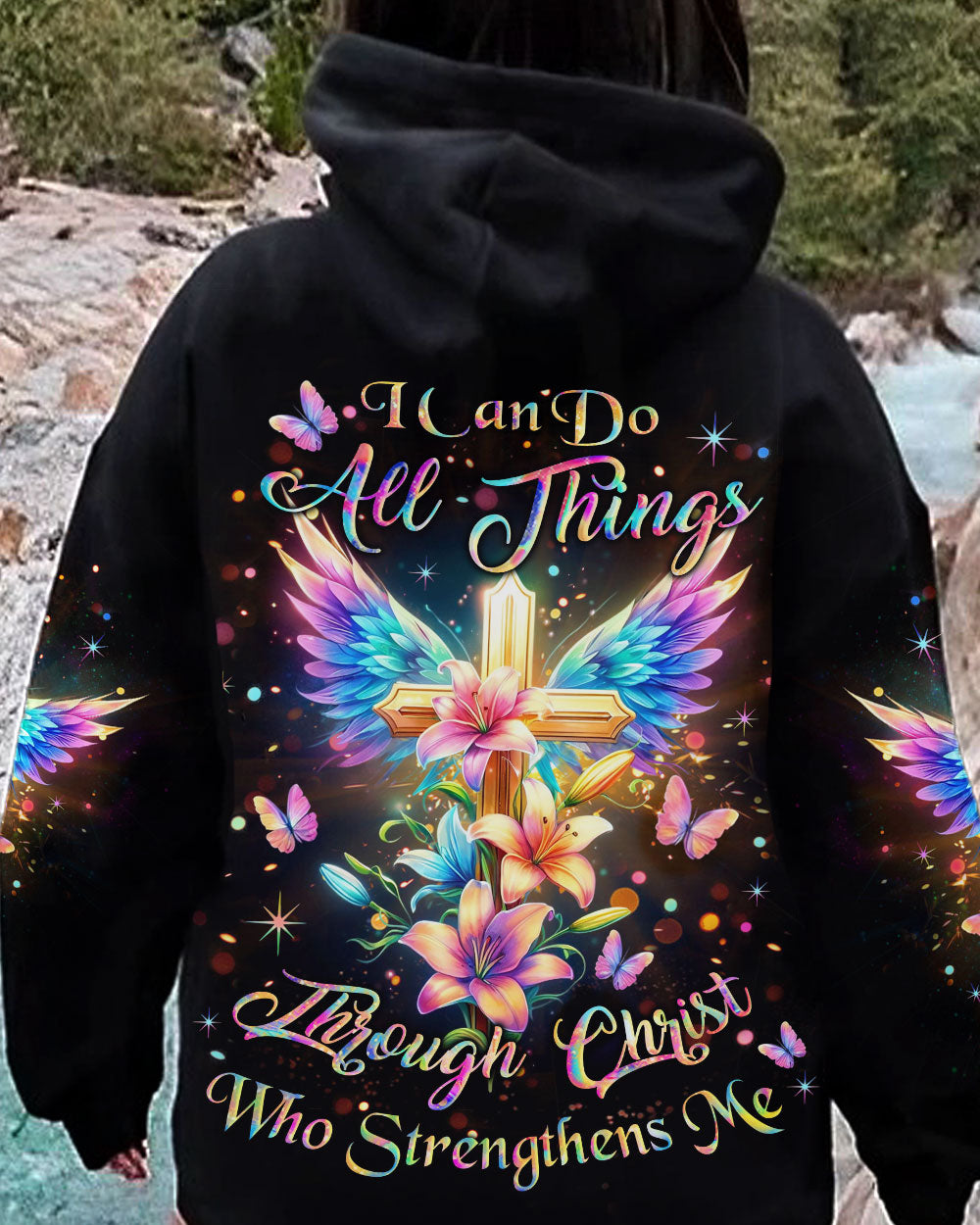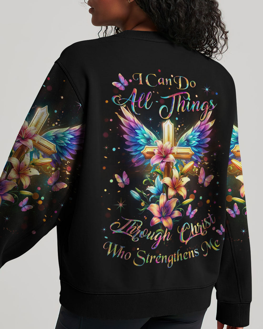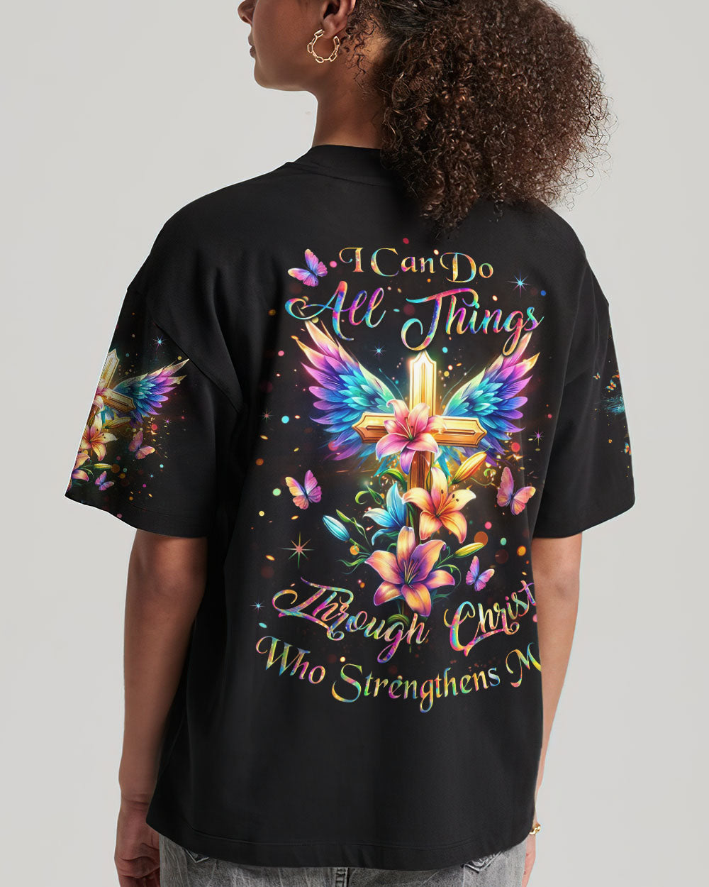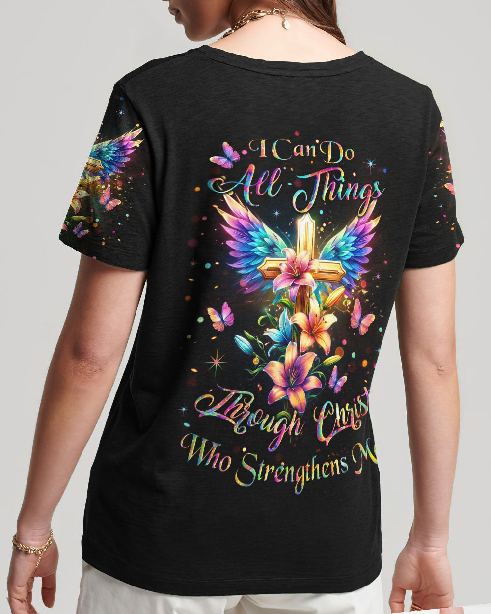 Celebrate your faith with this beautifully designed women's all-over print shirt. Featuring a radiant cross adorned with celestial wings, lily flowers, and butterflies, it's a powerful reminder of spiritual strength and grace. Making this design even more meaningful is the meaningful quote, "I can do all things through Christ who strengthens me," that will uplift and empower you wherever you go.