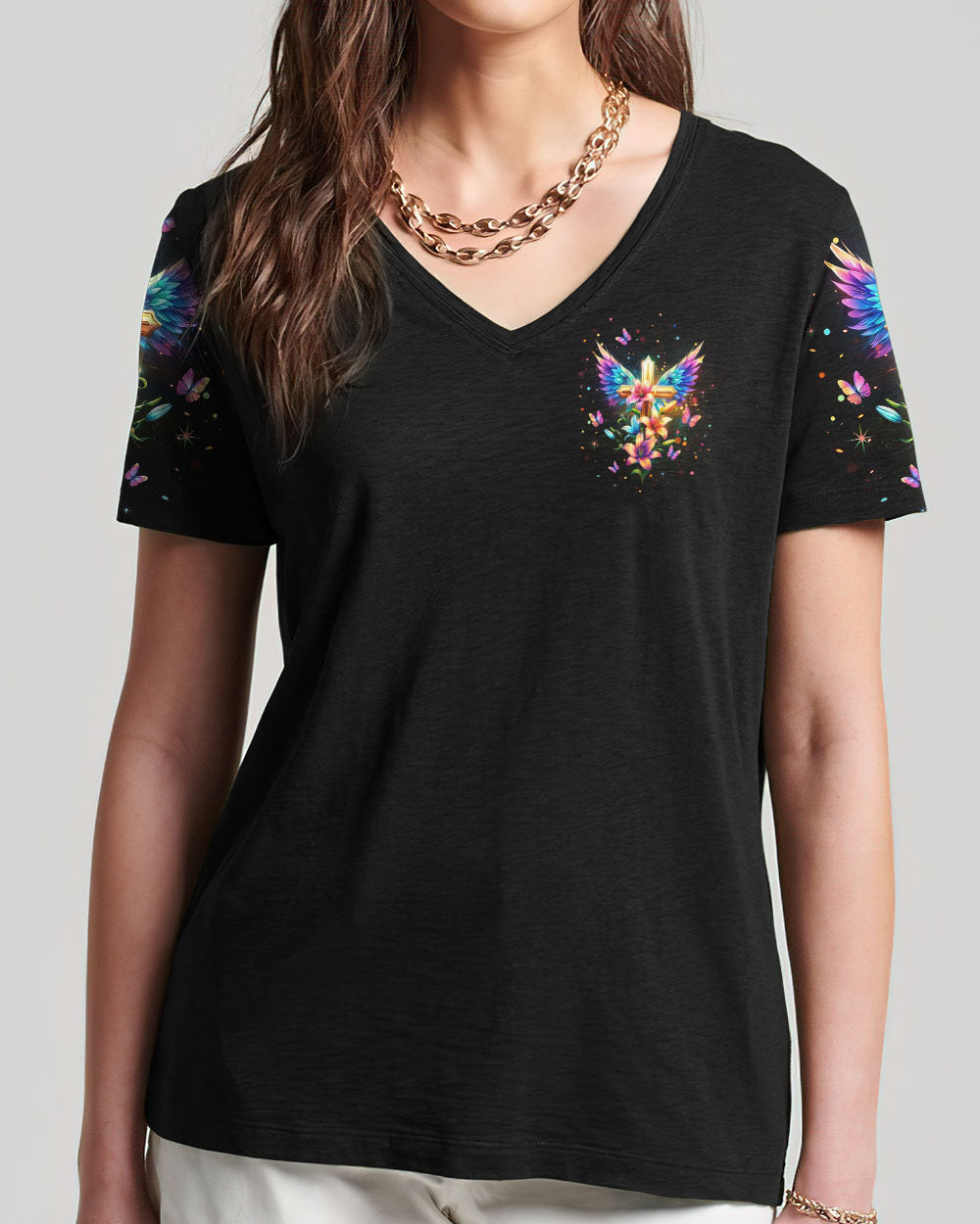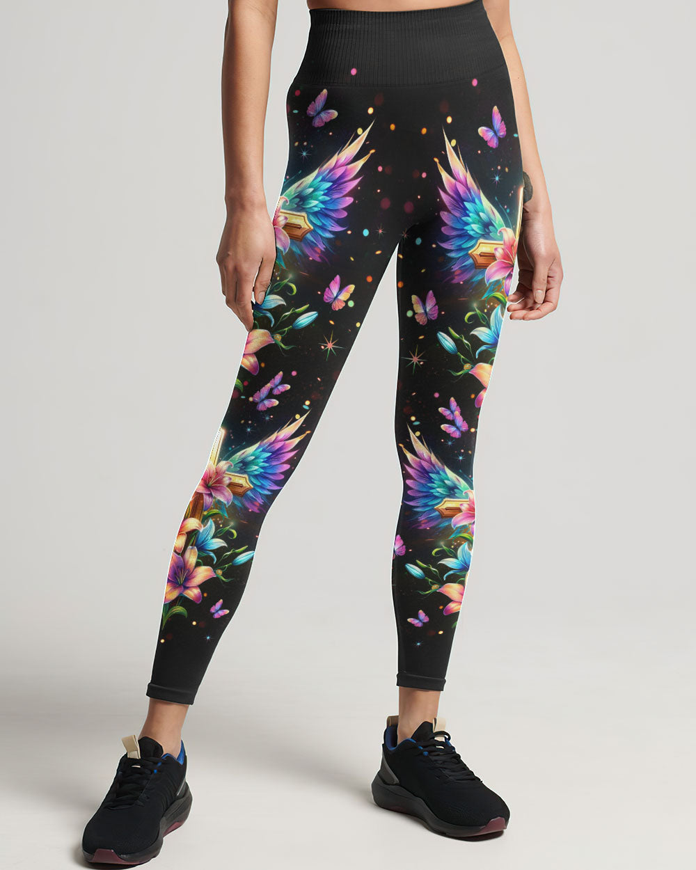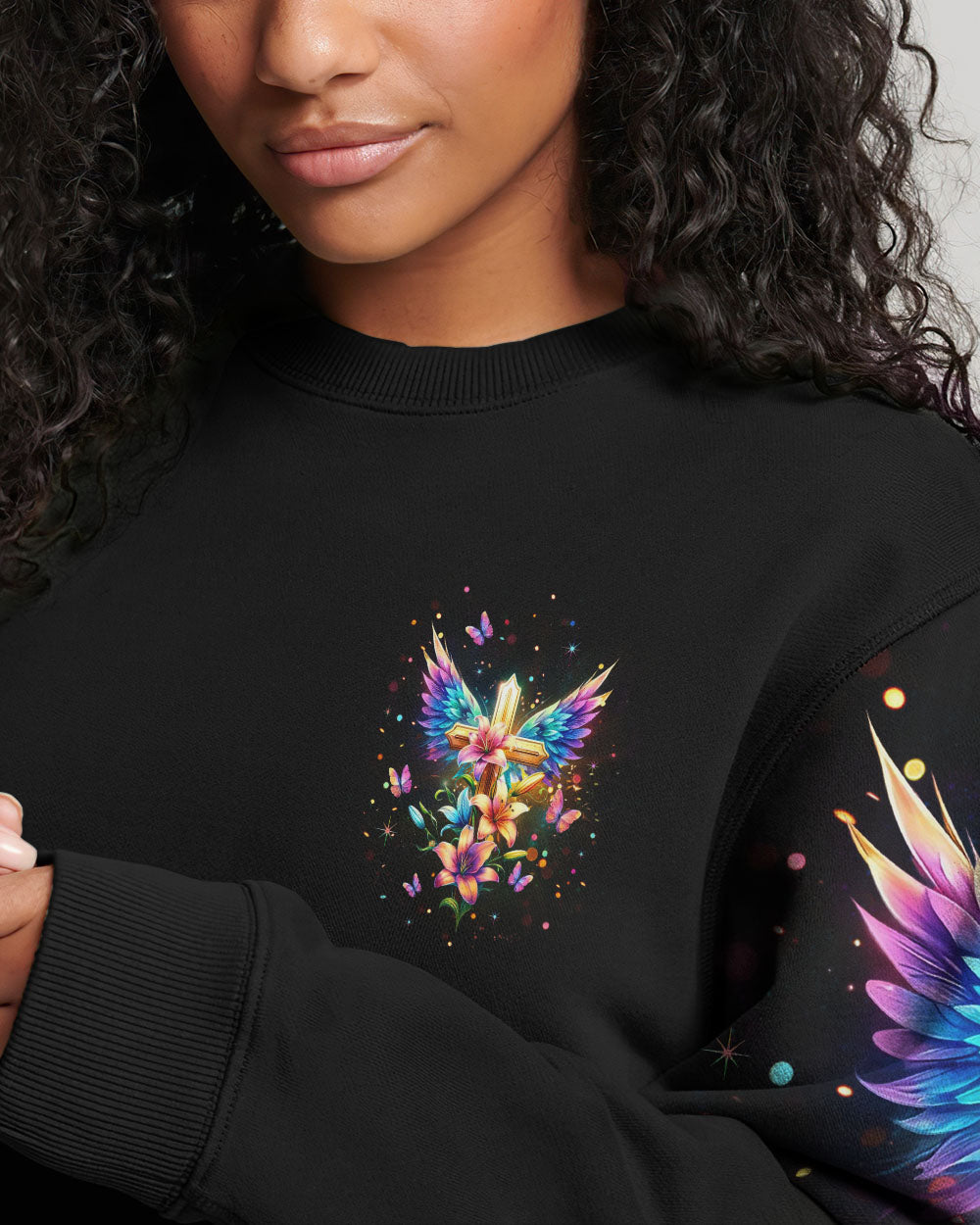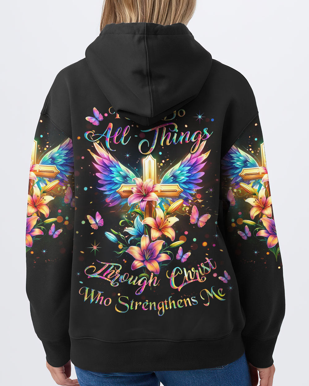 Celebrate your faith with this beautifully designed women's all-over print shirt. Featuring a radiant cross adorned with celestial wings, lily flowers, and butterflies, it's a powerful reminder of spiritual strength and grace. Making this design even more meaningful is the meaningful quote, "I can do all things through Christ who strengthens me," that will uplift and empower you wherever you go.