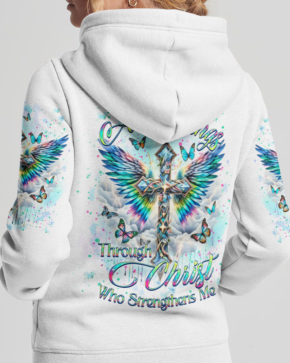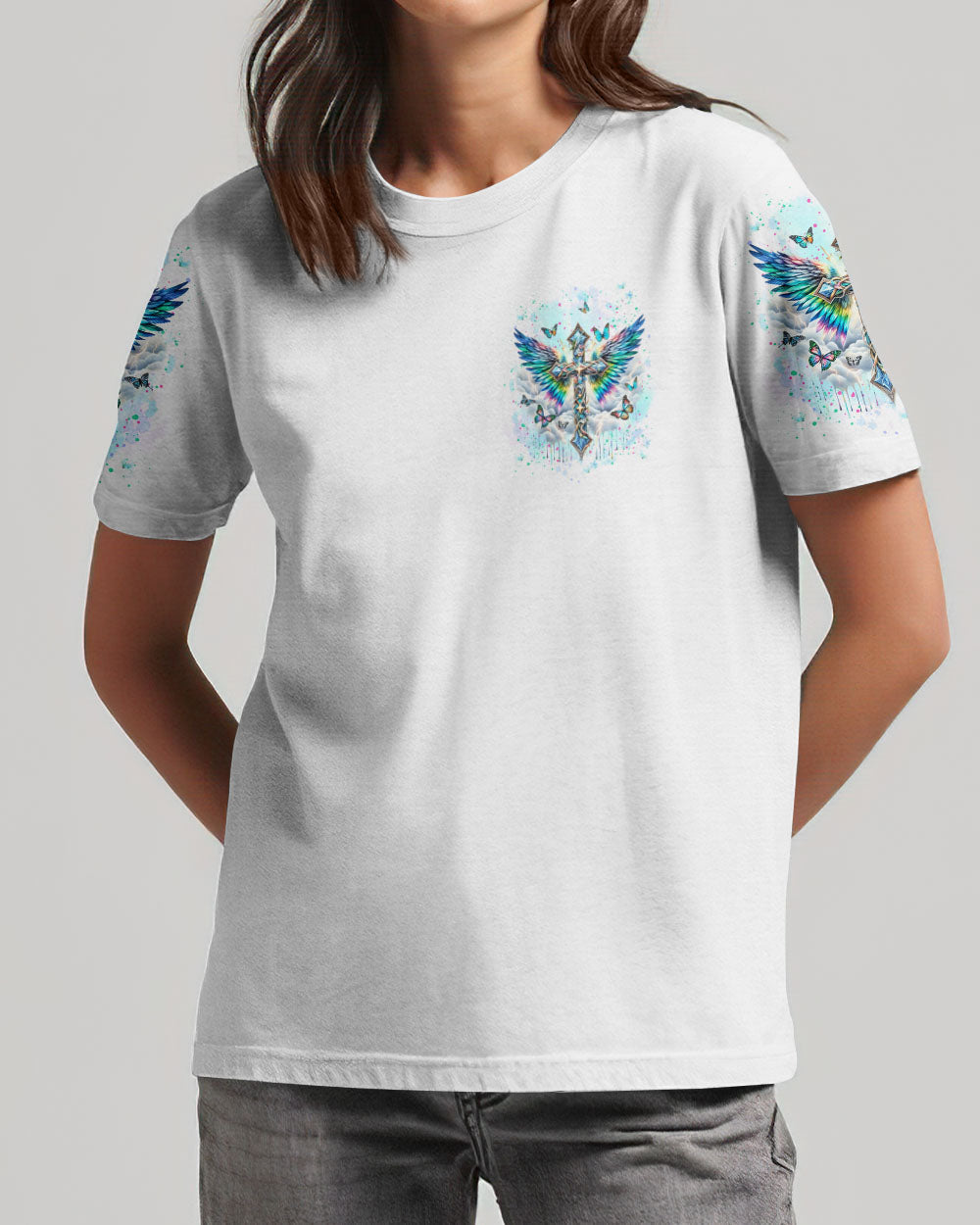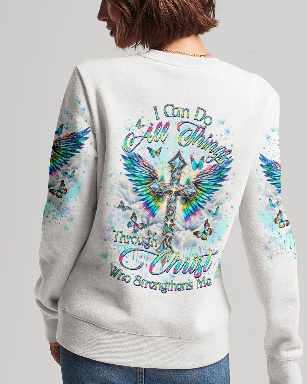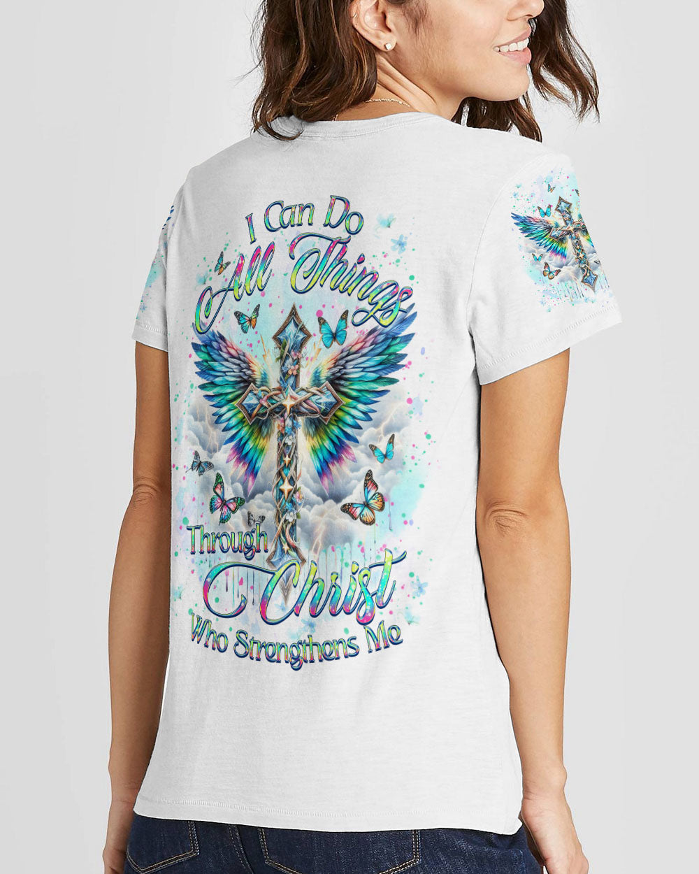 Embrace your spiritual side with our Faith Christ Design Women's All Over Print Shirt. Featuring a luminous cross, ethereal wings, and graceful butterflies, this garment serves as a testament to unwavering faith. With the empowering quote, "I can do all things through Christ who strengthens me," this shirt illuminates not just your style, but your inner strength as well. Order now and elevate your fashion to new heights.