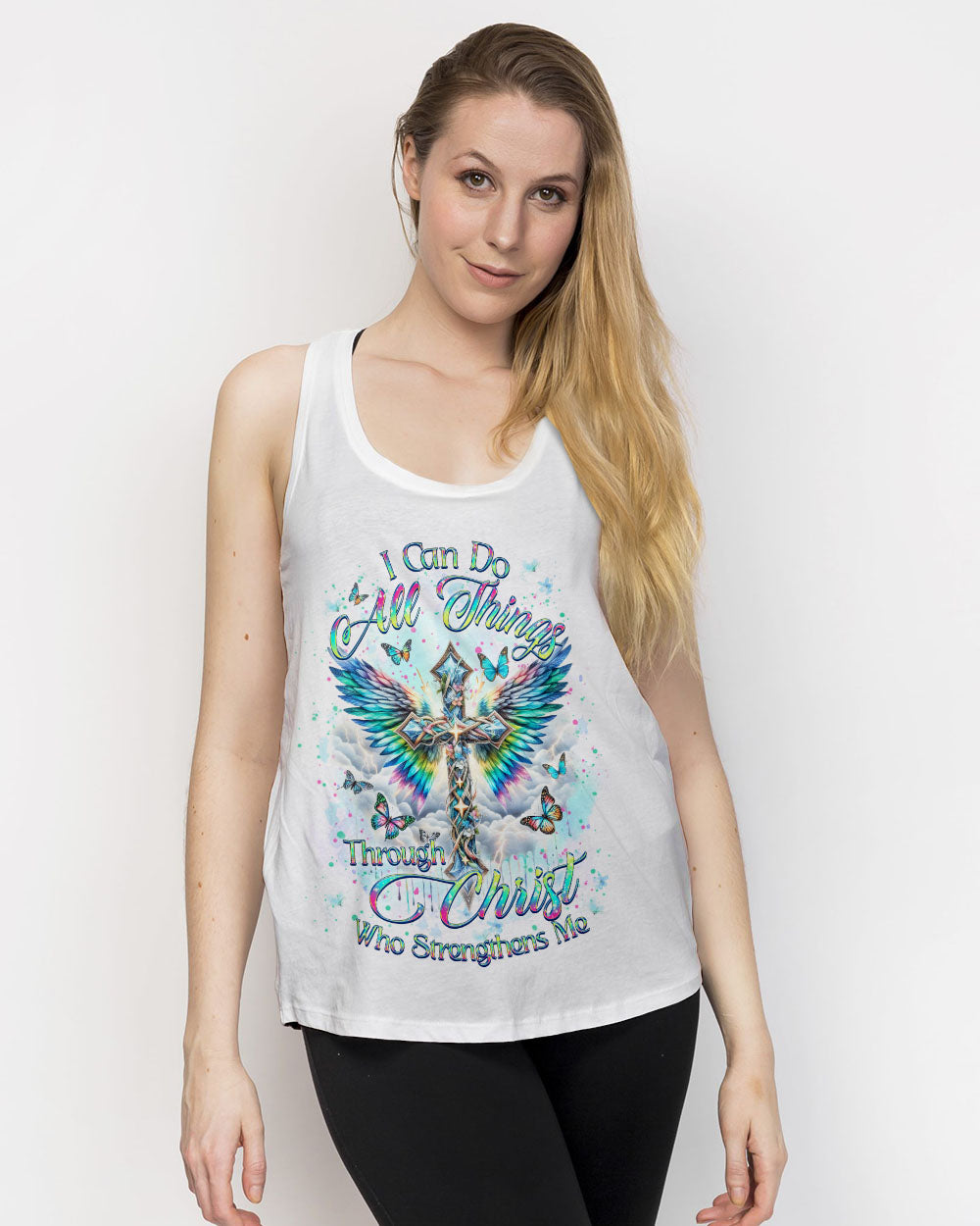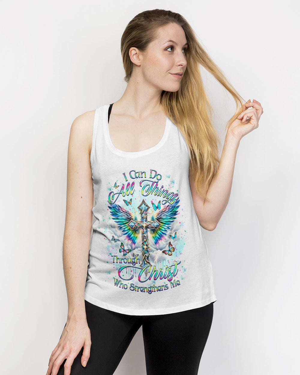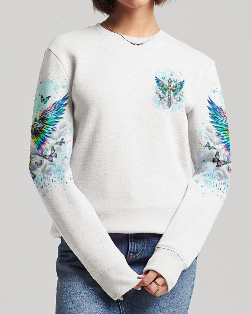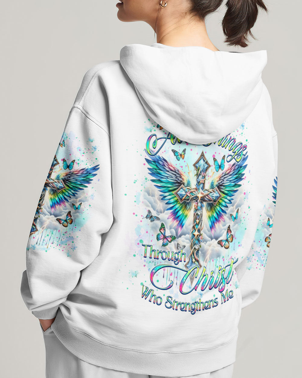 Embrace your spiritual side with our Faith Christ Design Women's All Over Print Shirt. Featuring a luminous cross, ethereal wings, and graceful butterflies, this garment serves as a testament to unwavering faith. With the empowering quote, "I can do all things through Christ who strengthens me," this shirt illuminates not just your style, but your inner strength as well. Order now and elevate your fashion to new heights.