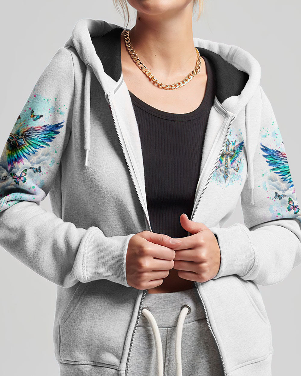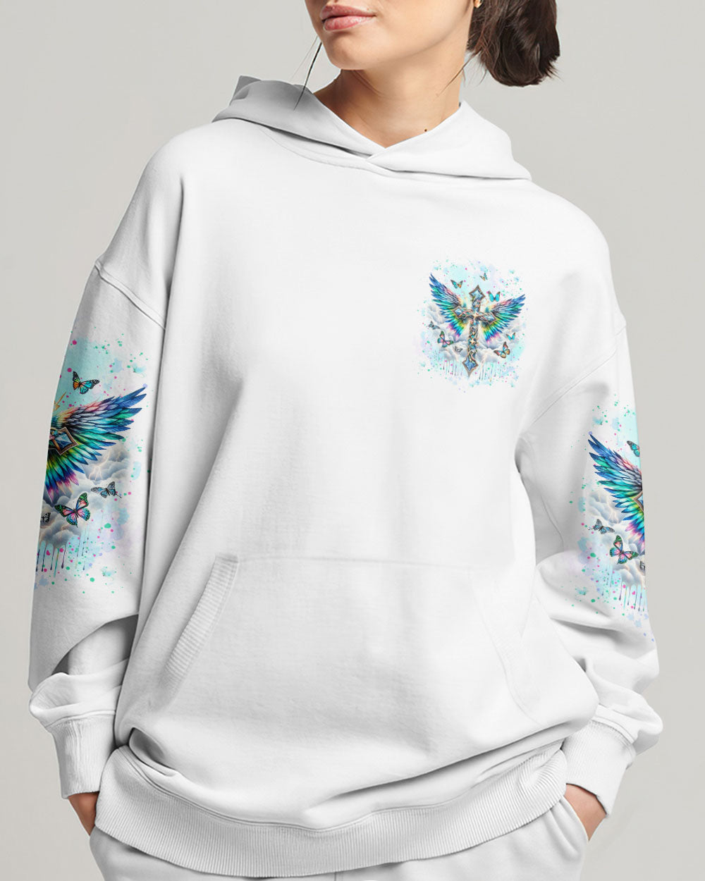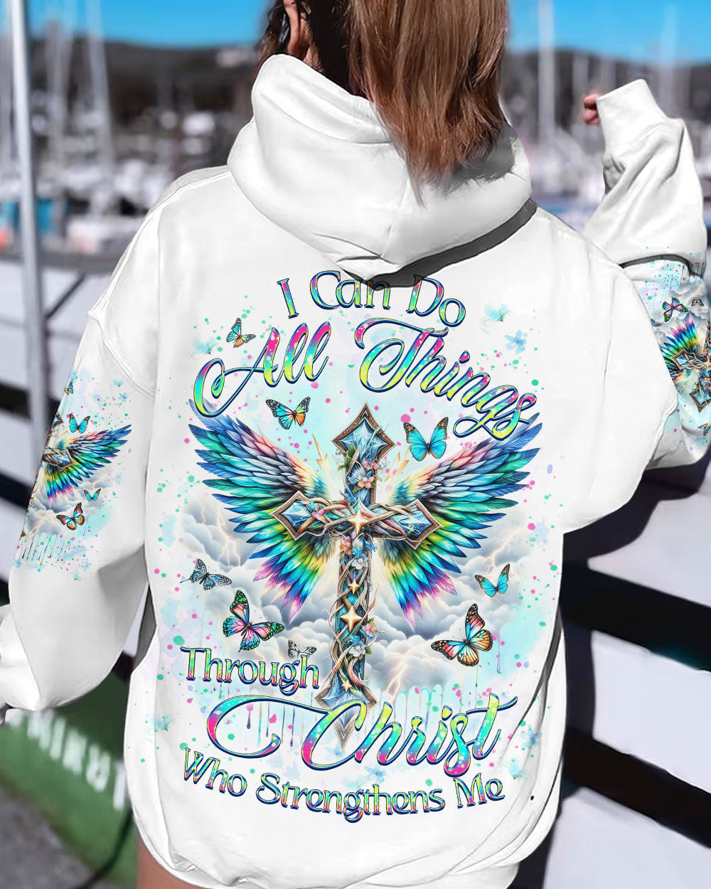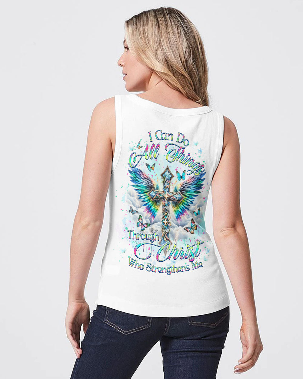 Embrace your spiritual side with our Faith Christ Design Women's All Over Print Shirt. Featuring a luminous cross, ethereal wings, and graceful butterflies, this garment serves as a testament to unwavering faith. With the empowering quote, "I can do all things through Christ who strengthens me," this shirt illuminates not just your style, but your inner strength as well. Order now and elevate your fashion to new heights.