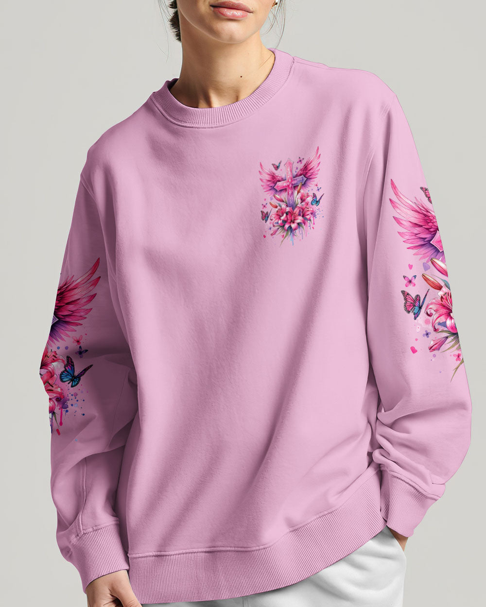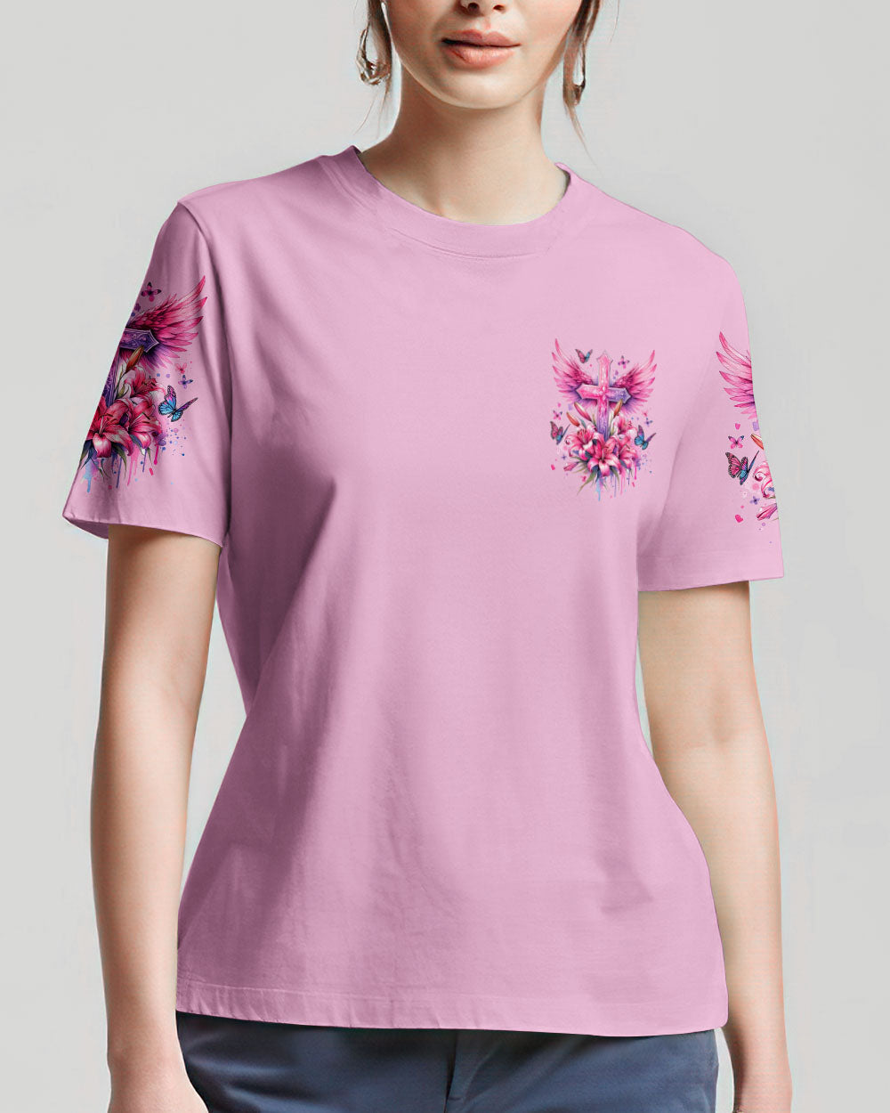 Embark on a spiritual journey with our I Fight My Battles Cross Women's All Over Print Shirt, featuring a divine Cross surrounded by wings, lilies and butterflies, plus an impactful quote to inspire you. Let faith guide you as you navigate life’s challenges and find strength through redemption, freedom, resurrection and transformation.