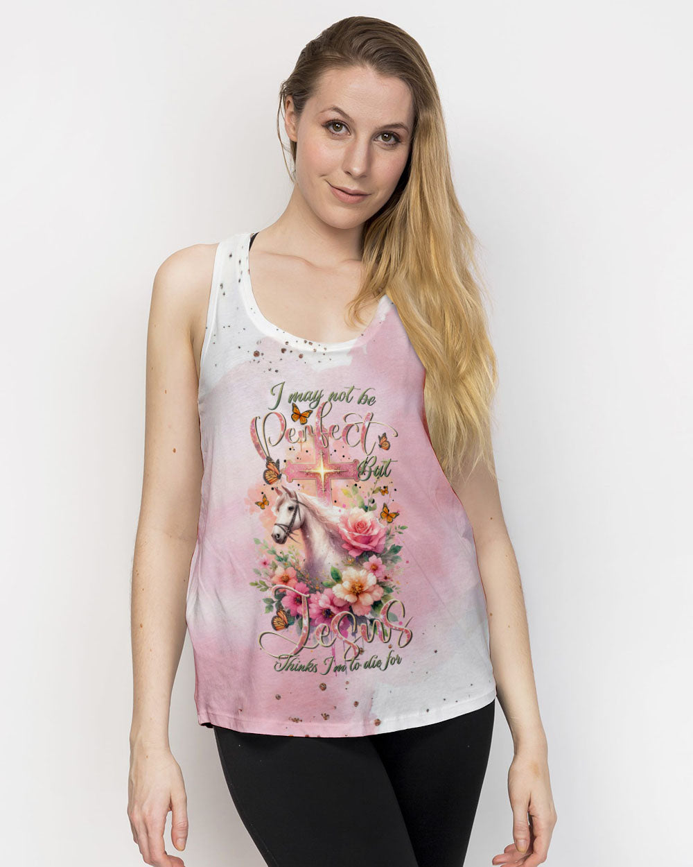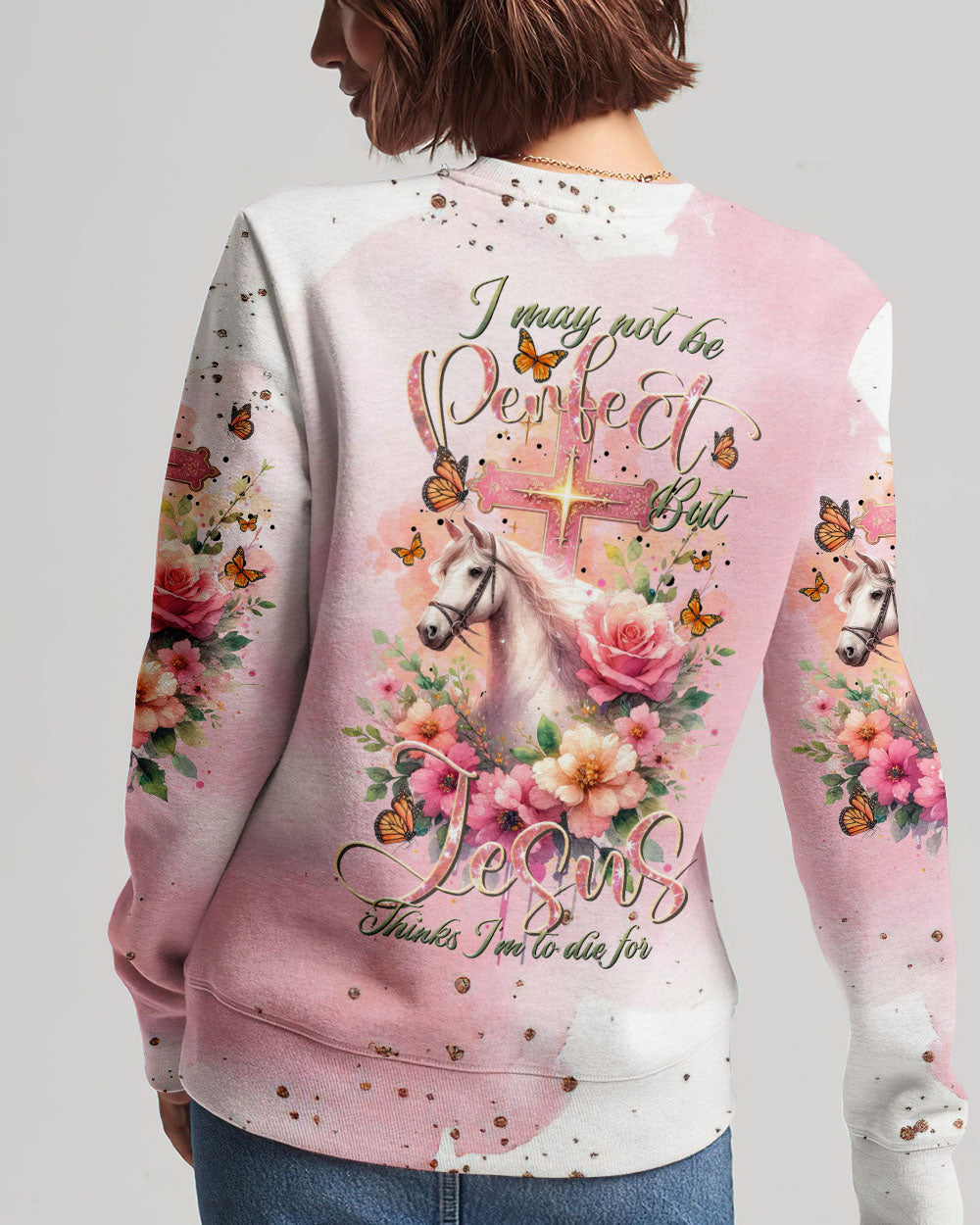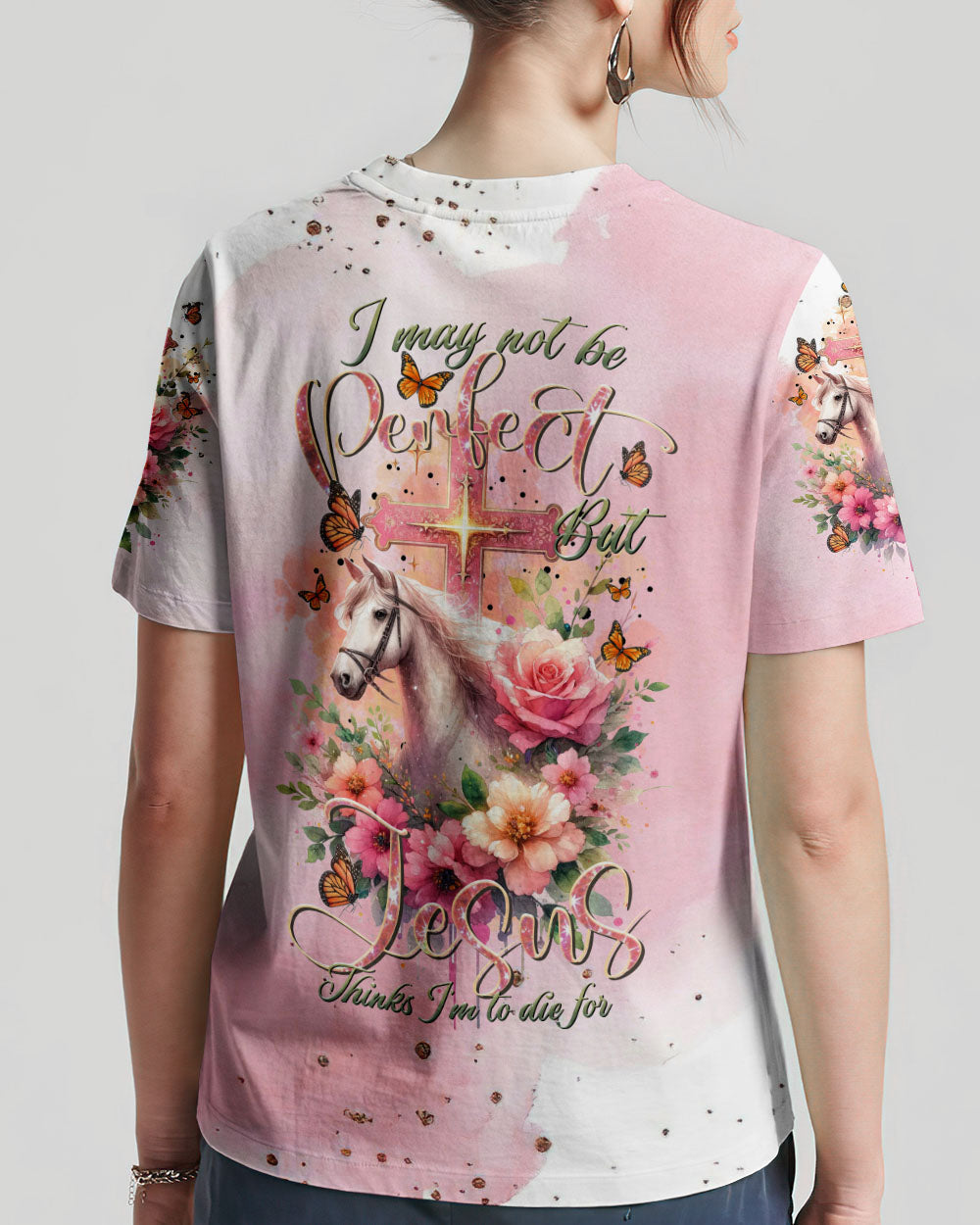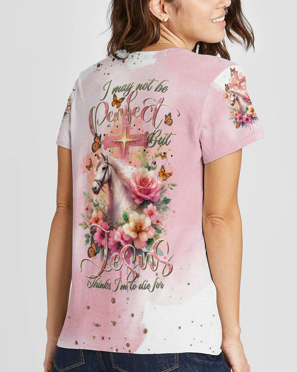 Our design artfully merges a symbolic cross, blooming flowers, and a horse in gentle pink tones, embodying faith and nature's beauty. It embodies the saying, 'I May Not Be Perfect But Jesus Thinks I'm To Die For,' emphasizing unconditional love and forgiveness in Christian belief, reminding us of our cherished value in Jesus' eyes