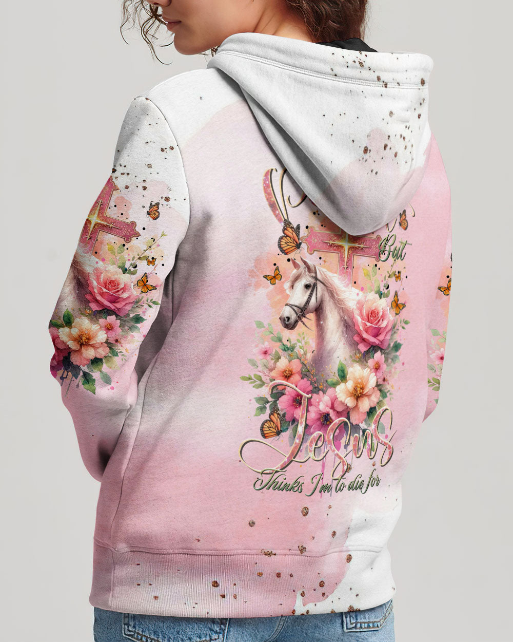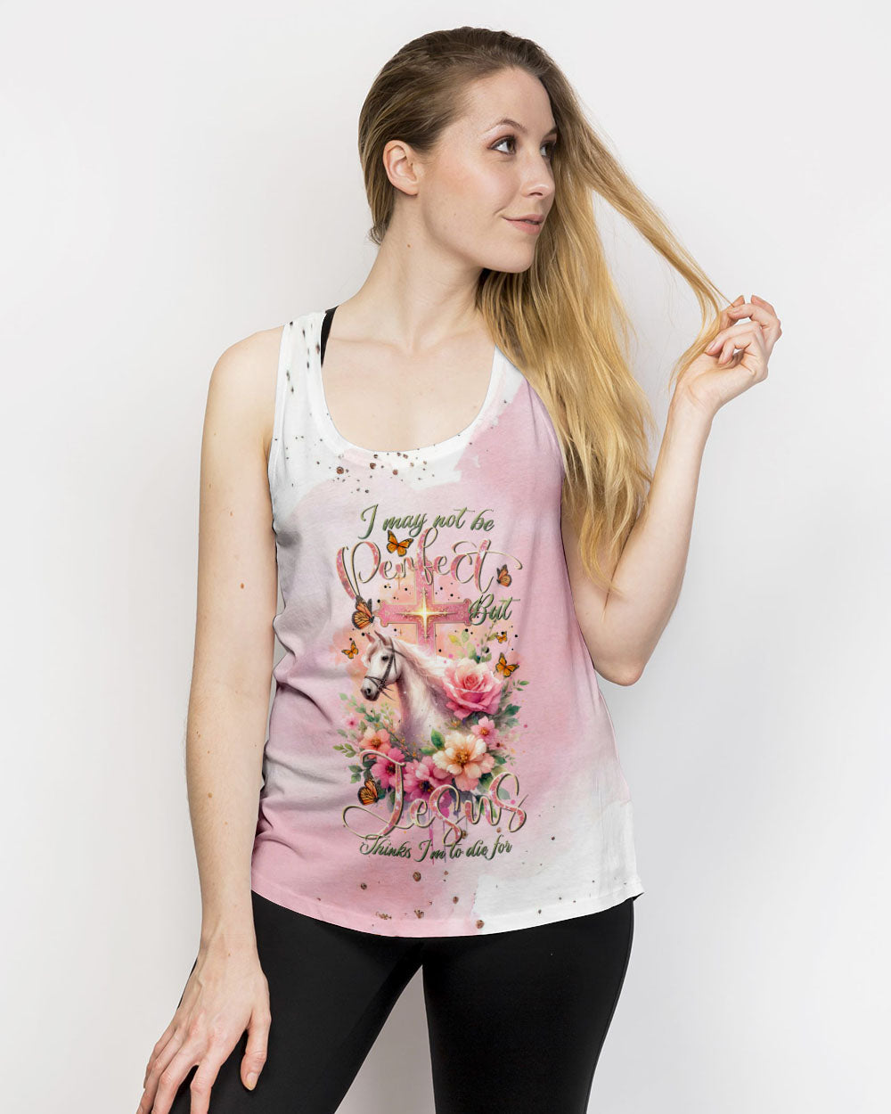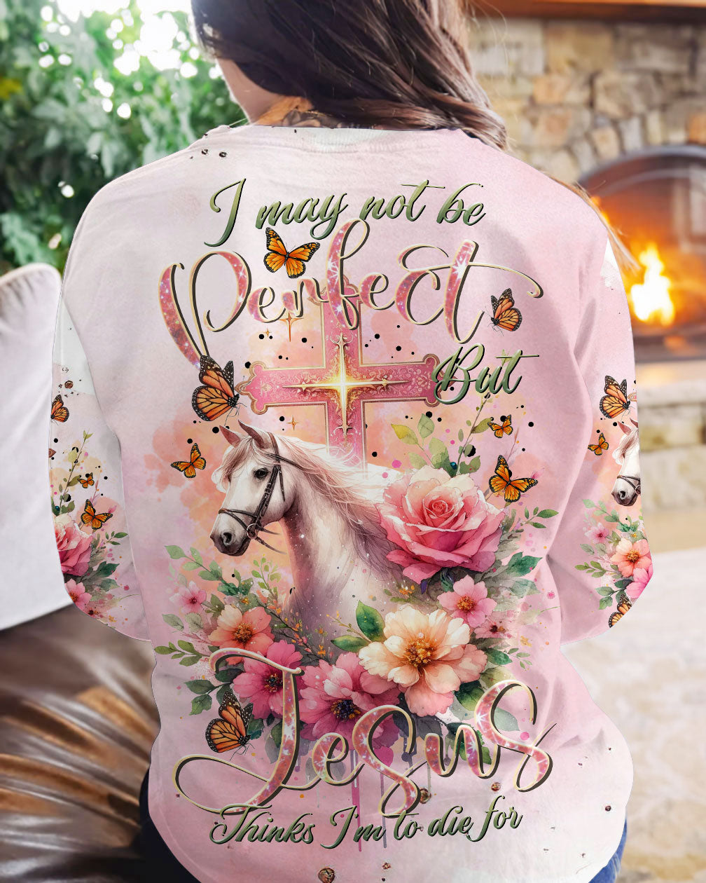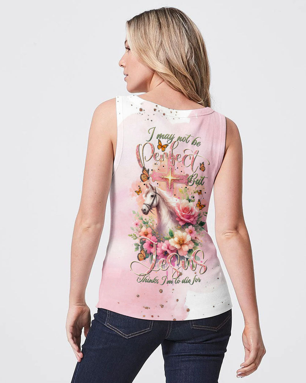 Our design artfully merges a symbolic cross, blooming flowers, and a horse in gentle pink tones, embodying faith and nature's beauty. It embodies the saying, 'I May Not Be Perfect But Jesus Thinks I'm To Die For,' emphasizing unconditional love and forgiveness in Christian belief, reminding us of our cherished value in Jesus' eyes