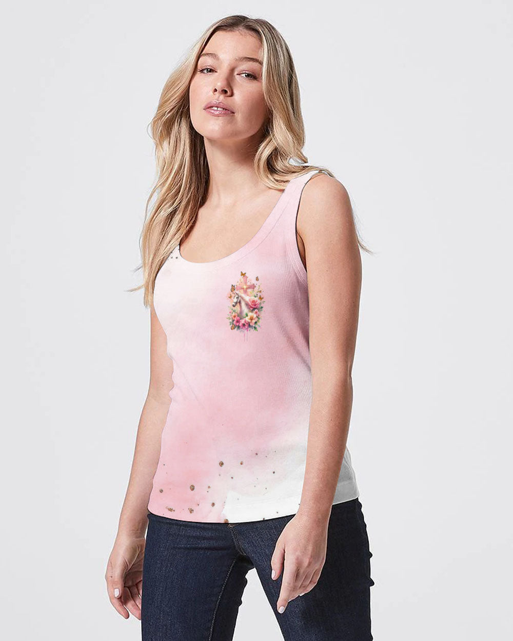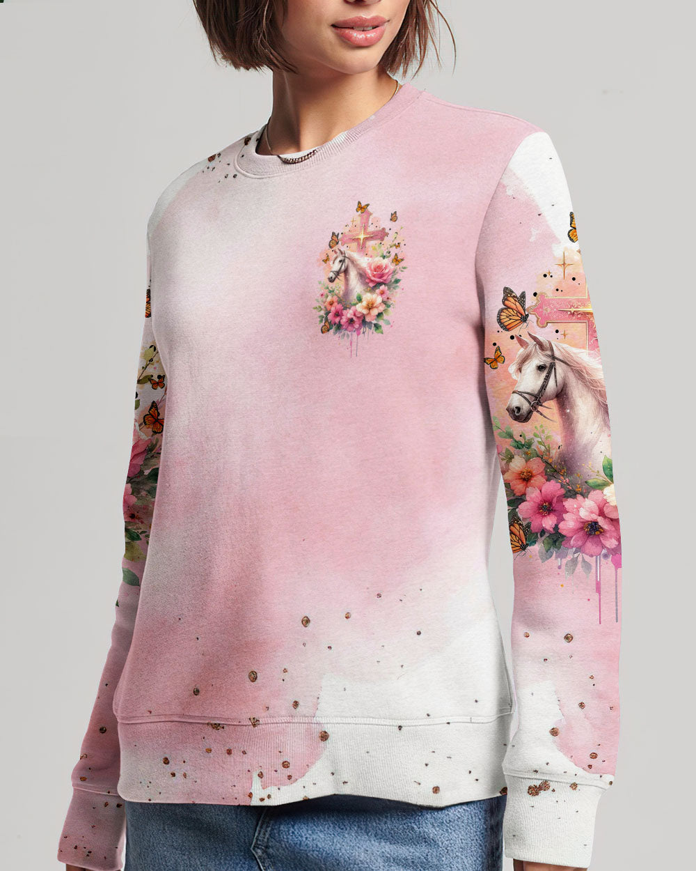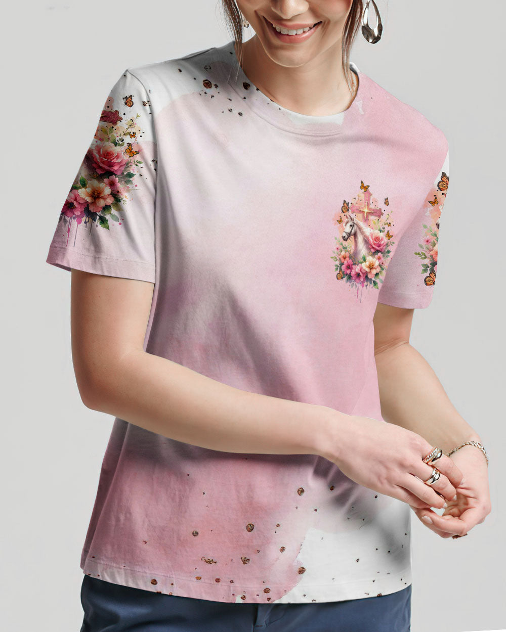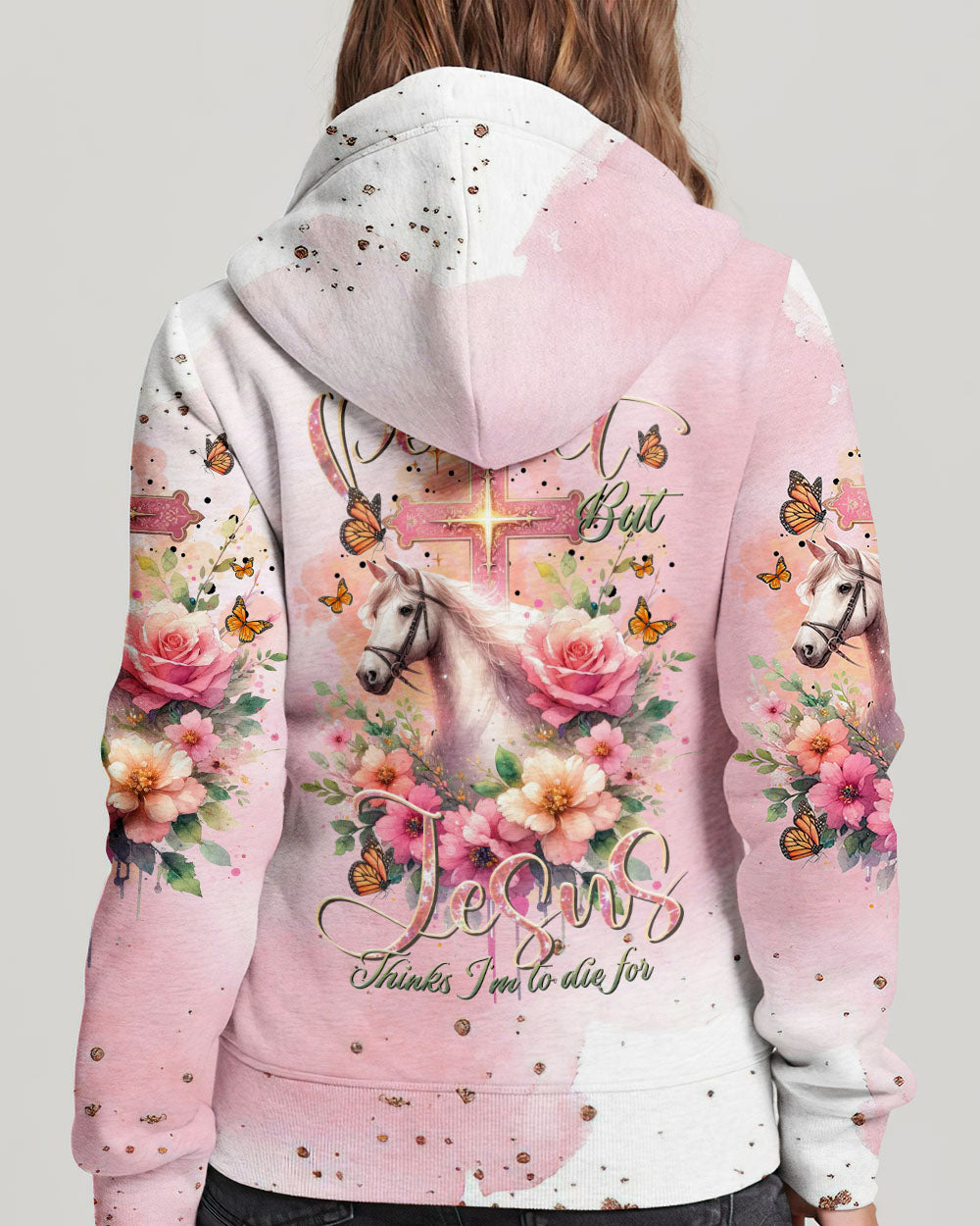 Our design artfully merges a symbolic cross, blooming flowers, and a horse in gentle pink tones, embodying faith and nature's beauty. It embodies the saying, 'I May Not Be Perfect But Jesus Thinks I'm To Die For,' emphasizing unconditional love and forgiveness in Christian belief, reminding us of our cherished value in Jesus' eyes
