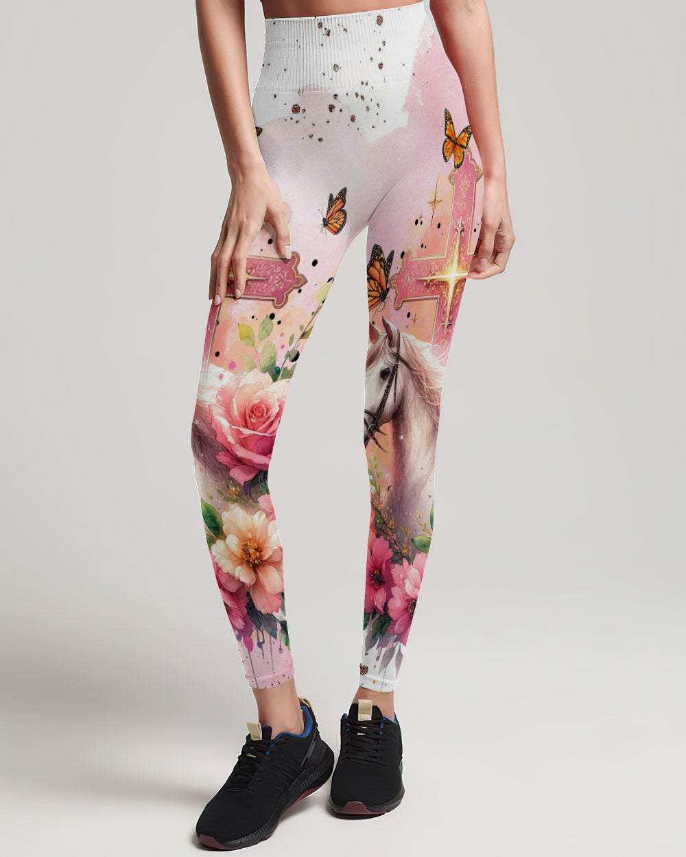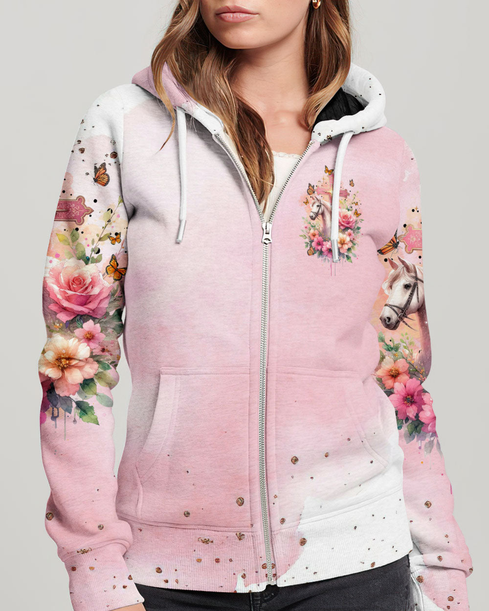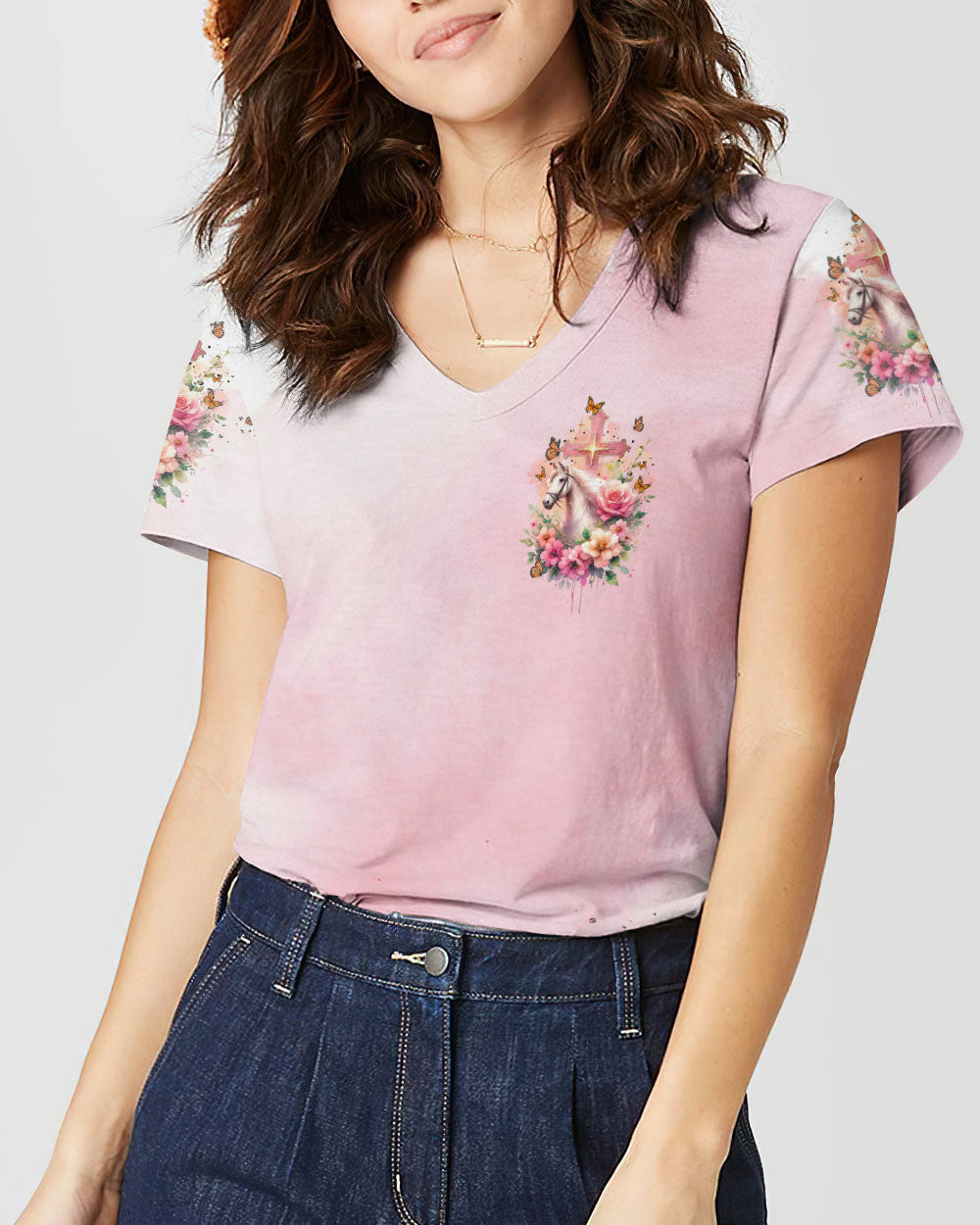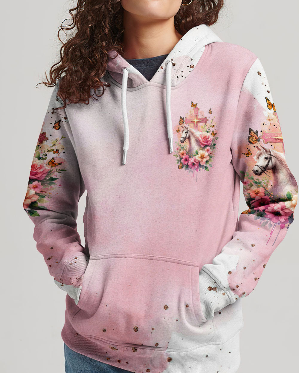 Our design artfully merges a symbolic cross, blooming flowers, and a horse in gentle pink tones, embodying faith and nature's beauty. It embodies the saying, 'I May Not Be Perfect But Jesus Thinks I'm To Die For,' emphasizing unconditional love and forgiveness in Christian belief, reminding us of our cherished value in Jesus' eyes