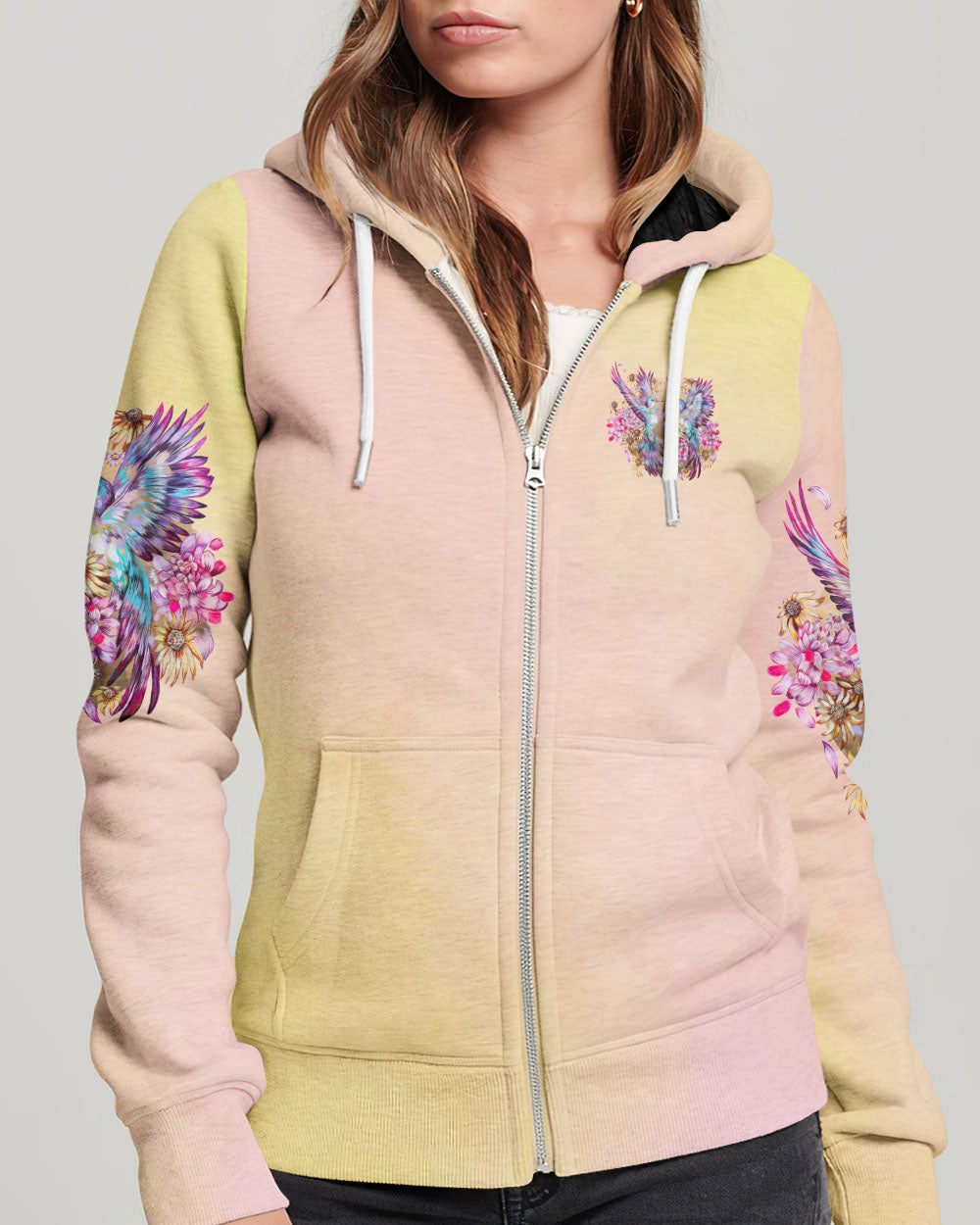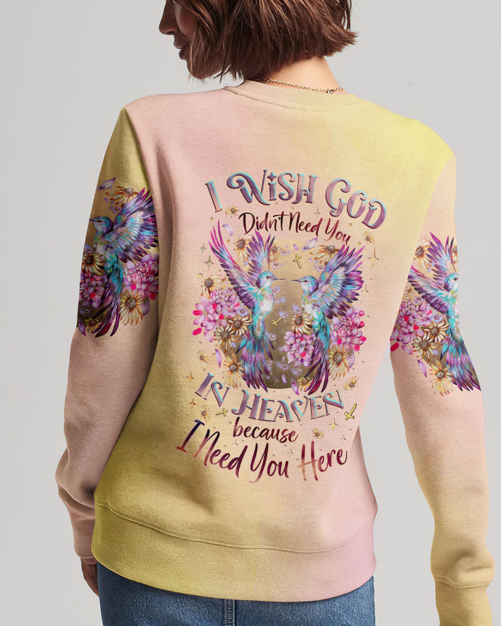 Make a bold statement in this stylish I Need You Here All-Over Print Shirt for women. Intricately designed with a beautiful hummingbird - a symbol of faith and love - this shirt carries the tender message, "I wish God didn't need you in Heaven because I need you here" as a reminder of the enduring connections of love and faith. This timeless design is sure to turn heads and express your profound longing.