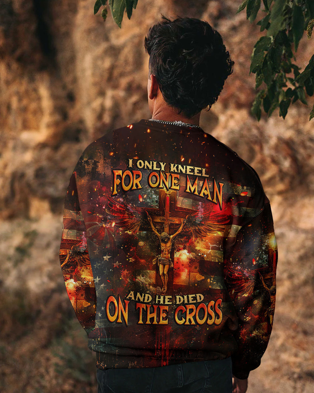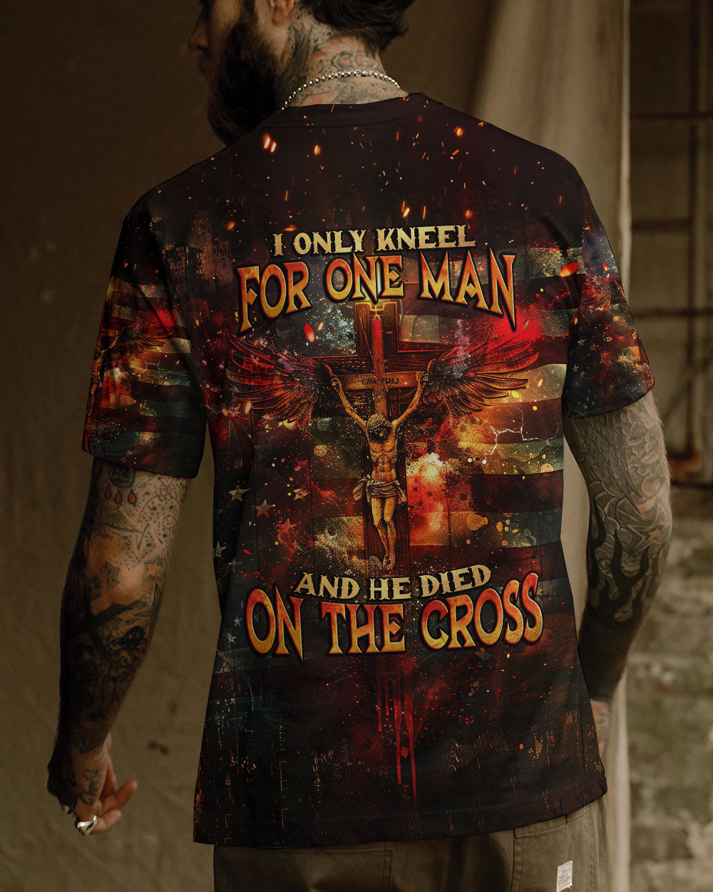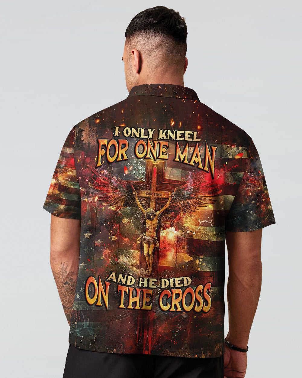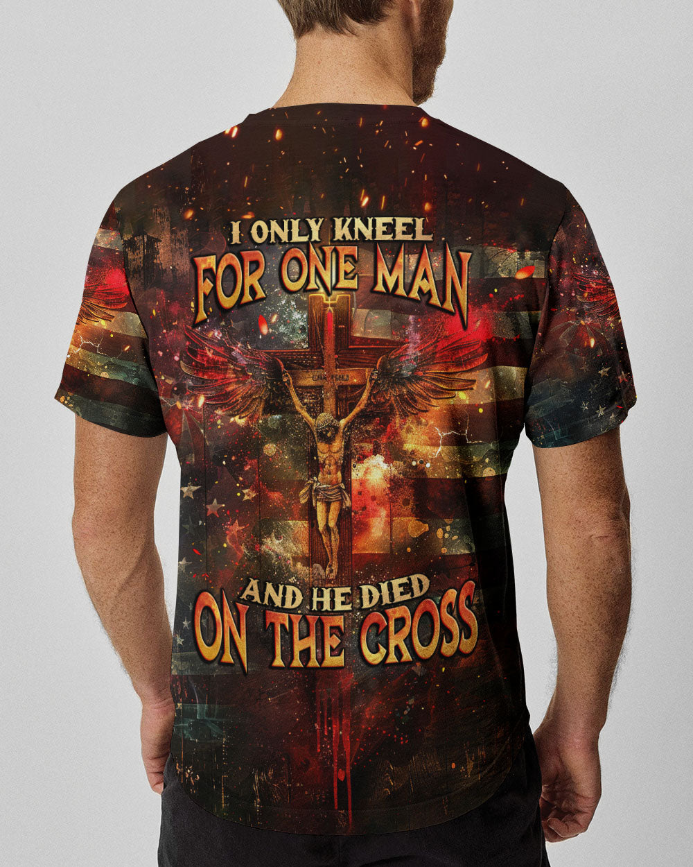 Embody your faith with our "I Only Kneel For One Man" all-over print shirt. Featuring a powerful winged cross and the quote, "I only kneel for one man and he died on the cross," this shirt exemplifies your unwavering devotion to Jesus Christ. Show your commitment to Him with this symbolic and meaningful garment.