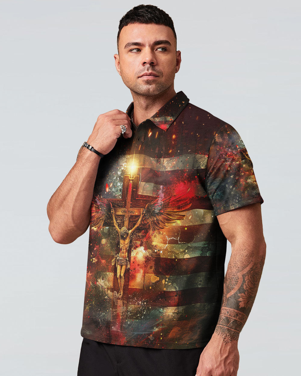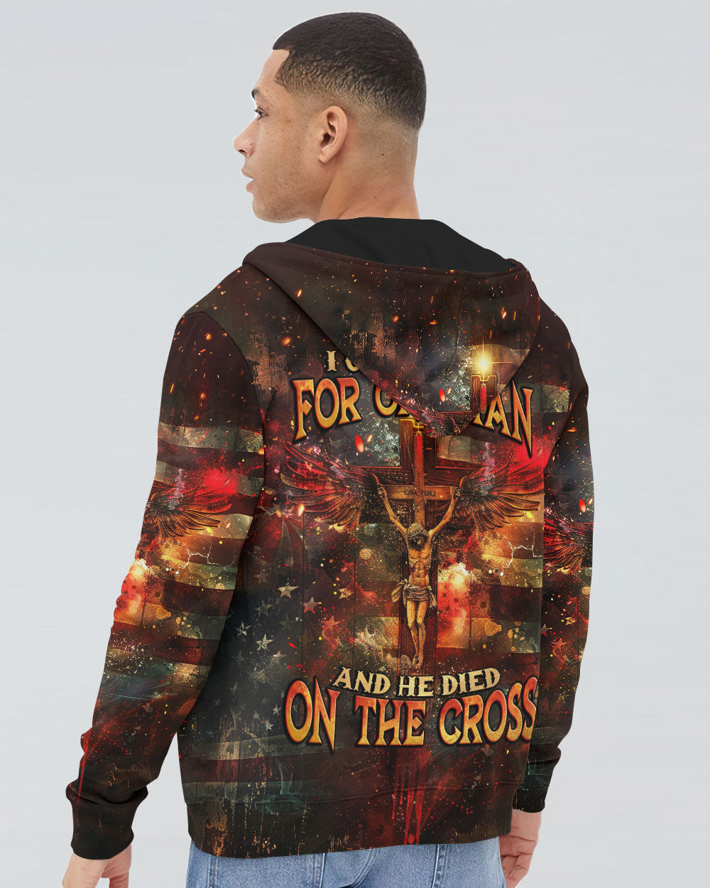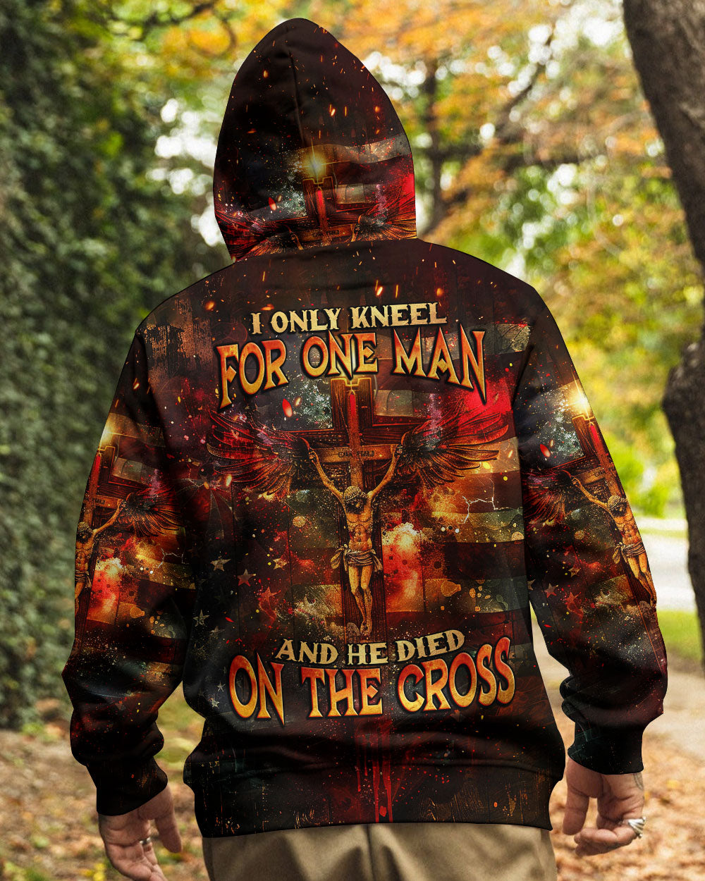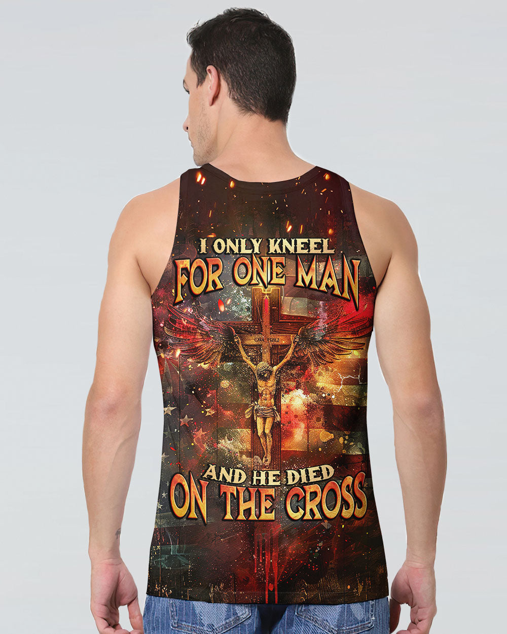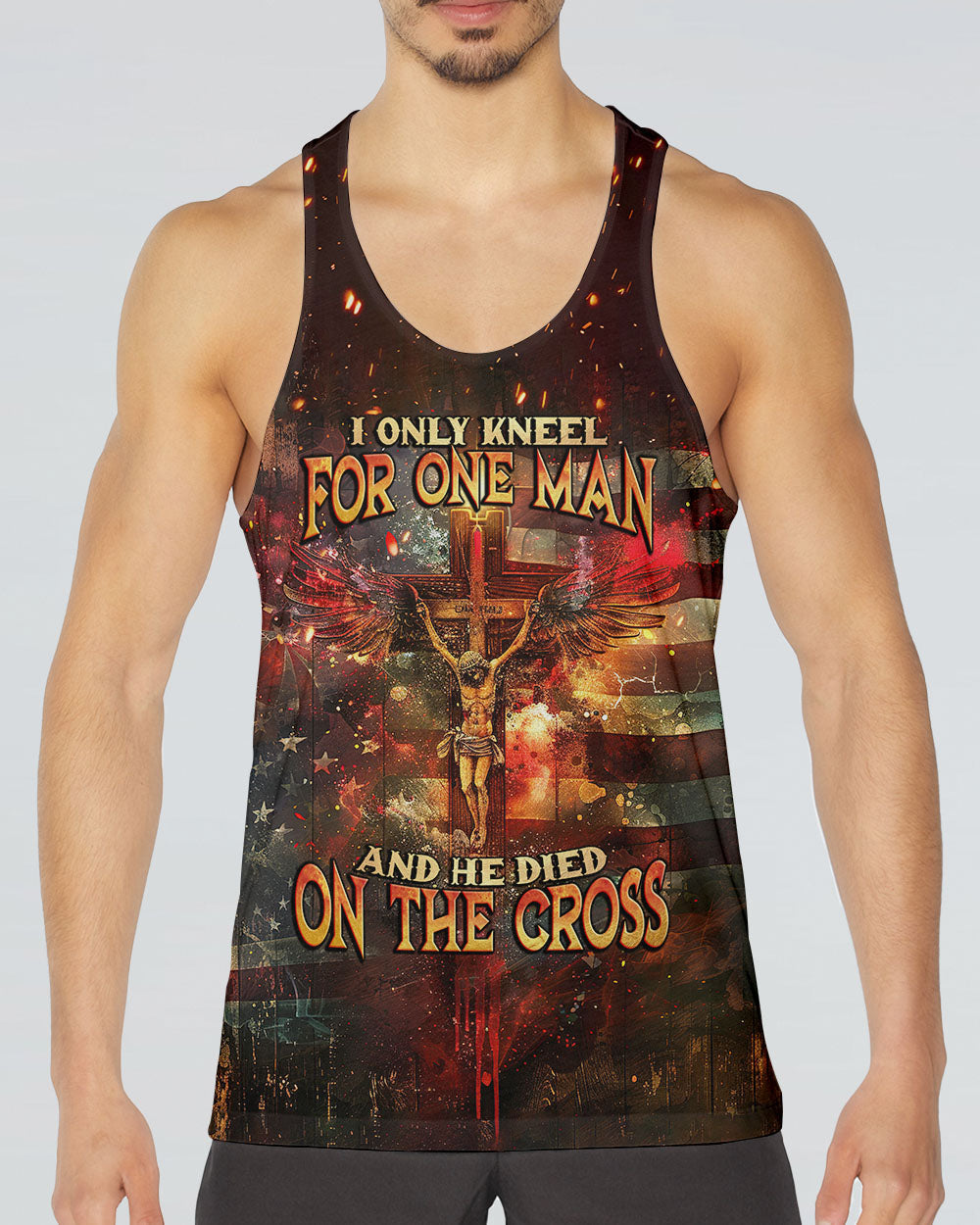 Embody your faith with our "I Only Kneel For One Man" all-over print shirt. Featuring a powerful winged cross and the quote, "I only kneel for one man and he died on the cross," this shirt exemplifies your unwavering devotion to Jesus Christ. Show your commitment to Him with this symbolic and meaningful garment.