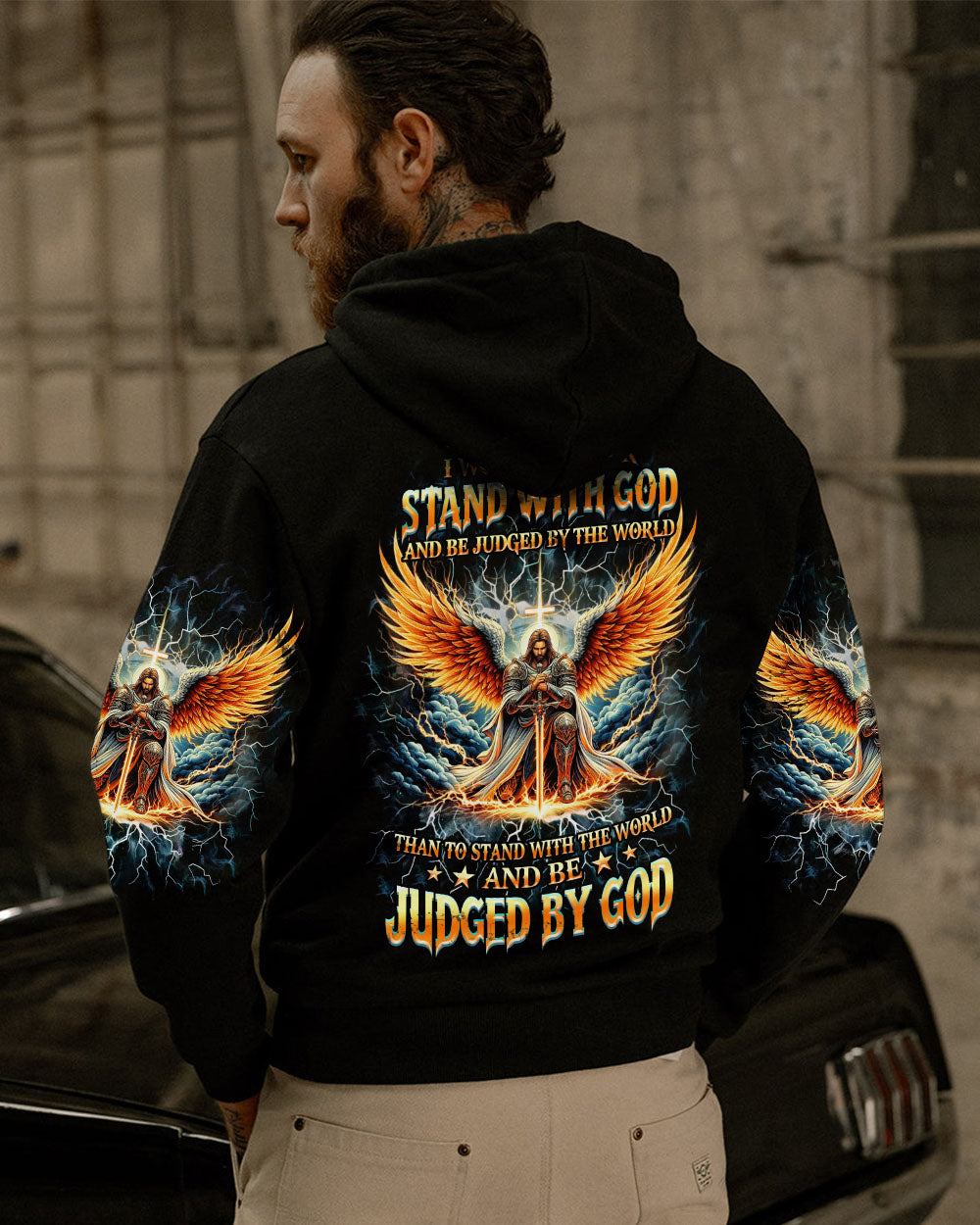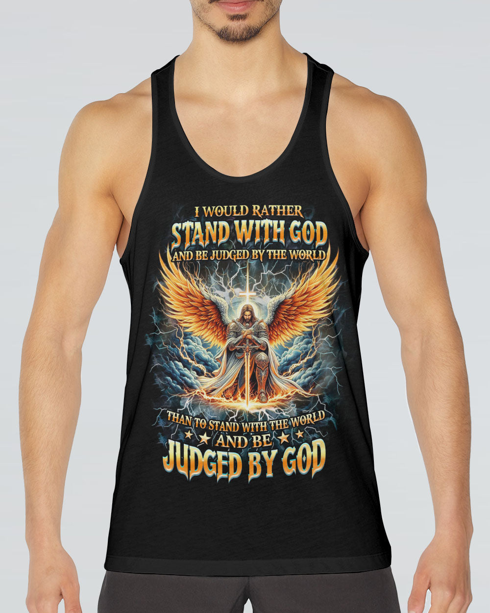 Step into the realm of divine strength and unwavering conviction with our Faith Christ Design. Witness the majestic portrayal of God's warrior, kneeling with unwavering faith, holding the sword of truth amidst thunderous skies. The sacred cross symbolizes eternal grace and divine guidance. Our design echoes the powerful quote, 'I Would Rather Stand With God And Be Judged By The World Than Stand With The World And Be Judged By God,' affirming the commitment to faith over worldly judgment. Whether seeking solace in trial or embracing your spiritual journey with courage, our design serves as a beacon of unwavering belief and divine protection.