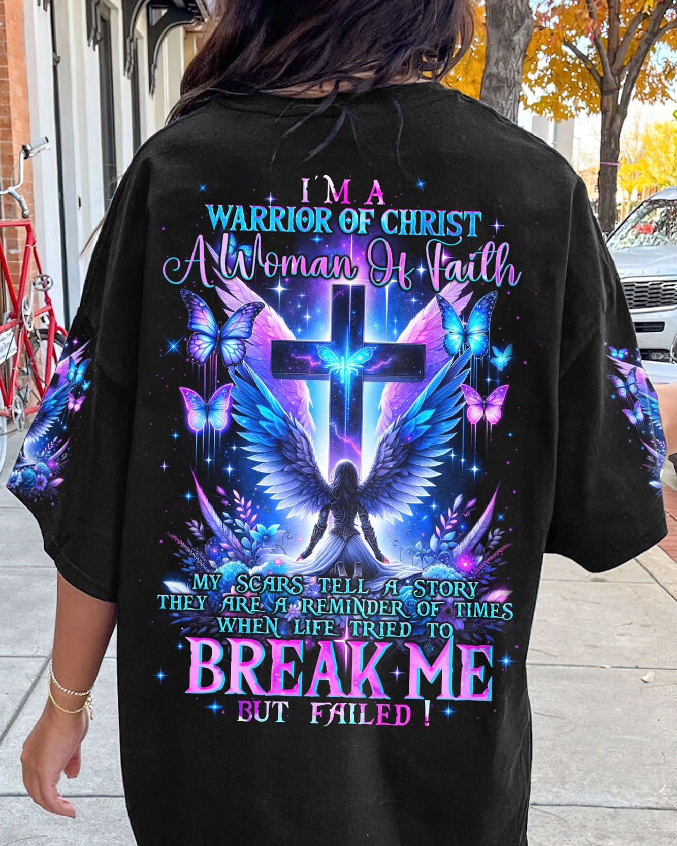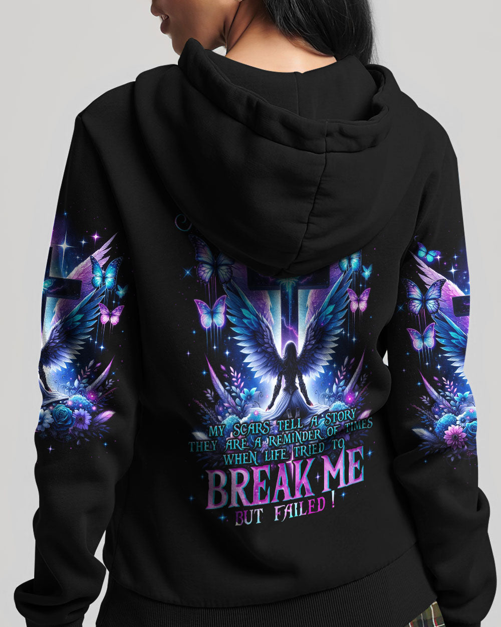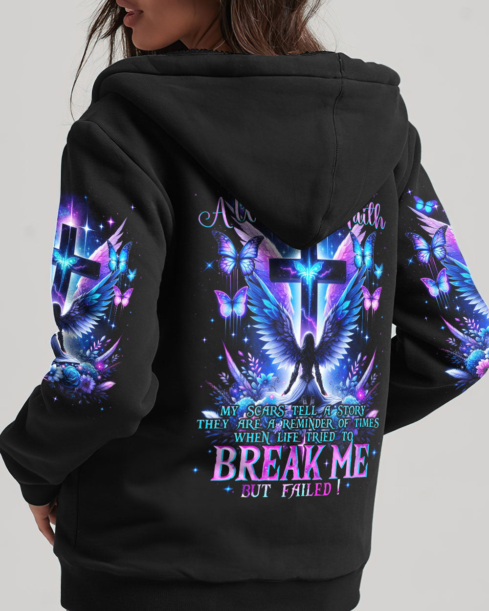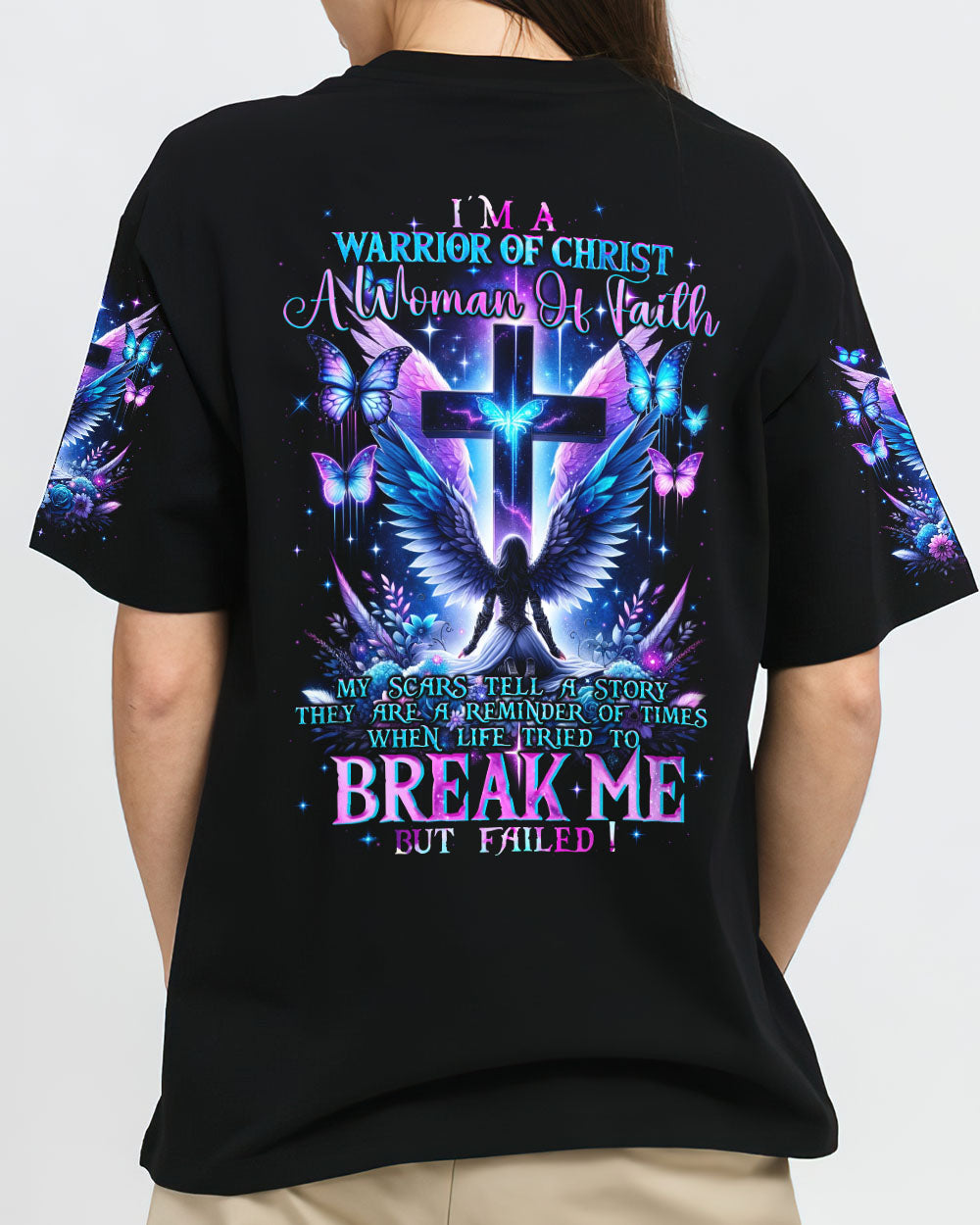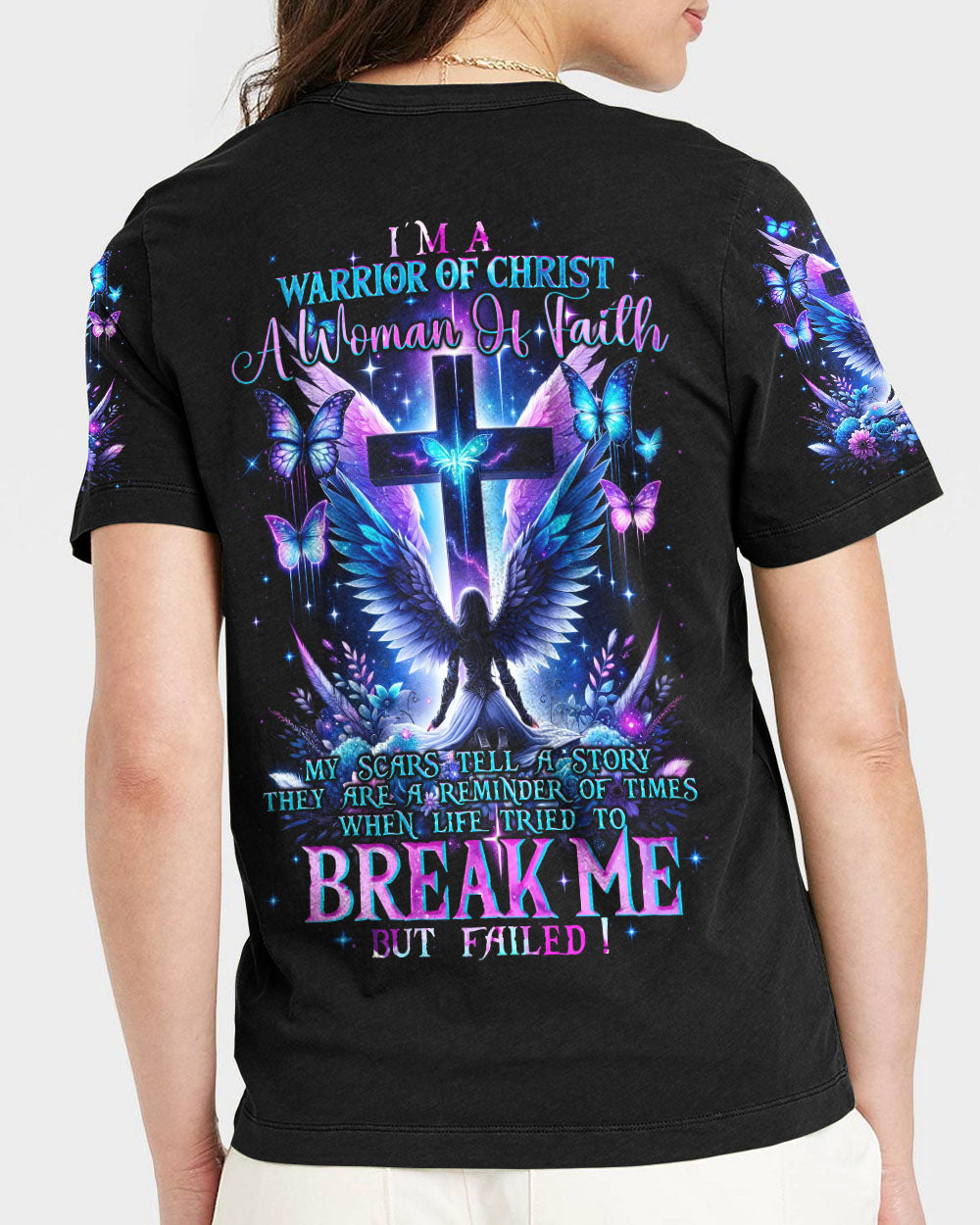Embark on a visual journey of faith with our compelling design that intertwines Christian symbolism and resilience. The cross, a powerful emblem, stands tall alongside a warrior adorned with wings, embodying strength and grace. Delicate flowers and butterflies add beauty and renewal. The quote infuses the design with a narrative of triumph over adversity. Reflect on the enduring power of faith and strength found in embracing one's scars with this impressive artwork.