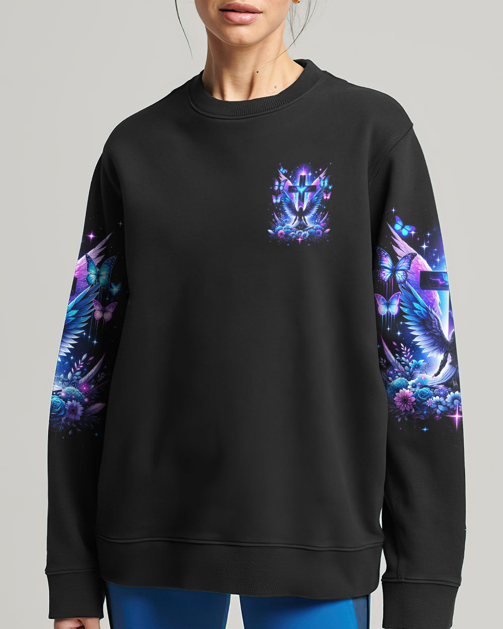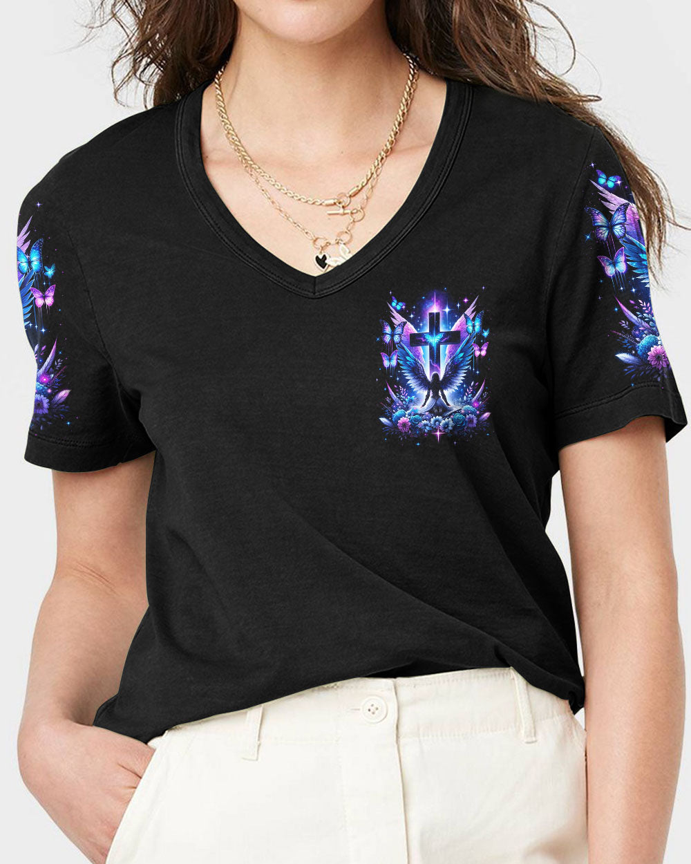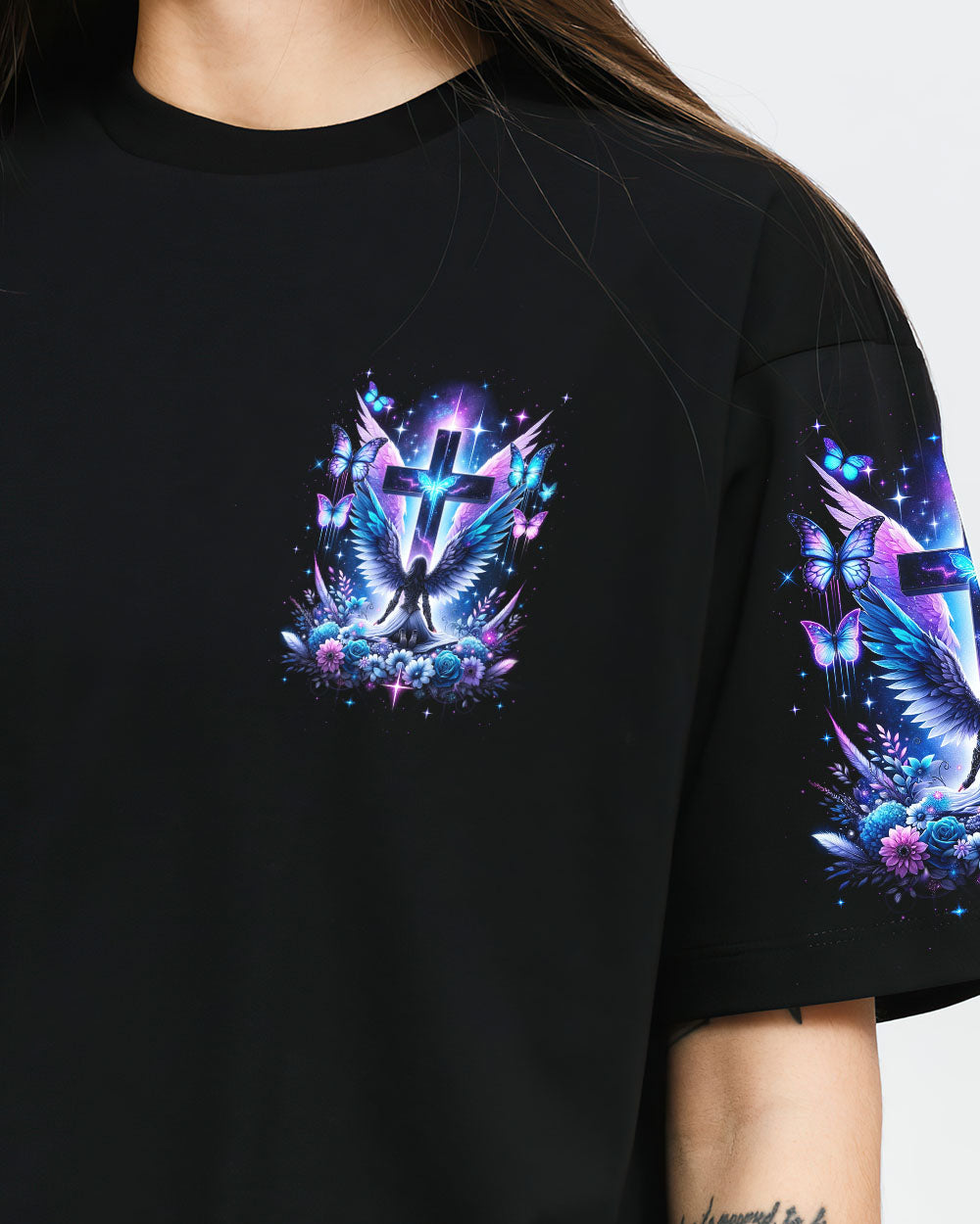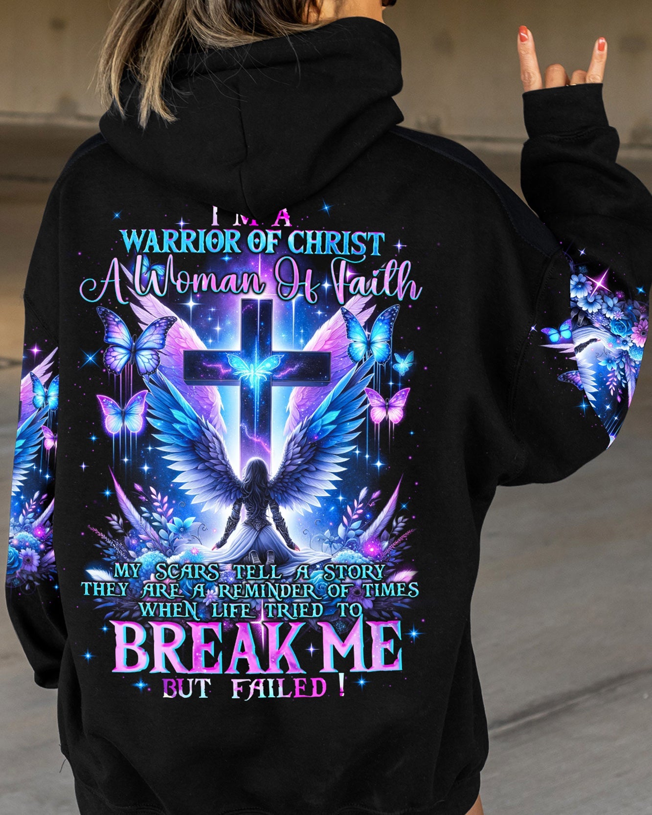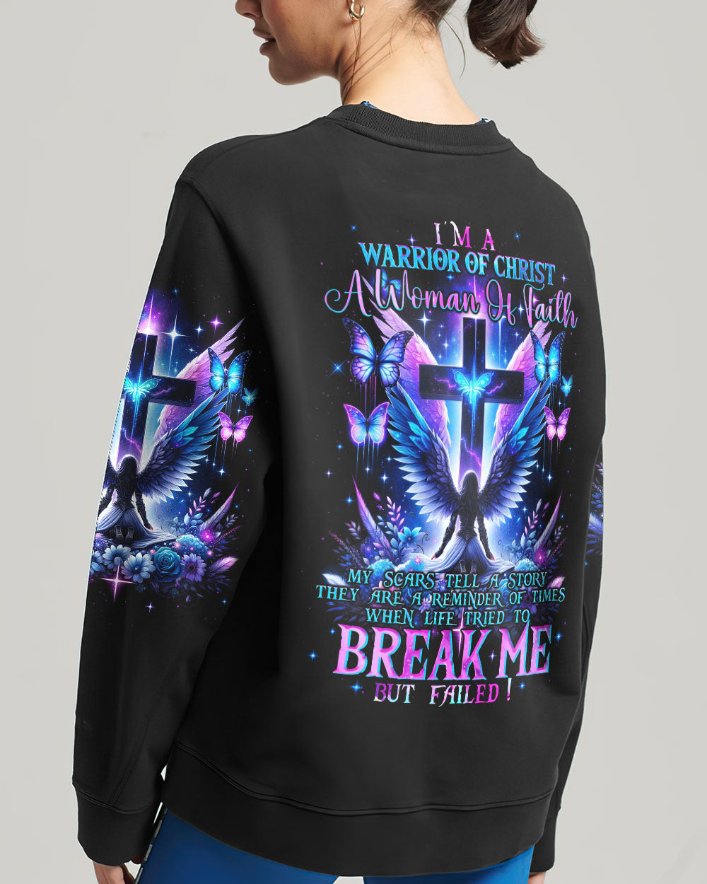 Embark on a visual journey of faith with our compelling design that intertwines Christian symbolism and resilience. The cross, a powerful emblem, stands tall alongside a warrior adorned with wings, embodying strength and grace. Delicate flowers and butterflies add beauty and renewal. The quote infuses the design with a narrative of triumph over adversity. Reflect on the enduring power of faith and strength found in embracing one's scars with this impressive artwork.