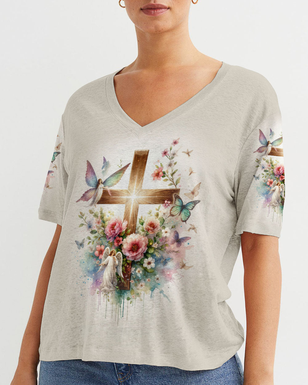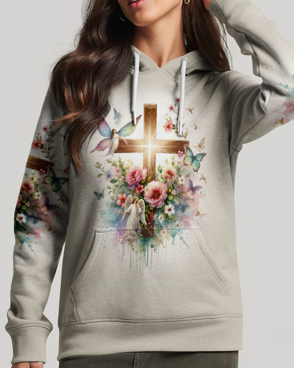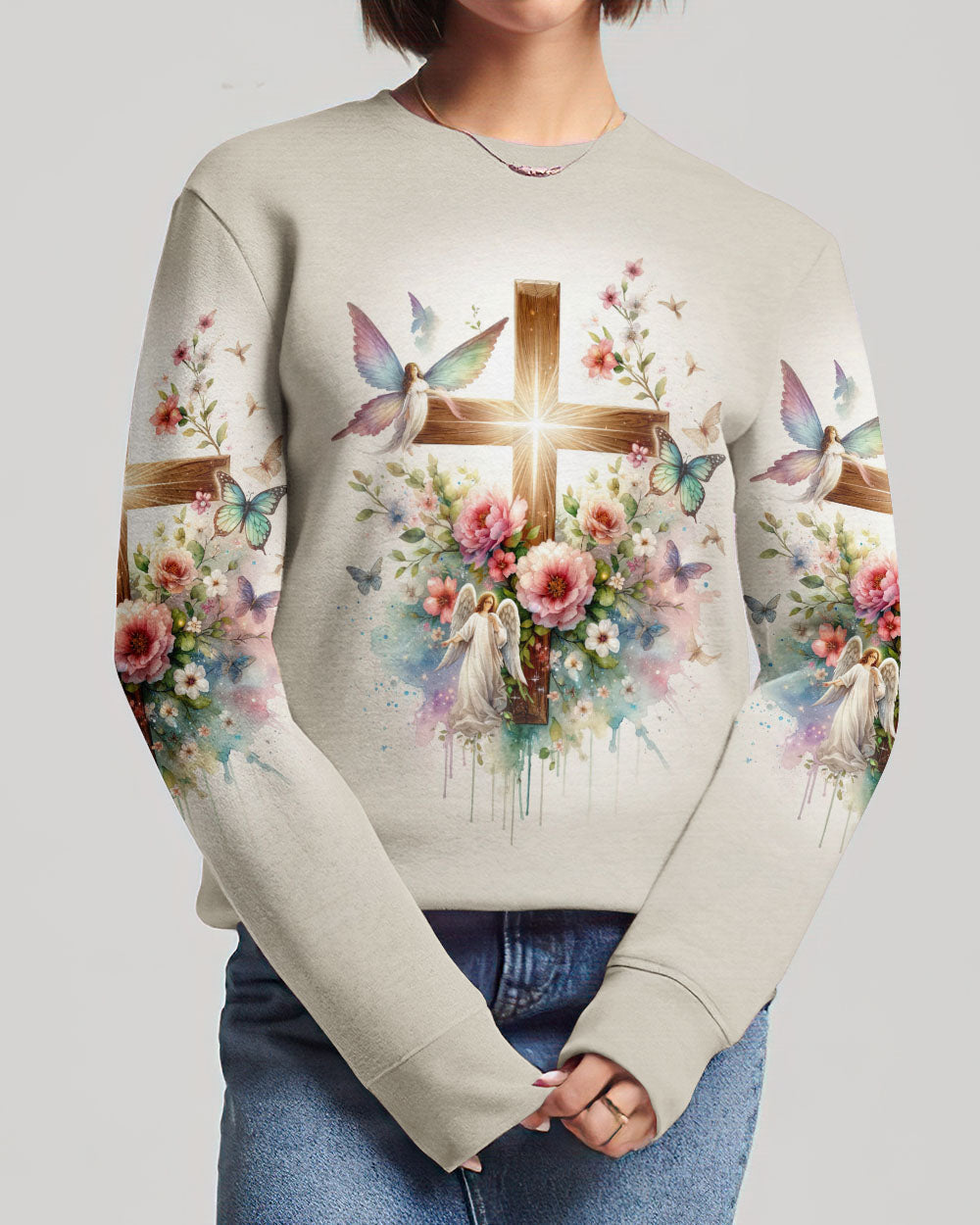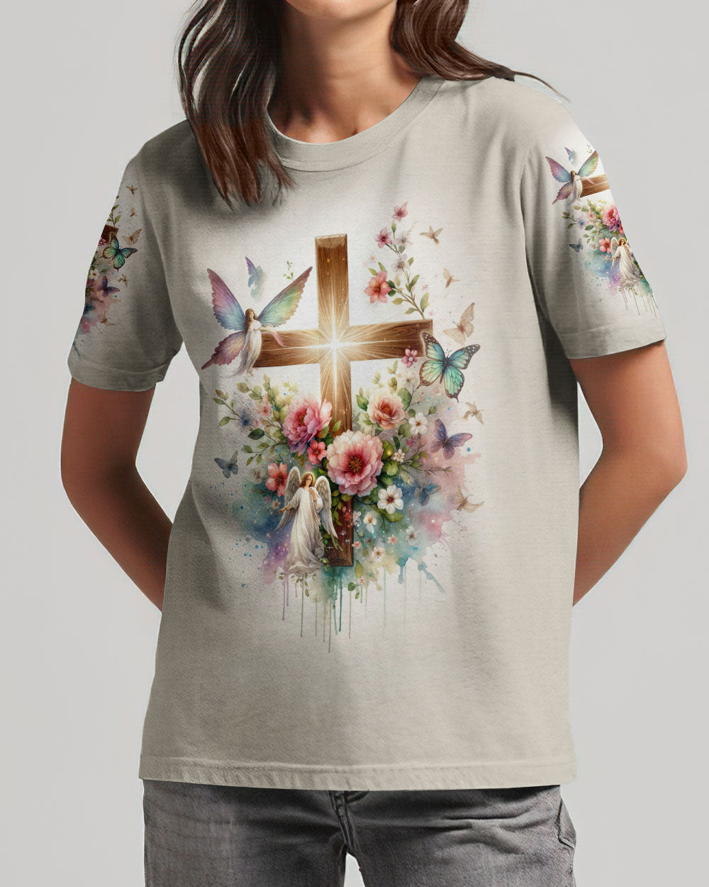 Our I've Got Angels Women's All Over Print Shirt is the perfect way to make a spiritual statement. Featuring an intricately detailed cross adorned with flourishing flowers and surrounded by a heavenly chorus of angels, this design provides a comforting reminder of divine protection with the saying, “I've got angels all around me.” Let your faith shine with this beautiful and meaningful all-over print shirt.