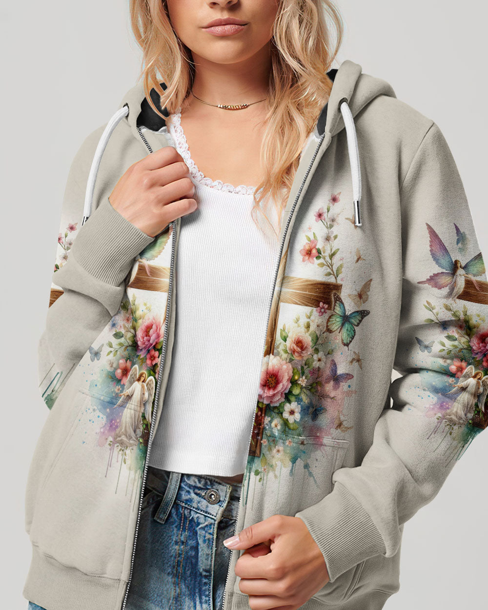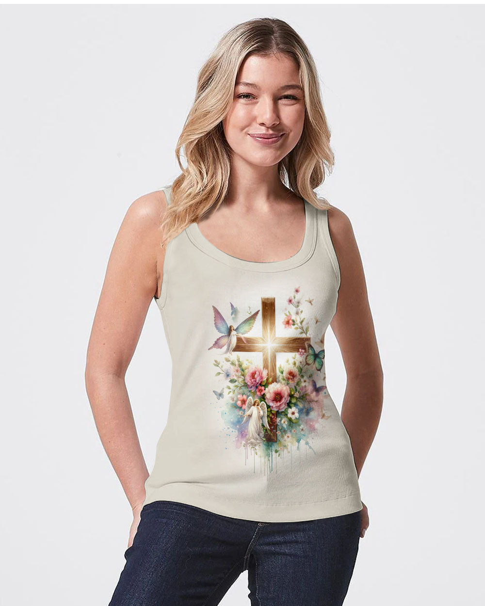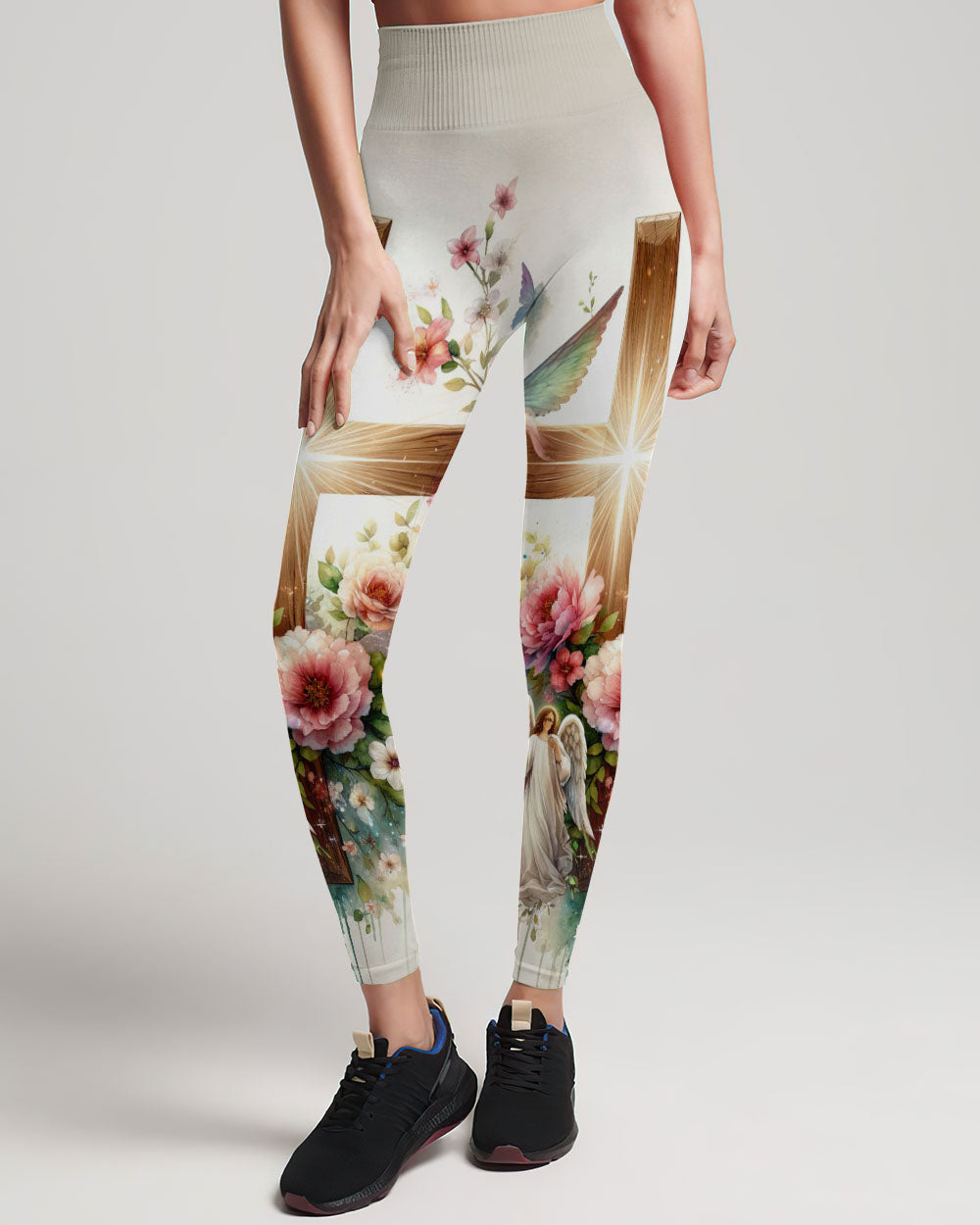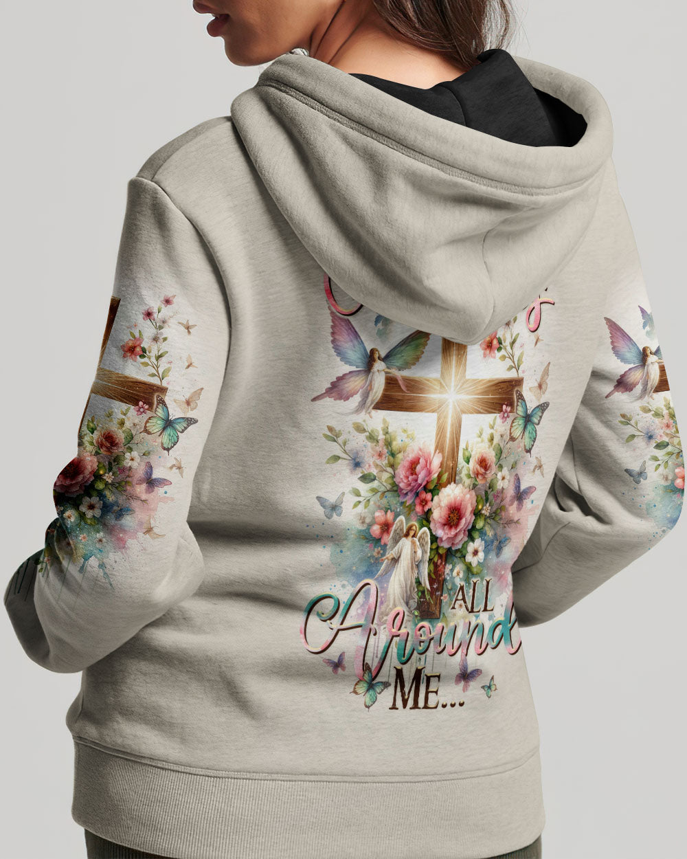 Our I've Got Angels Women's All Over Print Shirt is the perfect way to make a spiritual statement. Featuring an intricately detailed cross adorned with flourishing flowers and surrounded by a heavenly chorus of angels, this design provides a comforting reminder of divine protection with the saying, “I've got angels all around me.” Let your faith shine with this beautiful and meaningful all-over print shirt.