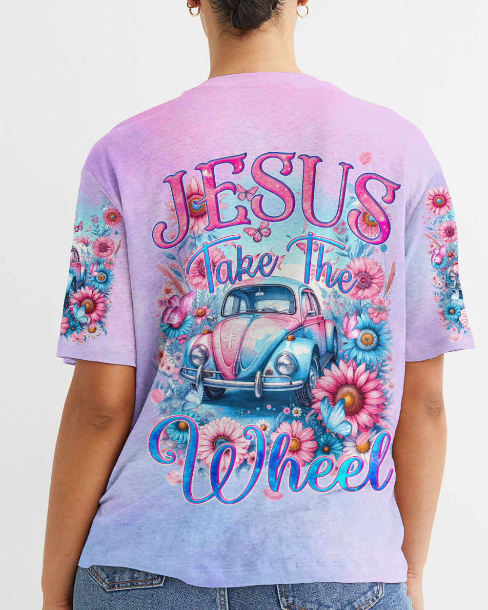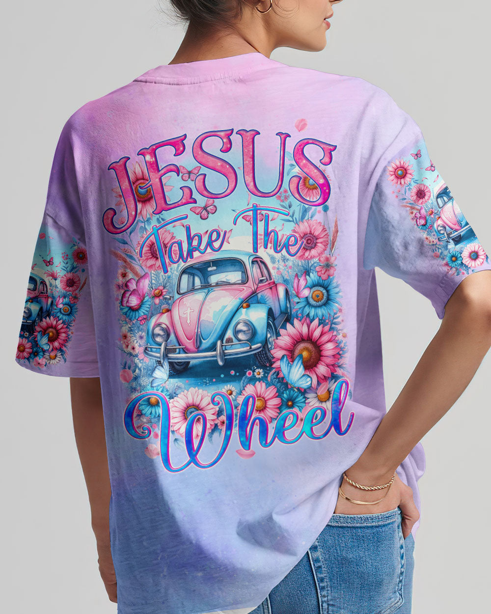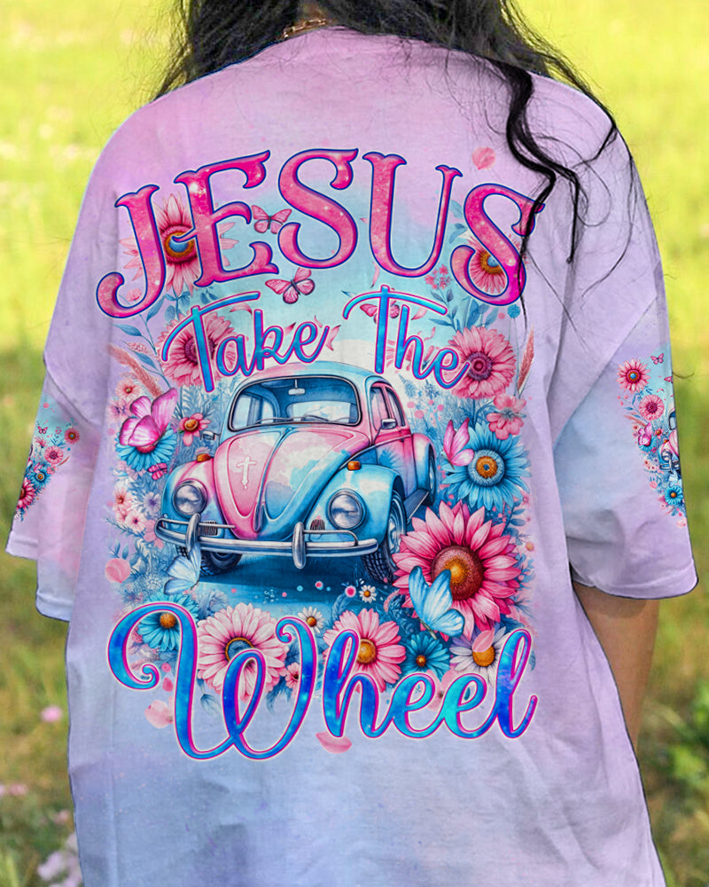 Inspire faith and style with the Jesus Take The Wheel Women's All Over Print Shirt. This captivating design features blooming flowers, gentle butterflies, and a sleek car united by the powerful statement "Jesus takes the wheel." It's a visual testament to faith in action, reminding you that you are never alone on life's journey. Experience the joy of the divine on every ride.