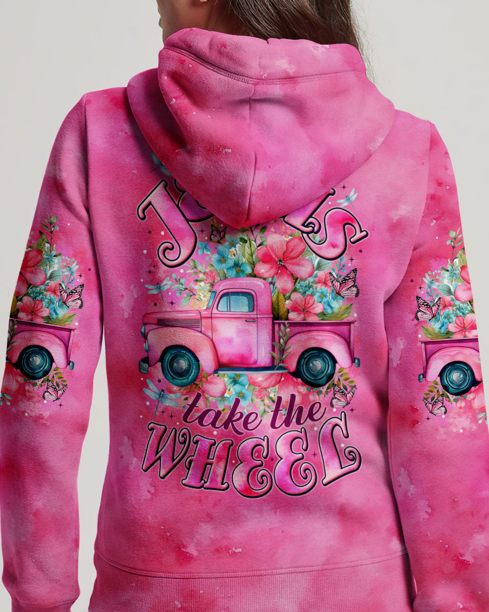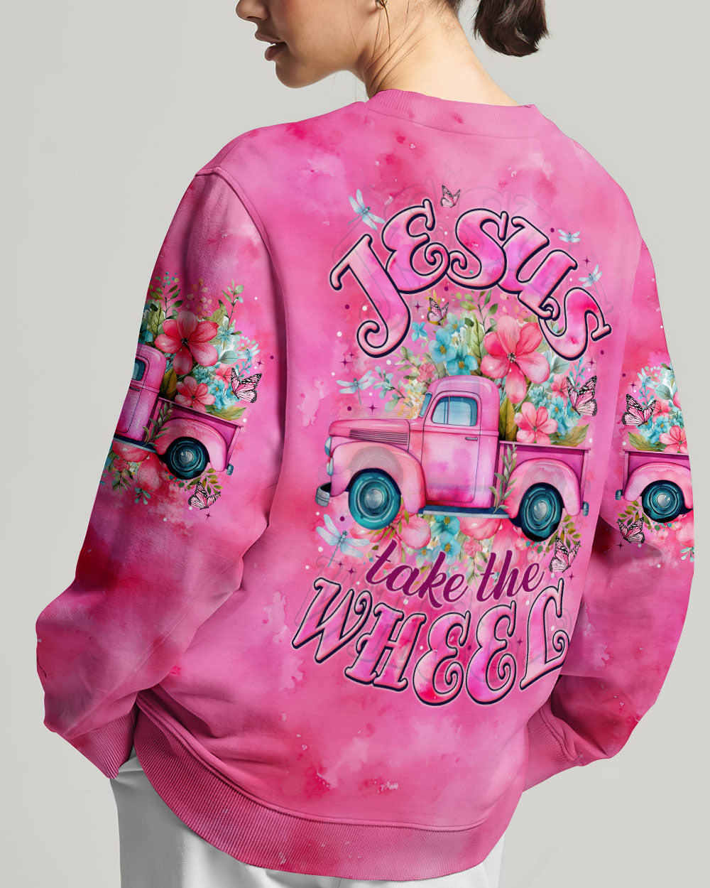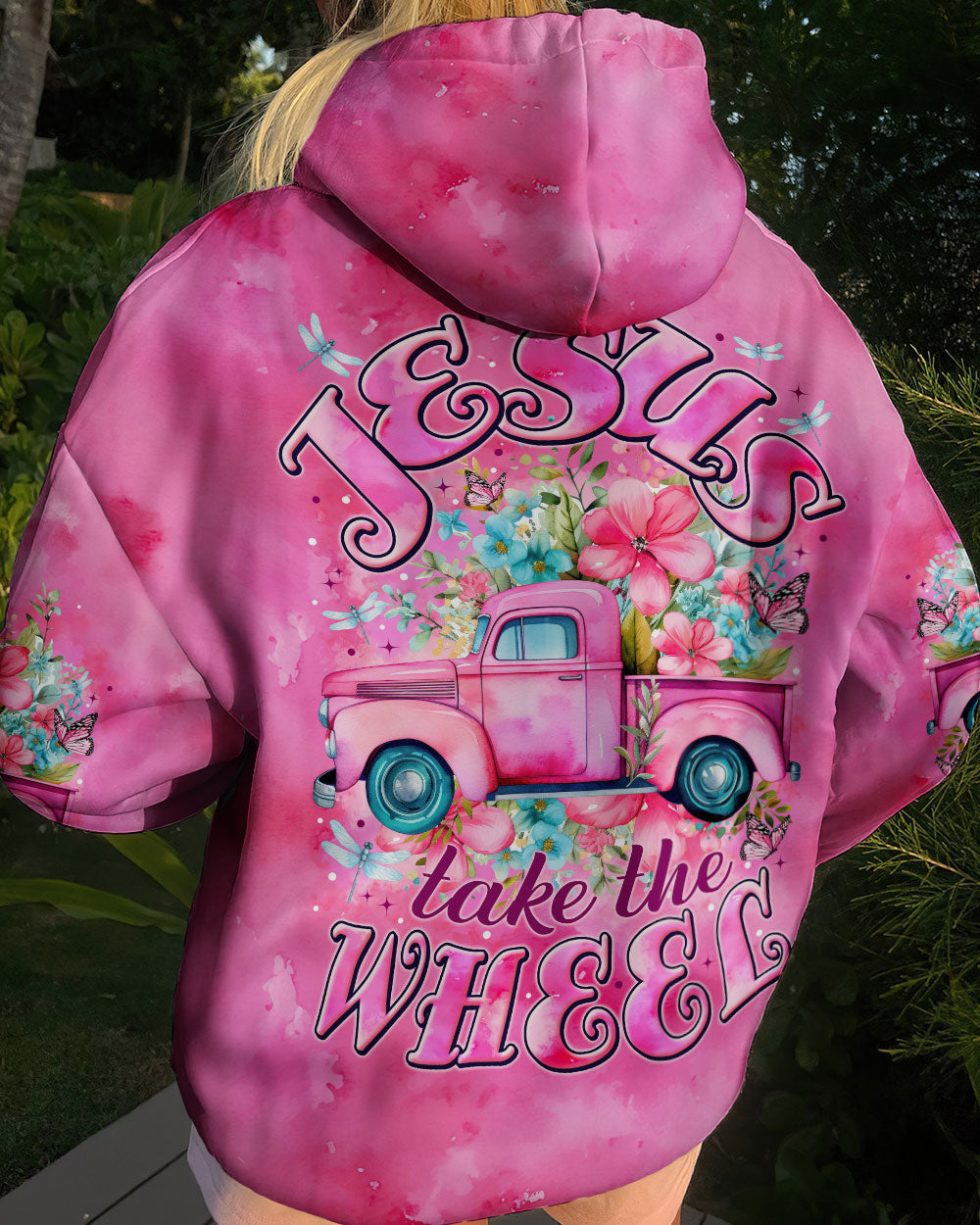 This all-over print shirt is a powerful statement of trust and divine guidance. Featuring vibrant flowers and graceful butterflies, it symbolizes growth and transformation on life's journey. Let the mantra, "Jesus takes the wheel," remind you of the unwavering belief that He leads us down a path of grace and purpose.
