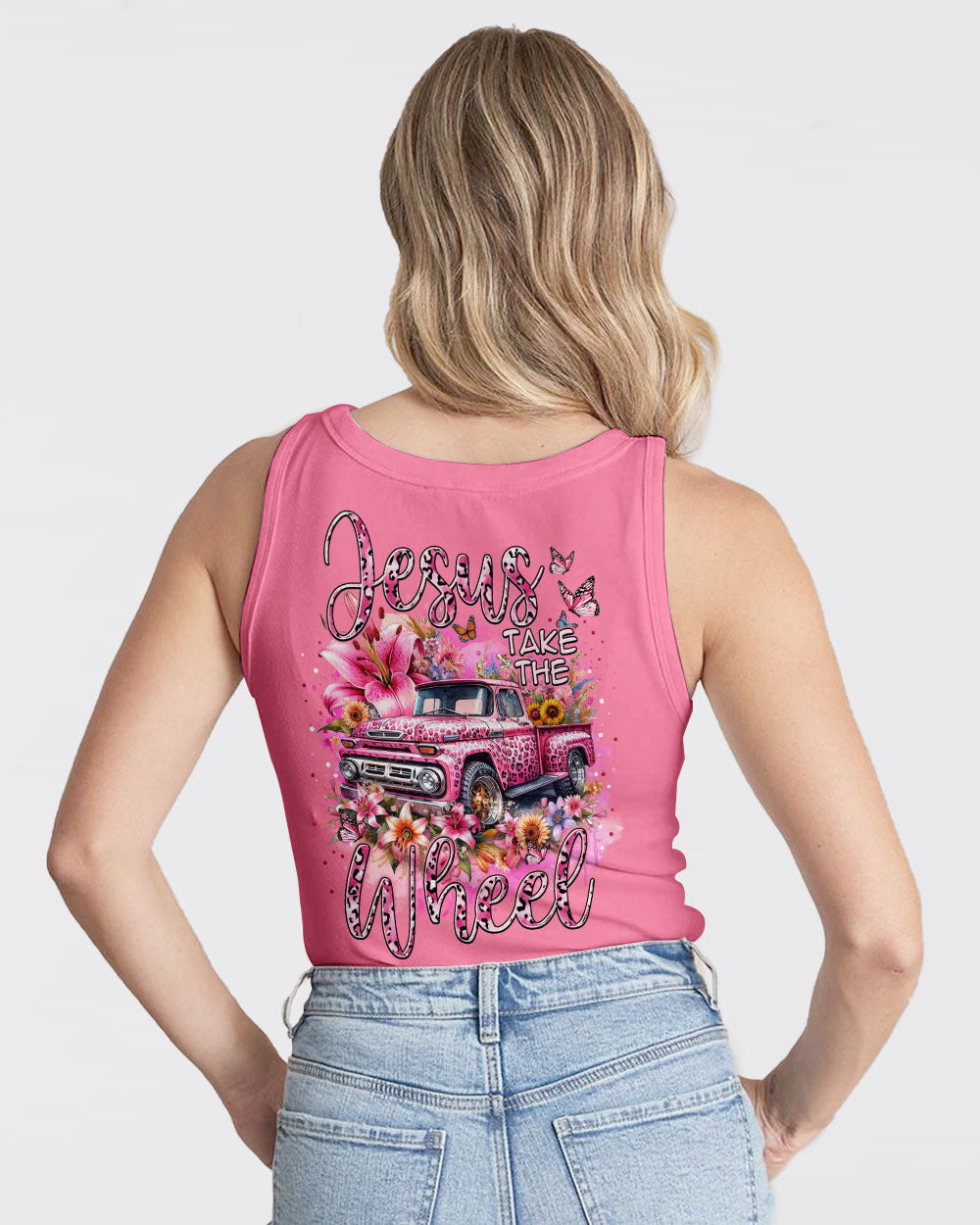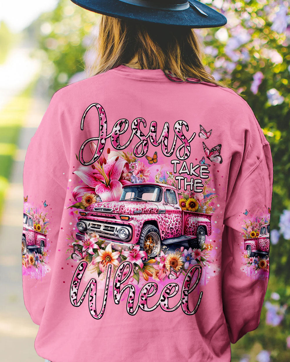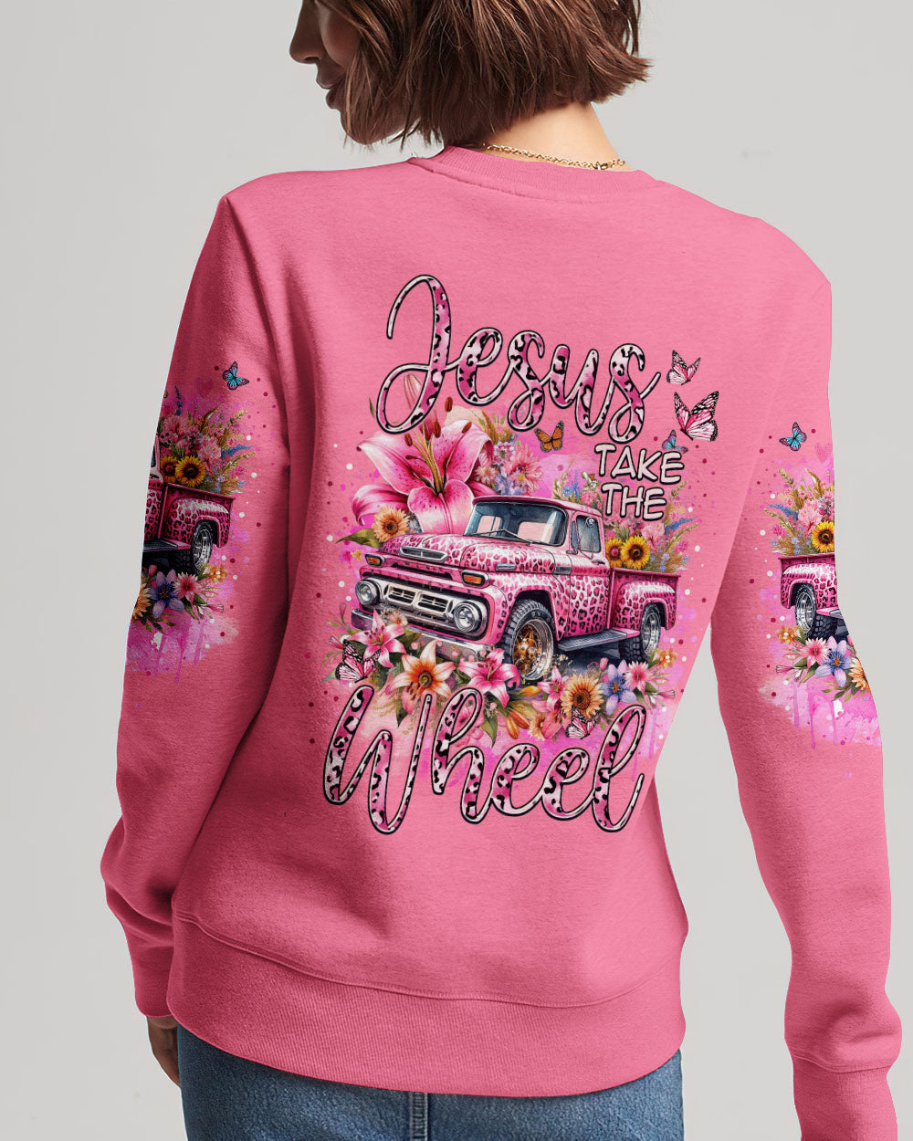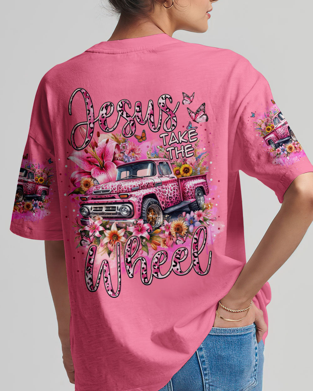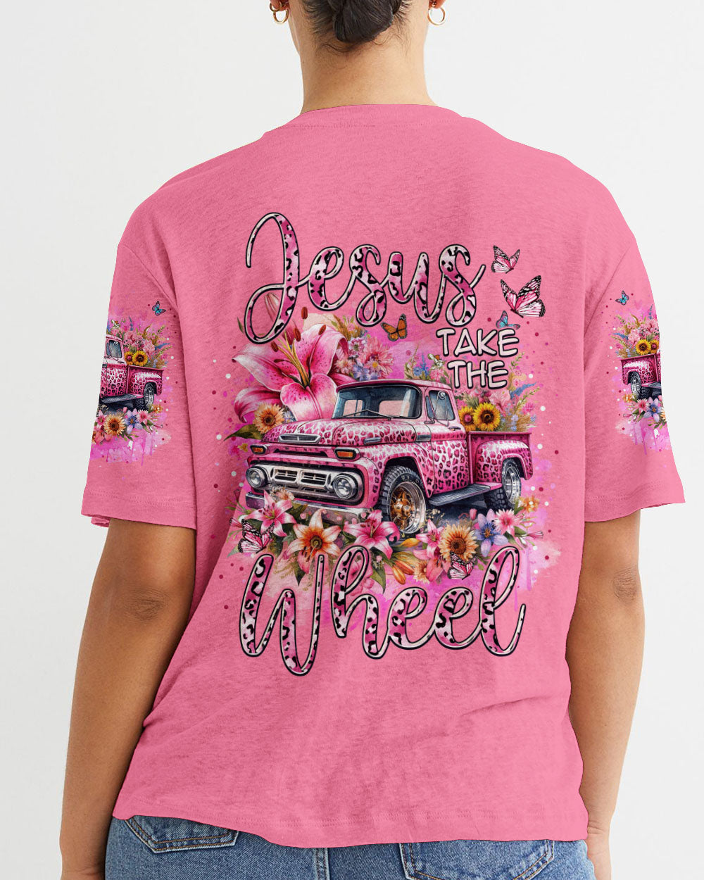 A classic way to express your faith, this Jesus Take the Wheel Women's All Over Print Shirt features a lively design of a cart bursting with vibrant flowers, lilies, and a powerful reminder of trust and surrender to God's divine plan. Let the abundance of blooms represent the grace that comes from having Jesus at the wheel.