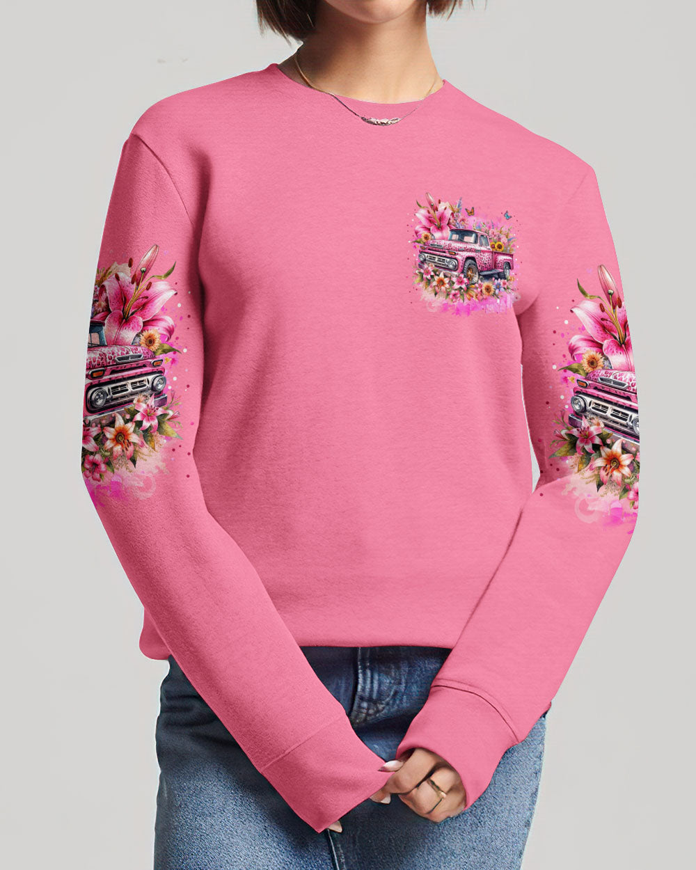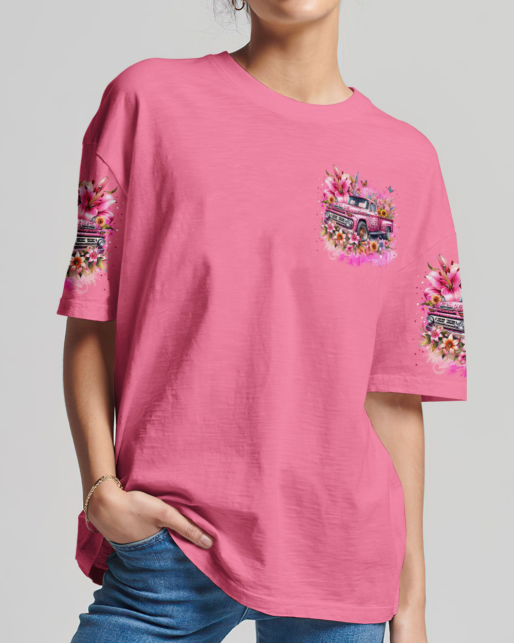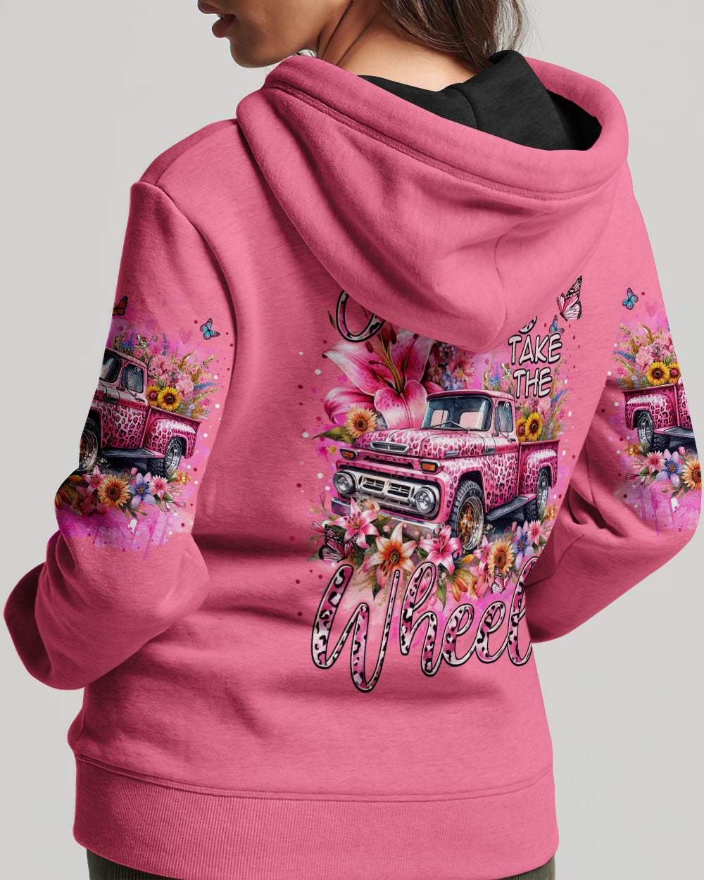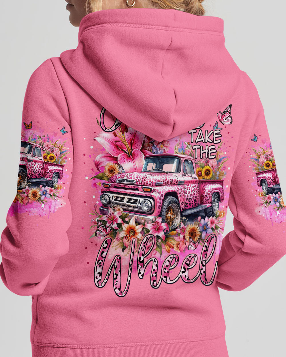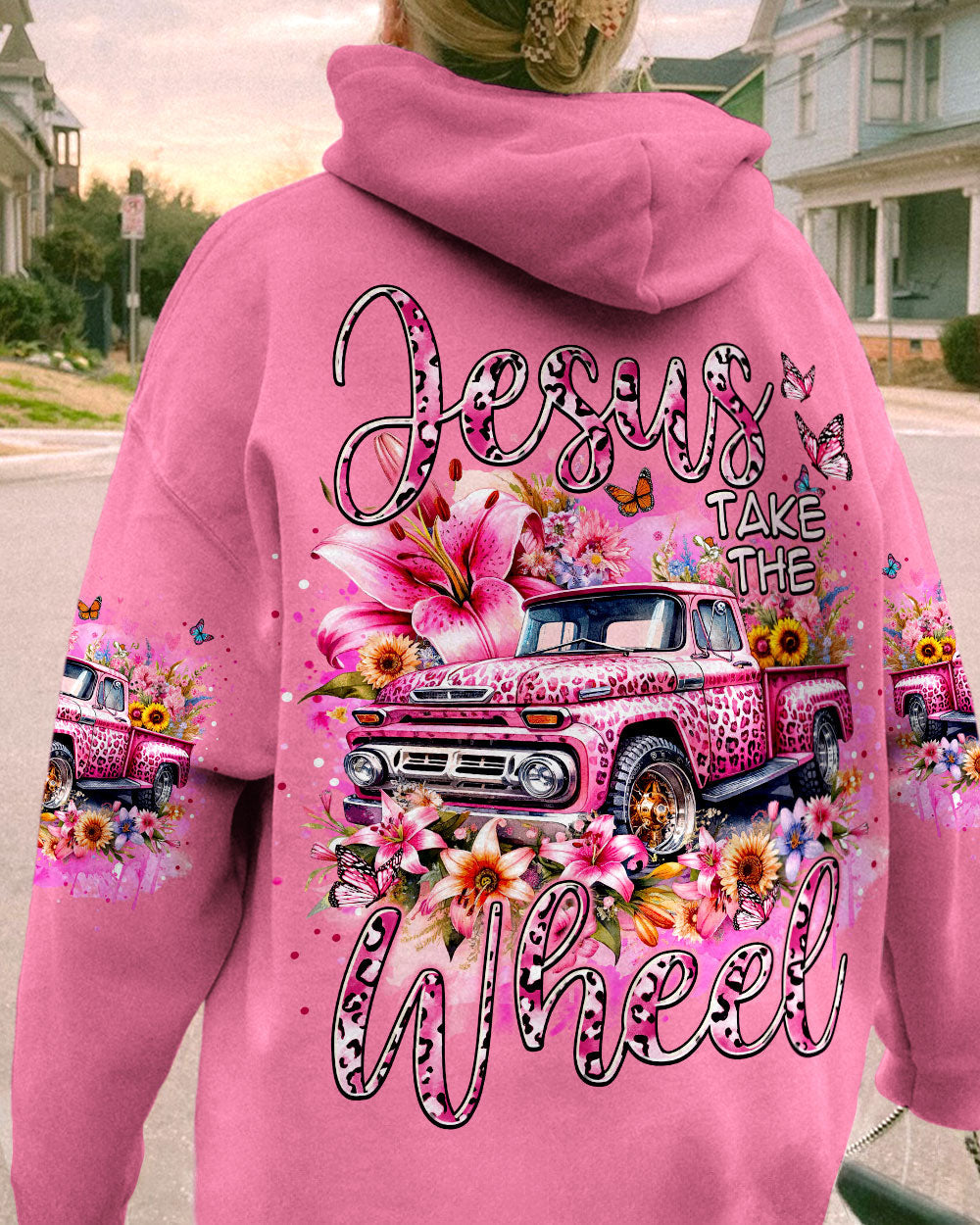 A classic way to express your faith, this Jesus Take the Wheel Women's All Over Print Shirt features a lively design of a cart bursting with vibrant flowers, lilies, and a powerful reminder of trust and surrender to God's divine plan. Let the abundance of blooms represent the grace that comes from having Jesus at the wheel.