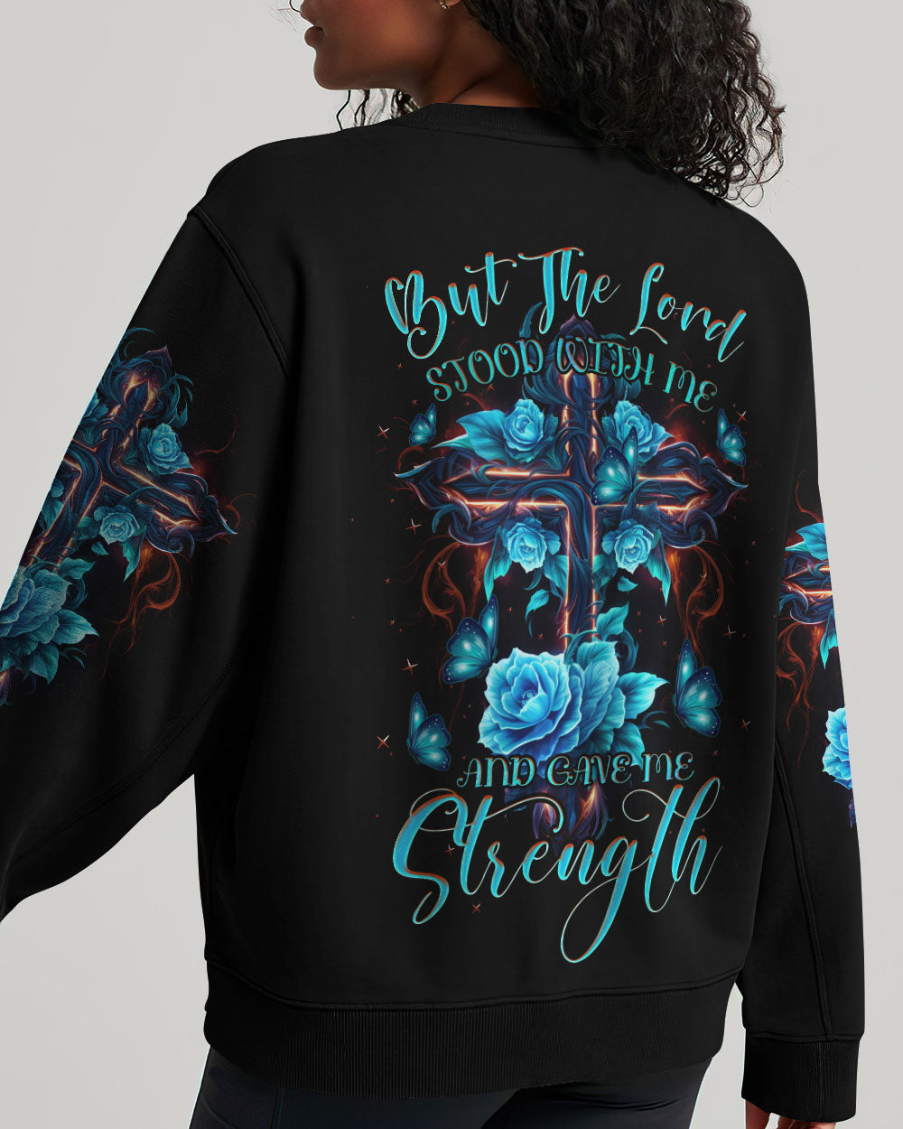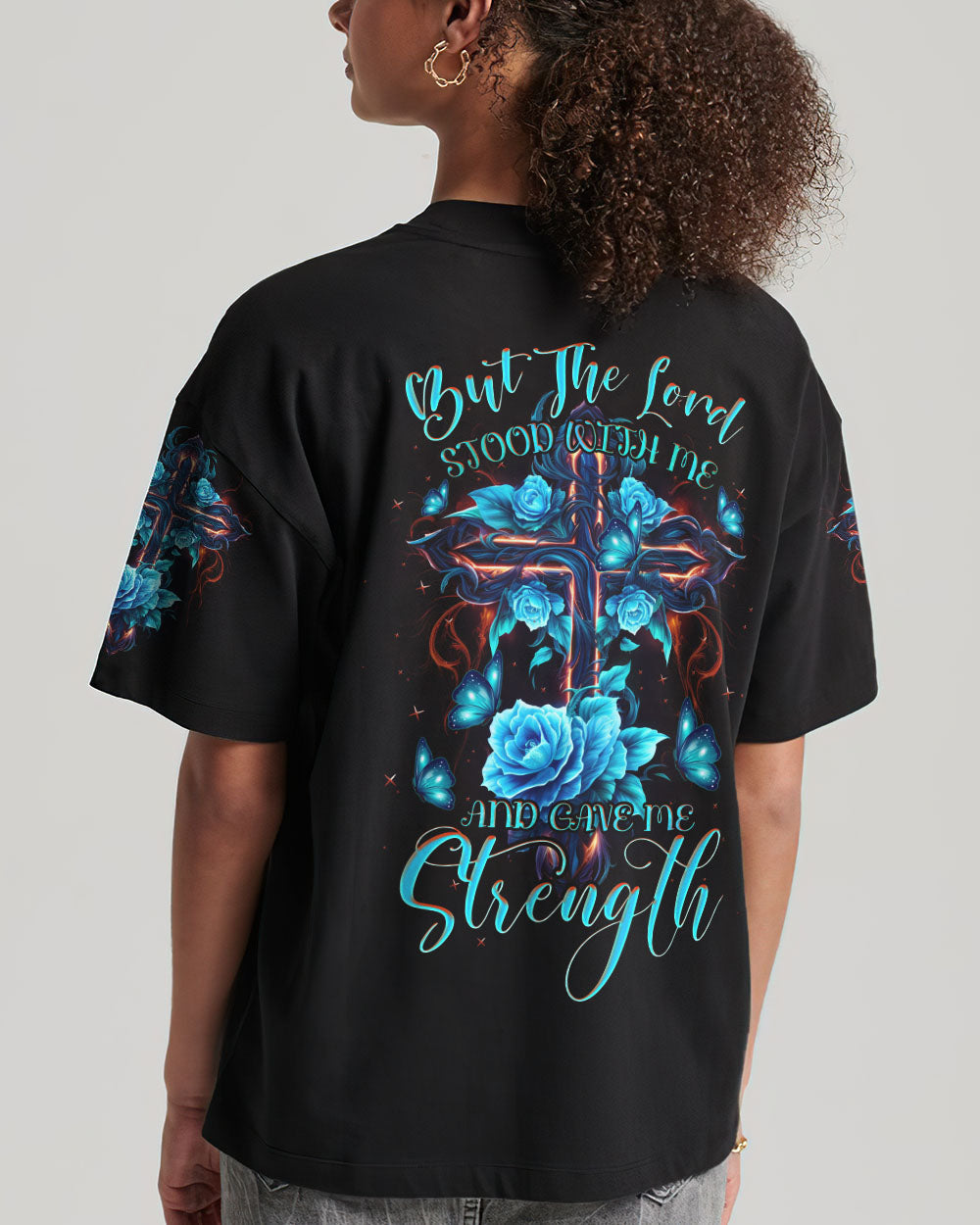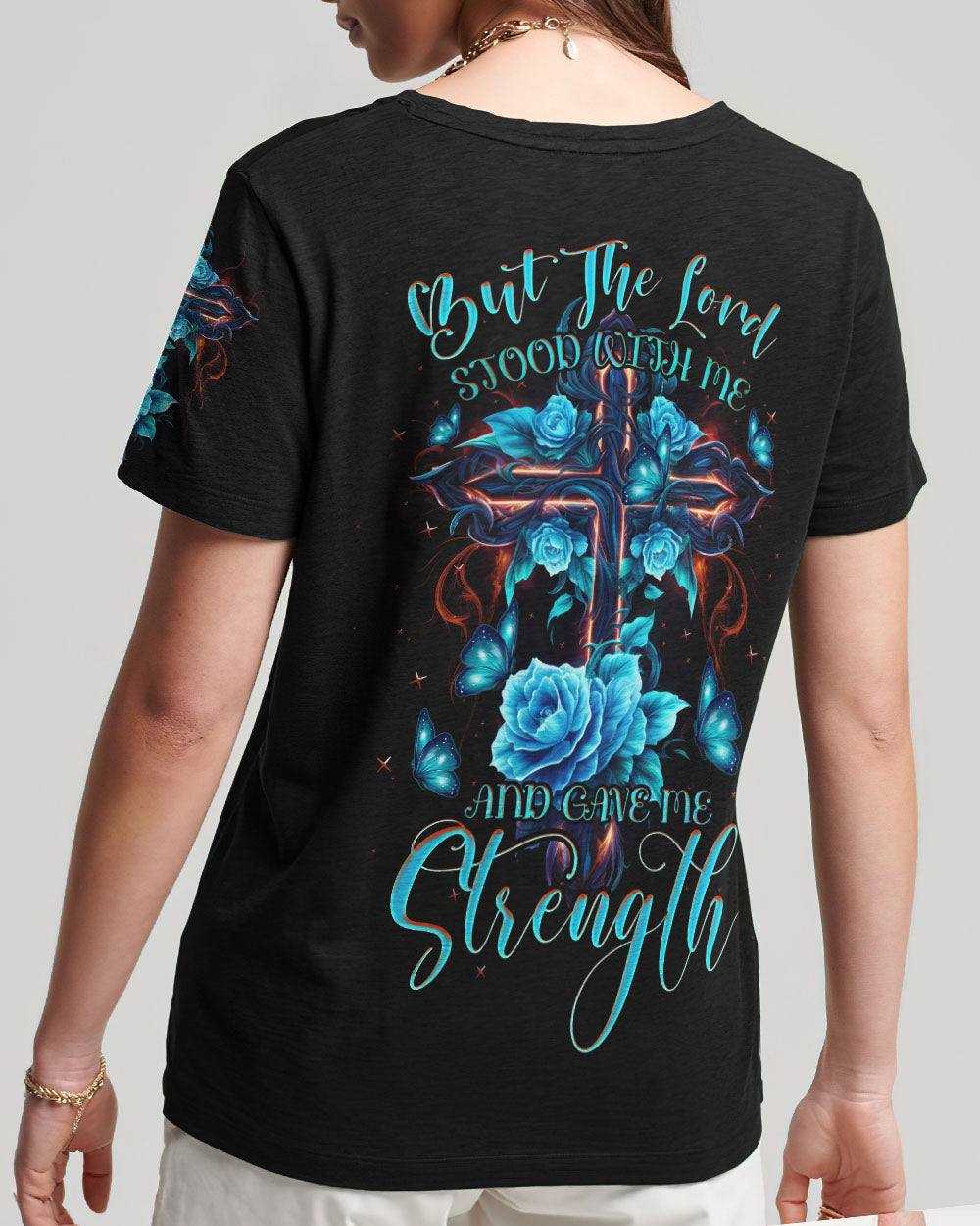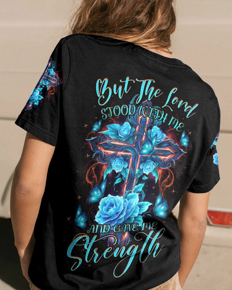 Illuminate your faith in God and embrace inner strength with our Lord Stood With Me Women's All Over Print Shirt. This radiant design features a sacred rose cross, symbolizing divine strength and grace, and the words, "but the Lord stood with me and gave me strength." A powerful reminder of God's presence and a testament of unwavering faith.