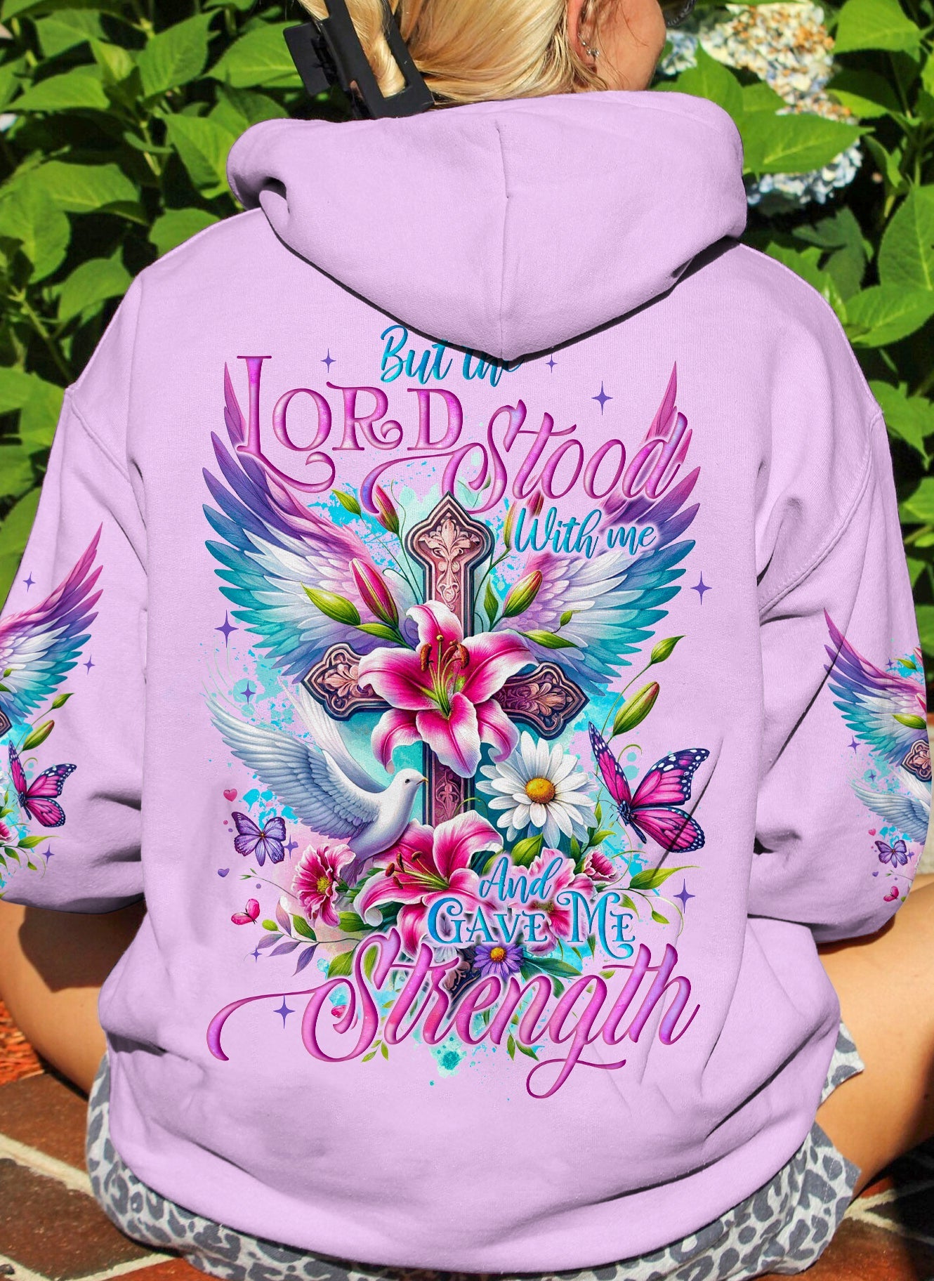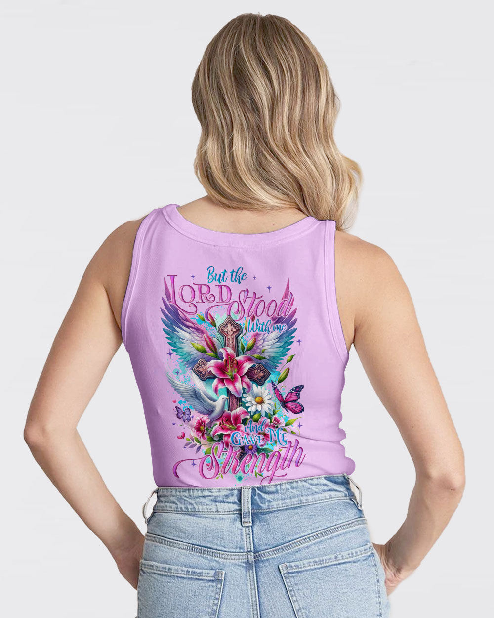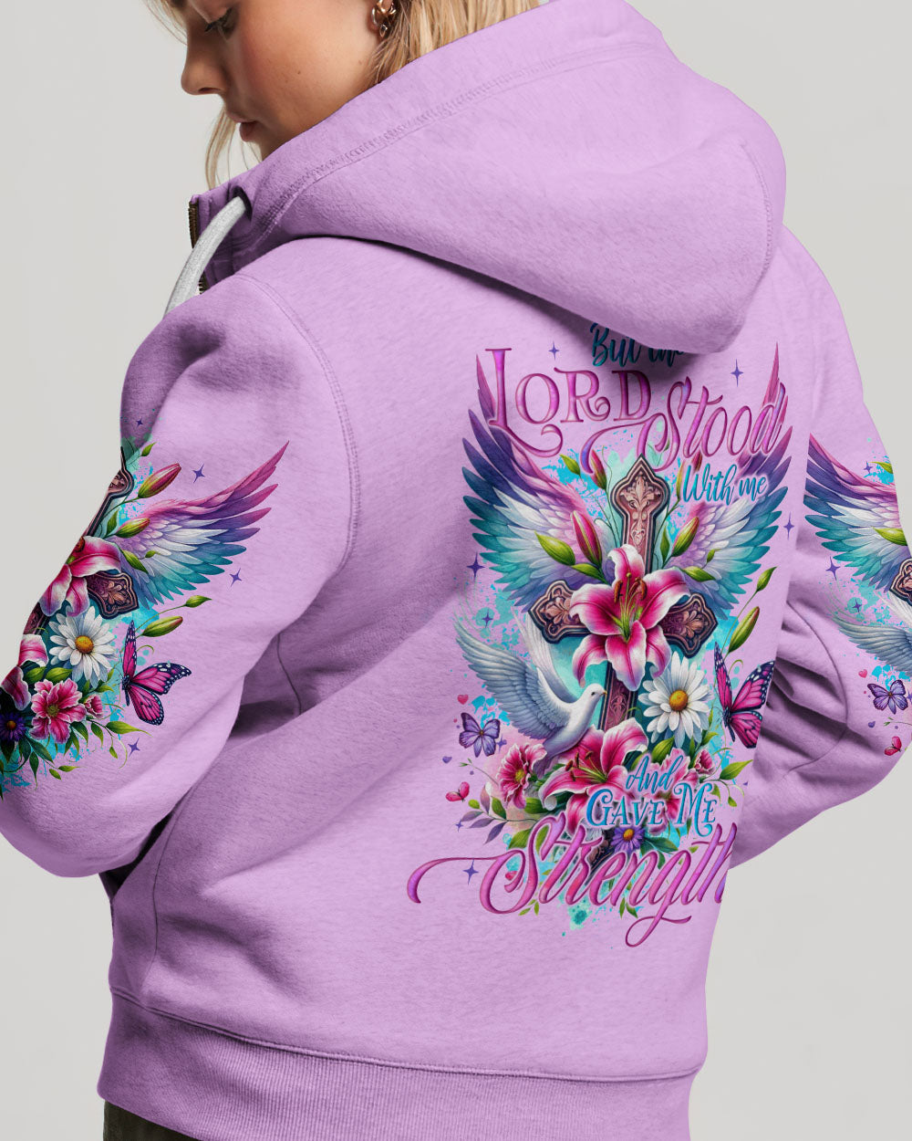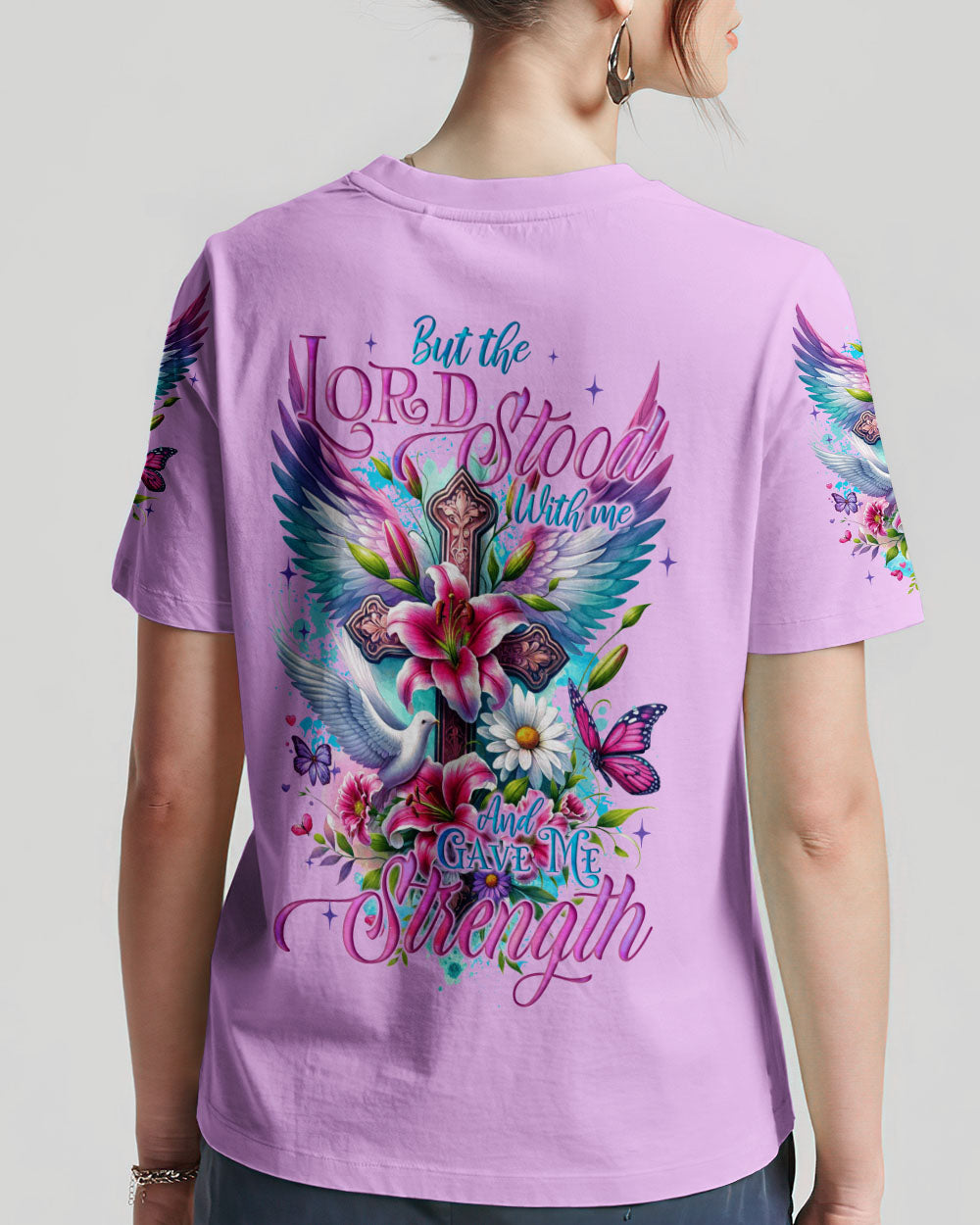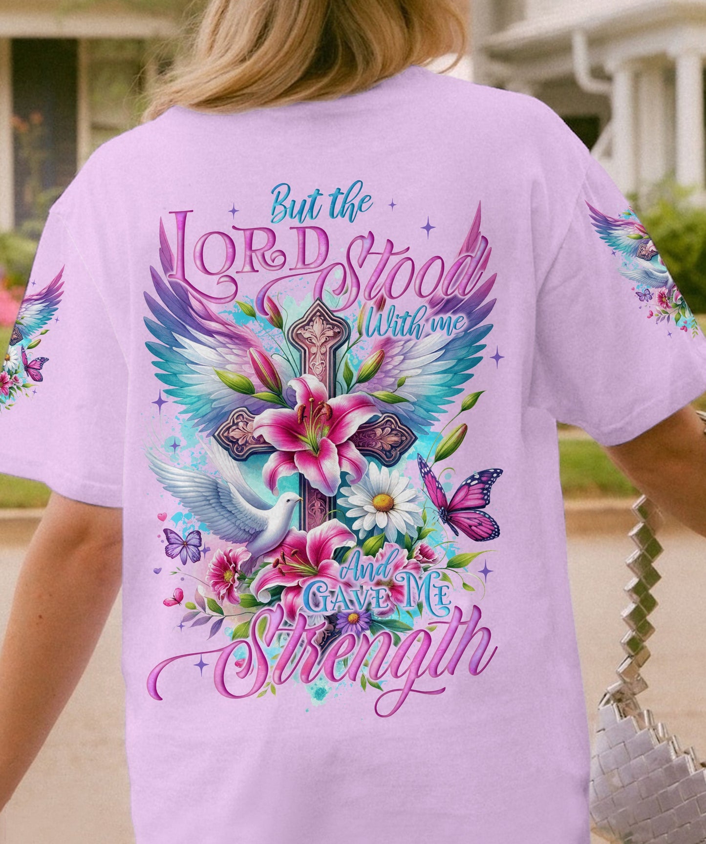 Enhance your expression of the Christian faith with our exquisite design! This artwork intricately weaves together timeless Christian symbols - crosses for redemption, wings for heavenly protection, lilies for purity, doves for peace, and butterflies for transformation. These elements harmoniously unite to form a visual masterpiece that encapsulates the depth of faith and spirituality. The accompanying quote, 'but the Lord stood with me and gave me strength,' serves as a poignant reminder of divine support during life's challenges. Discover inspiration and contemplation within this impressive and profound representation of Christian beliefs.