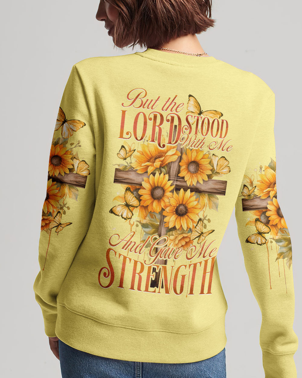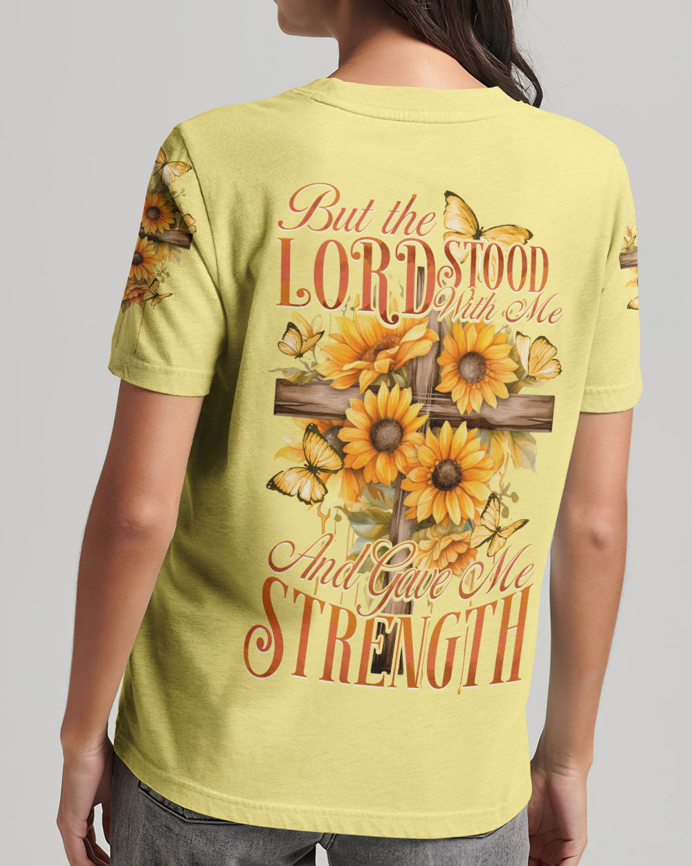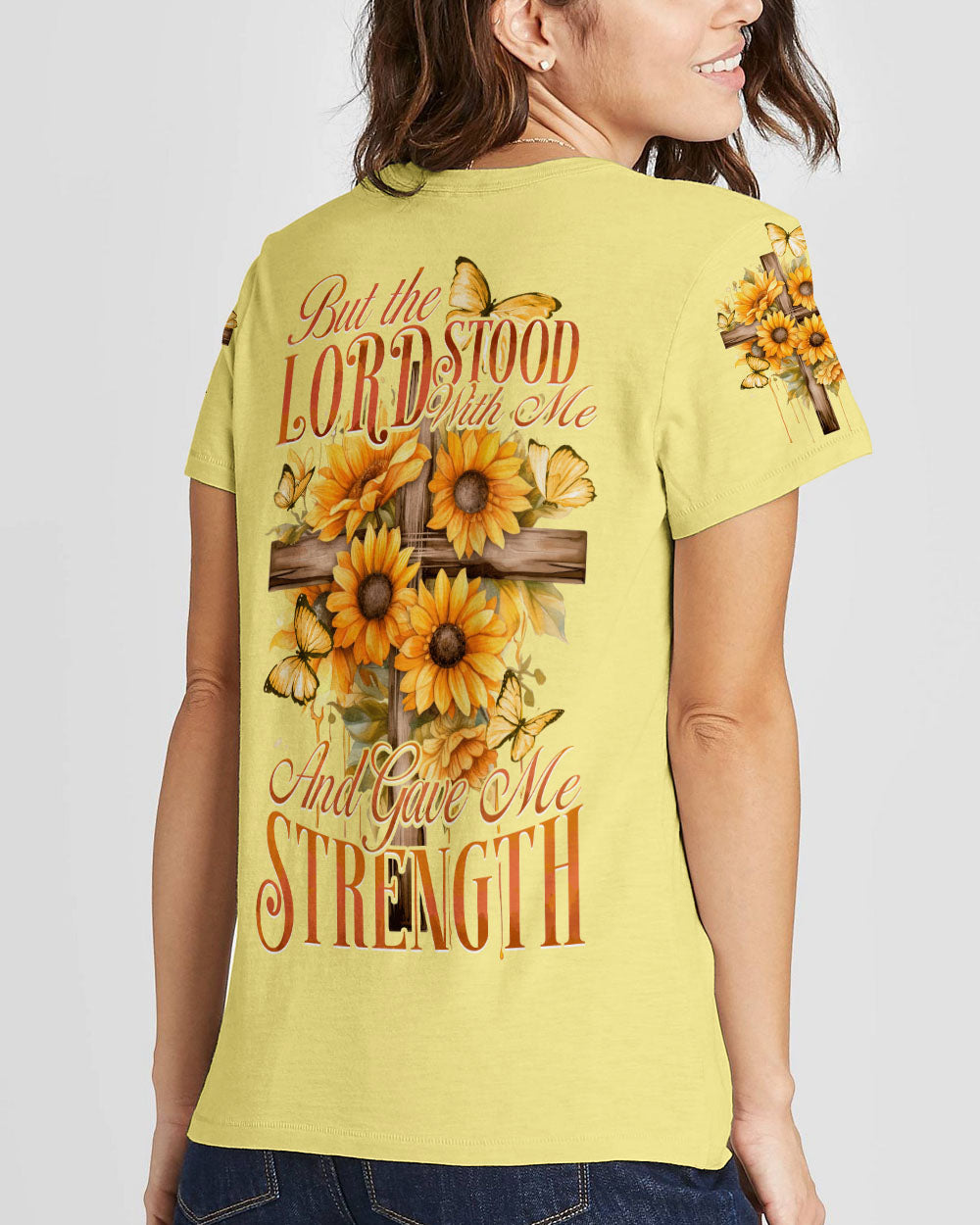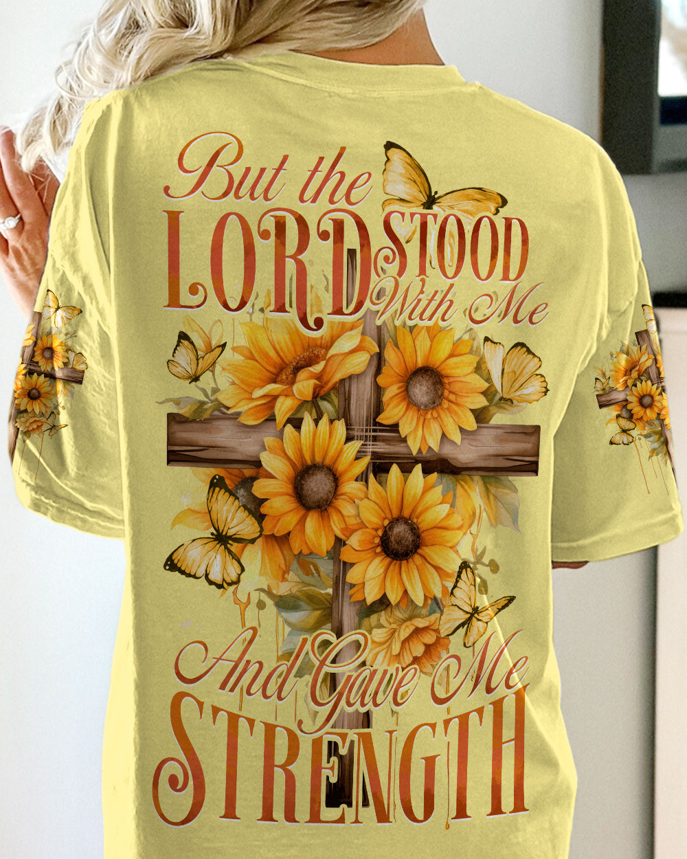 Illuminate your Christian faith with our design that flawlessly blends a cross, sunflower, butterfly, and the empowering quote: 'but the Lord stood with me and gave me strength.' This composition encapsulates profound spiritual essence, uniting devotion, resilience, and transformation. The cross embodies unyielding faith, the sunflower signifies enduring strength, and the butterfly represents growth. This design is a tribute to the steadfast support of faith. Prepare to be moved by the impactful message and the profound depth of this remarkable creation.
