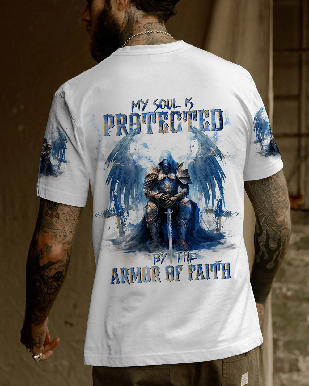 Stay strong and resilient with the My Soul Is Protected Men's All Over Print Shirt. An eye-catching design featuring outstretched wings symbolically represents unwavering trust in Jesus and the armor of faith that protects your soul. Show the world your deep conviction and inner strength with this powerful symbol of faith.