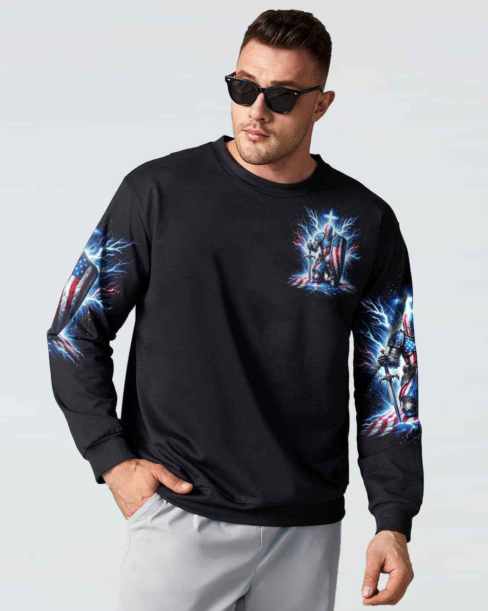 Feel the strength of unwavering faith in our powerful warrior design, humbly kneeling before a majestic, glowing cross. Embodying the sentiment of "No matter the storm, may your faith be stronger than your fear," this design serves as a poignant reminder that steadfast faith can provide the resilience needed to overcome fear and weather any storm with courage and conviction.