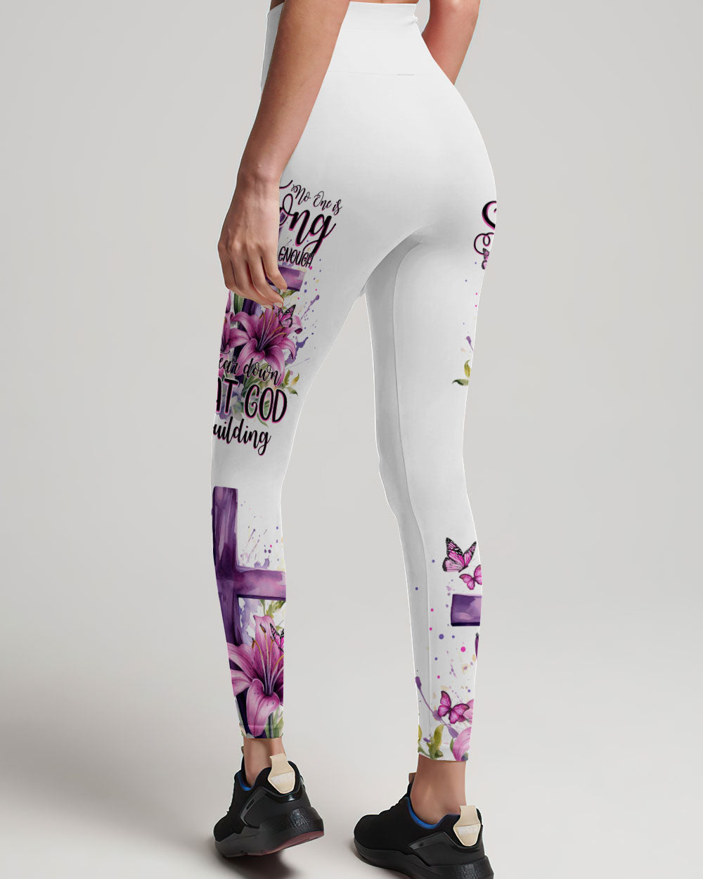 This beautiful all-over print shirt features an artistic fusion of crosses, lilies, and butterflies, with the inspirational message: 'no one is strong enough to tear down what God is building.' The perfect blend of symbols and words of faith come together to remind us of the unbreakable foundation of Christian belief and the strength that comes from God's divine plan. Celebrate and embrace your faith with this unique and meaningful design.