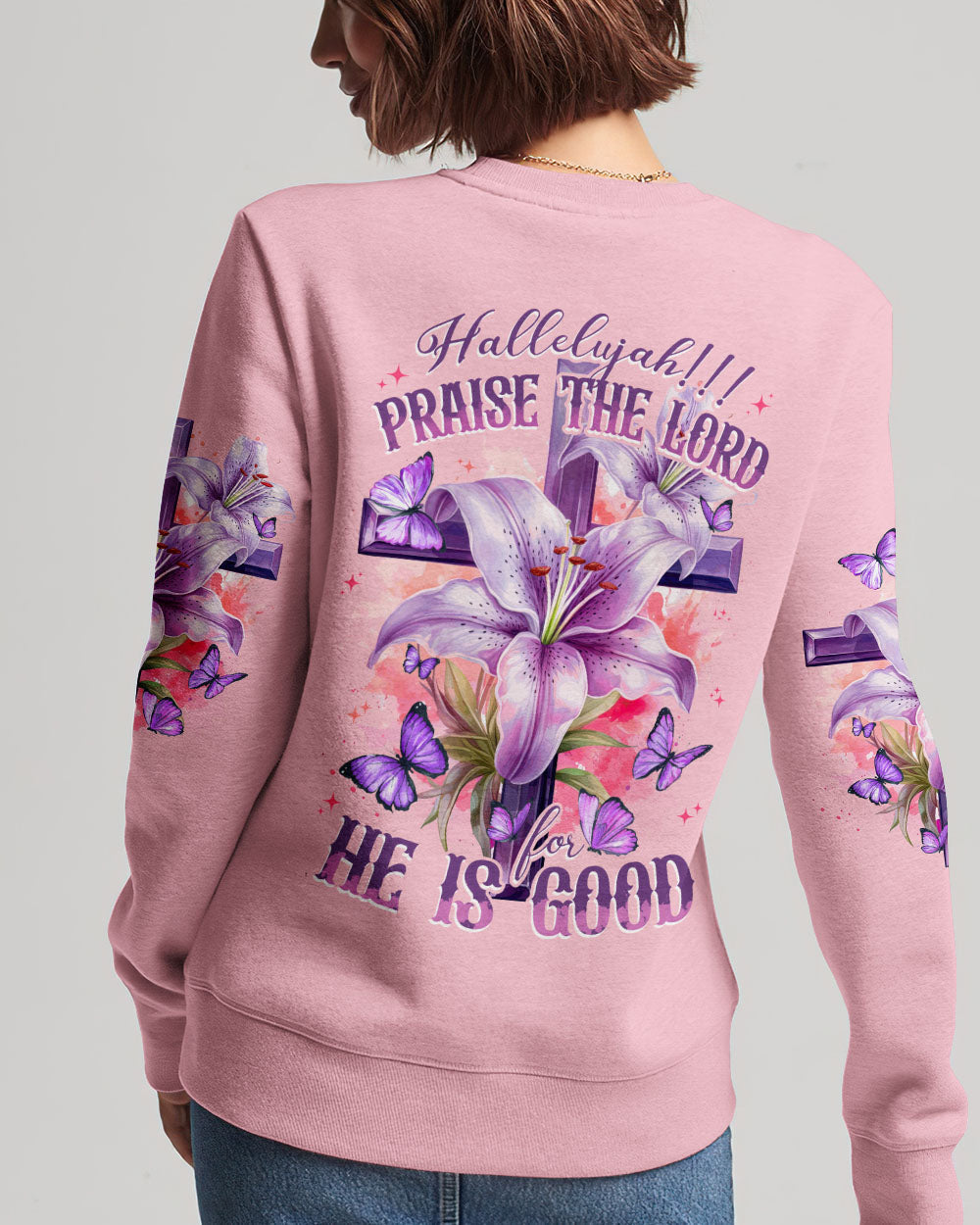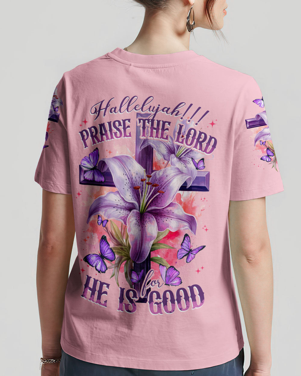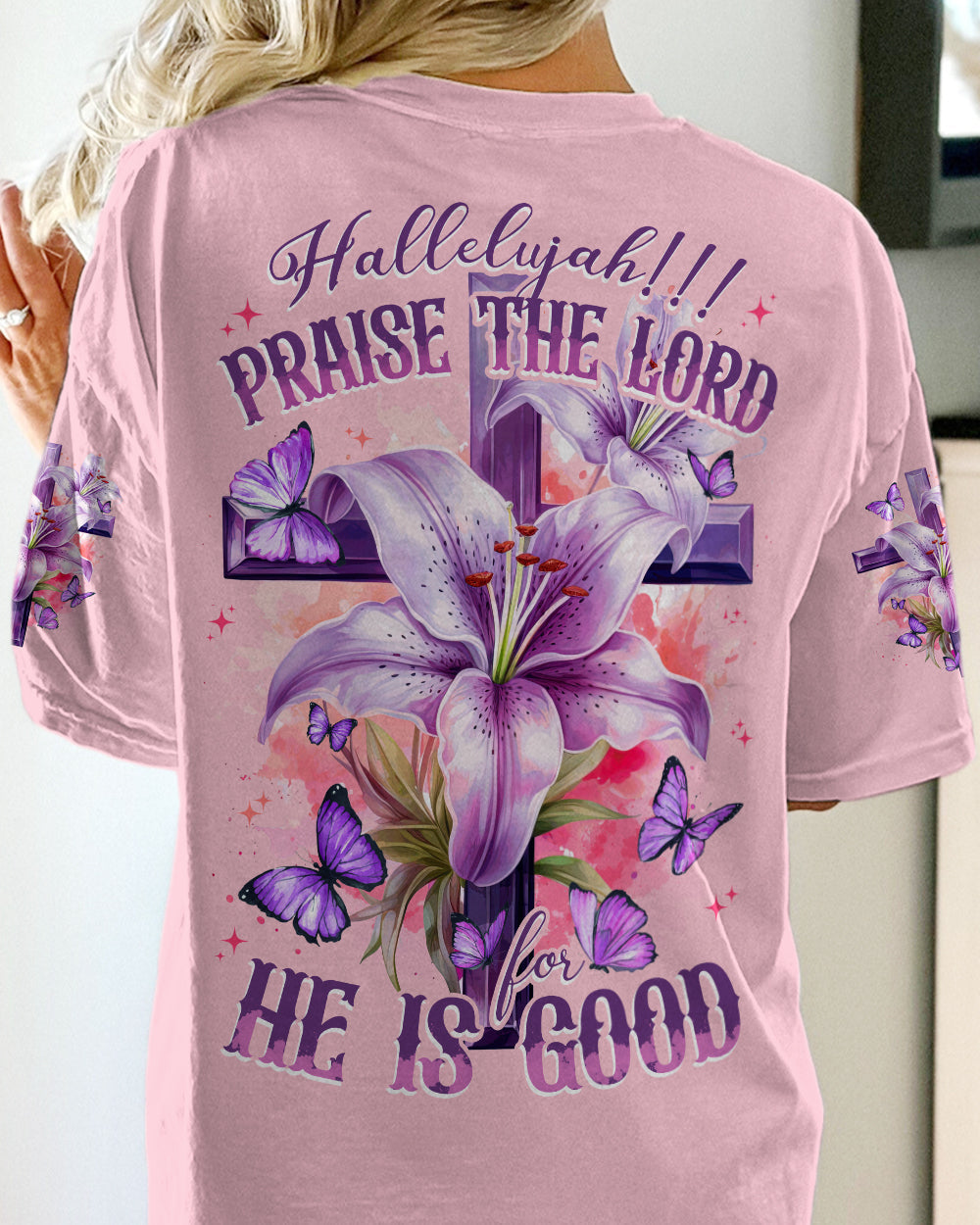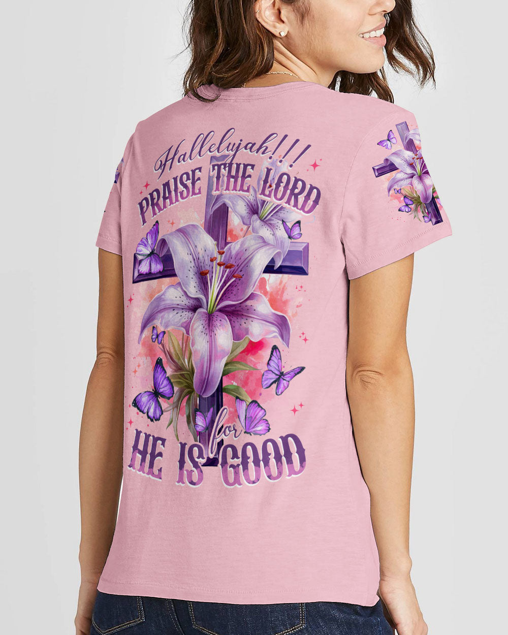 Let your faith sparkle with this elegant Praise The Lord Women's All Over Print Shirt. It features stunning symbols - crosses, lilies, butterflies - and the beautiful 'Hallelujah!!! Praise The Lord For He Is Good' quote symbolizing resurrection, transformation, and the Lord's goodness. Express your unwavering faith and gratitude with this design and embrace the Lord's goodness.