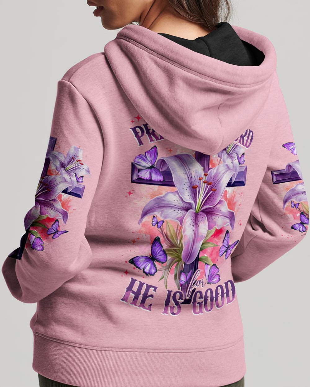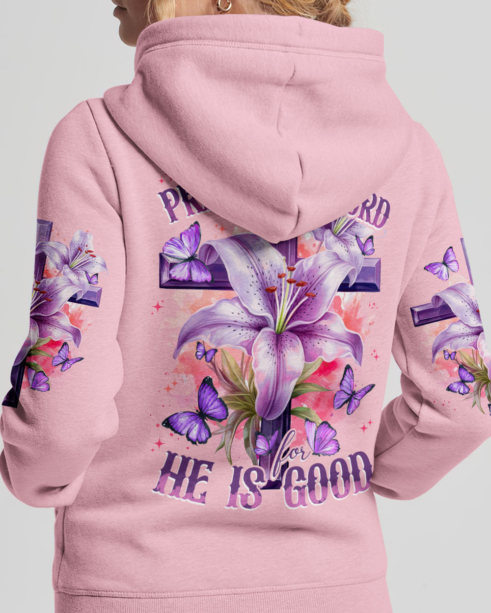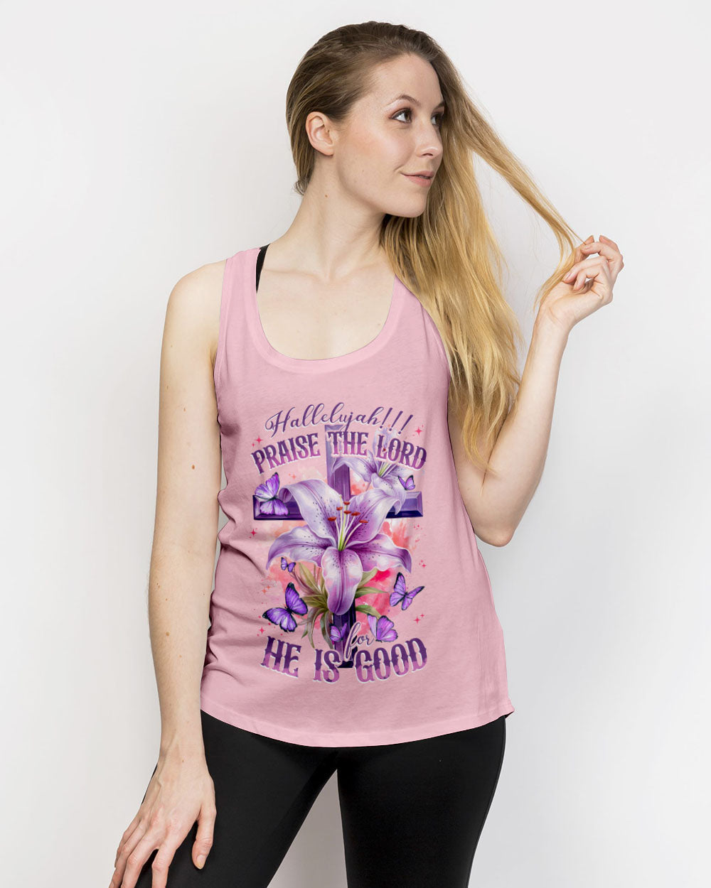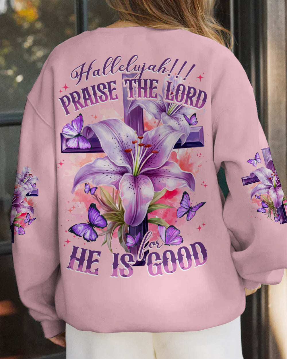 Let your faith sparkle with this elegant Praise The Lord Women's All Over Print Shirt. It features stunning symbols - crosses, lilies, butterflies - and the beautiful 'Hallelujah!!! Praise The Lord For He Is Good' quote symbolizing resurrection, transformation, and the Lord's goodness. Express your unwavering faith and gratitude with this design and embrace the Lord's goodness.