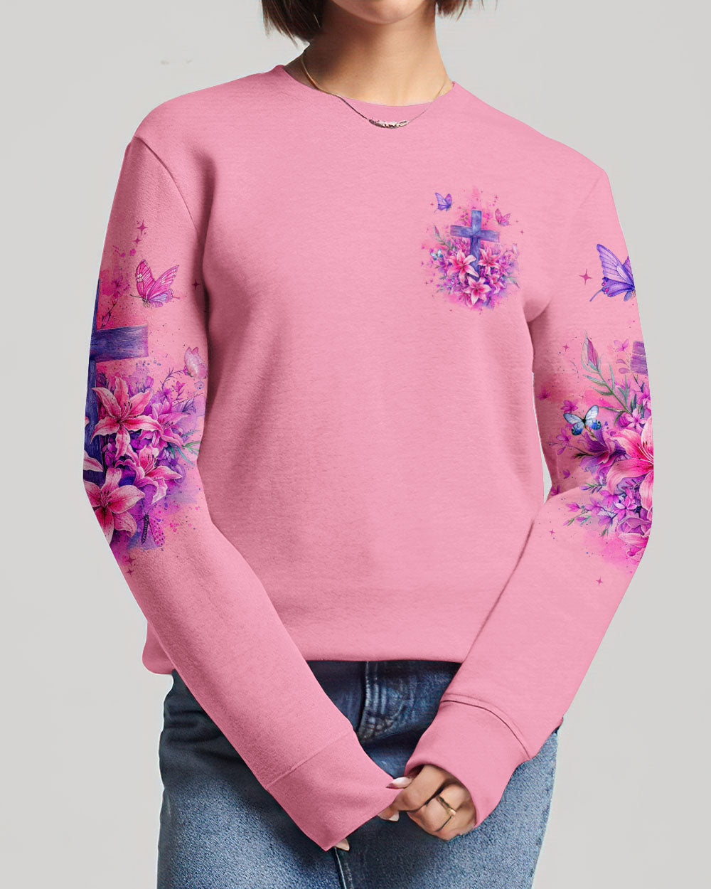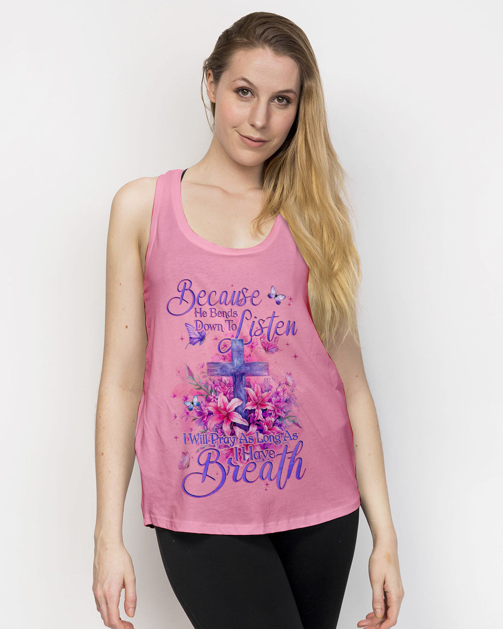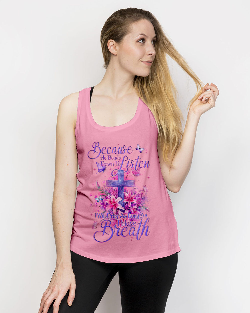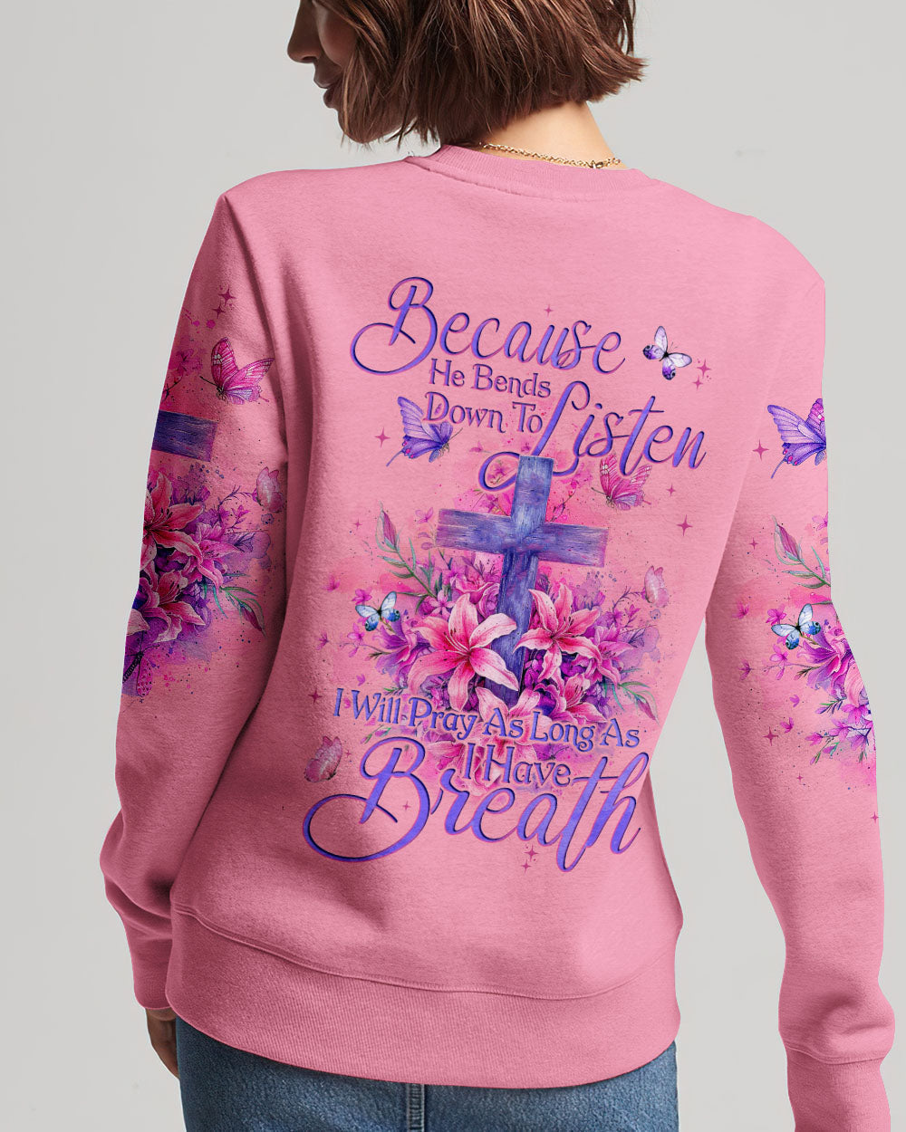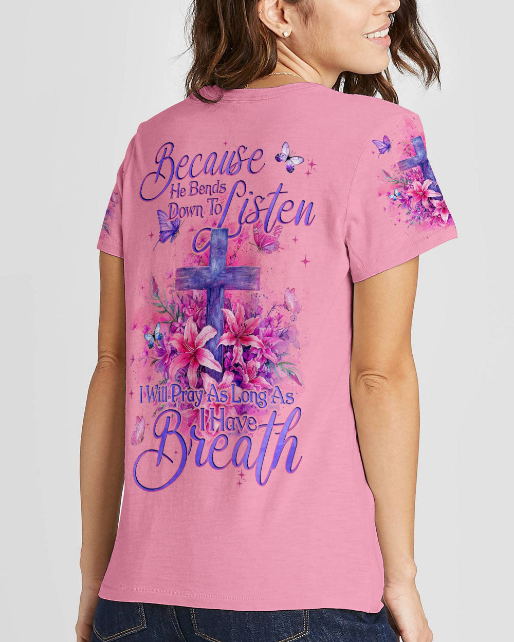 Elevate your prayer experience with our Pray As Long As I Have Breathe Women's All Over Print Shirt. Adorned with symbolic crosses, lilies, flowers, and butterflies, and the profound quote "because He bends down to listen, I will pray as long as I have breath," this shirt serves as a powerful reminder of the beauty and transformative power of prayer. Embrace the enduring commitment to devotion and faith with this visually captivating design.