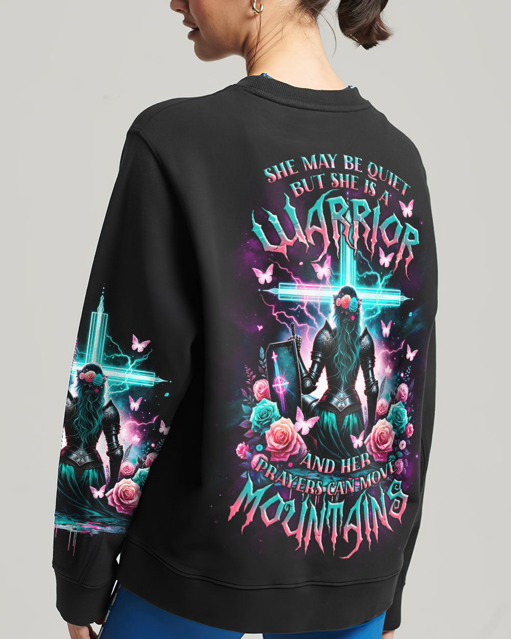 This powerful all over print shirt features a female warrior kneeling under the cross, surrounded by flowers, and the words, "She may be quiet, but she is a warrior, and prayers can move mountains." With a quiet strength and powerful faith, this design symbolizes the capacity to overcome any challenge.