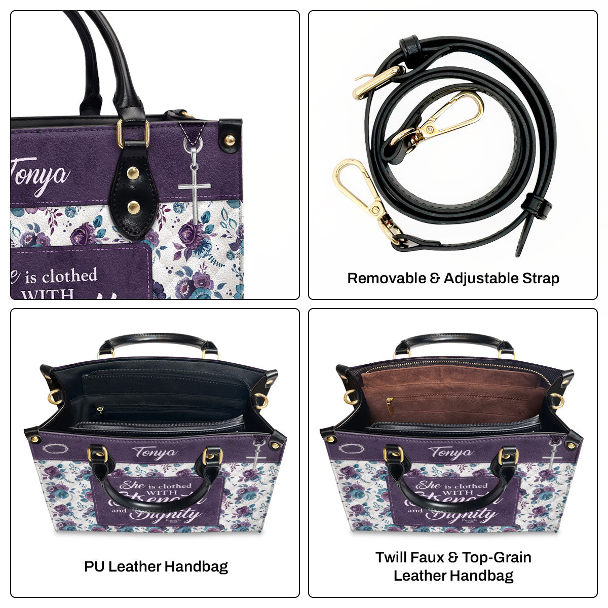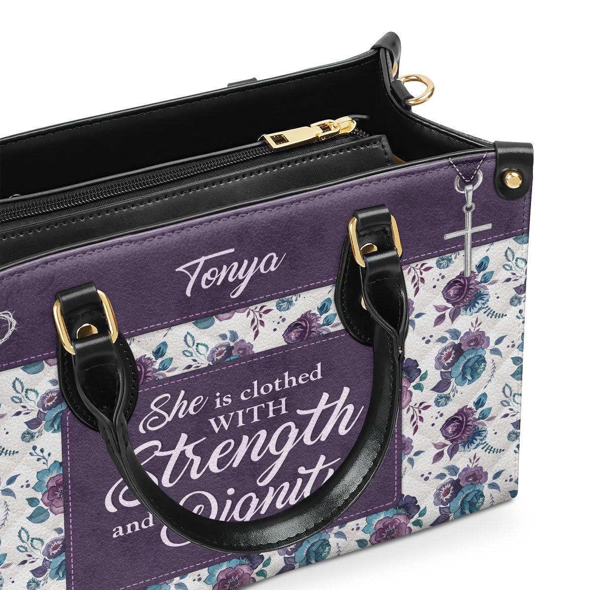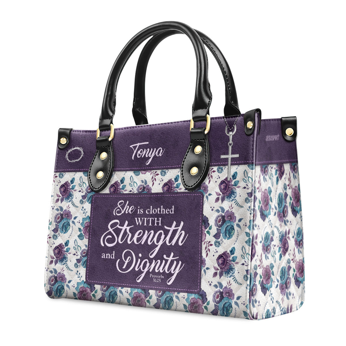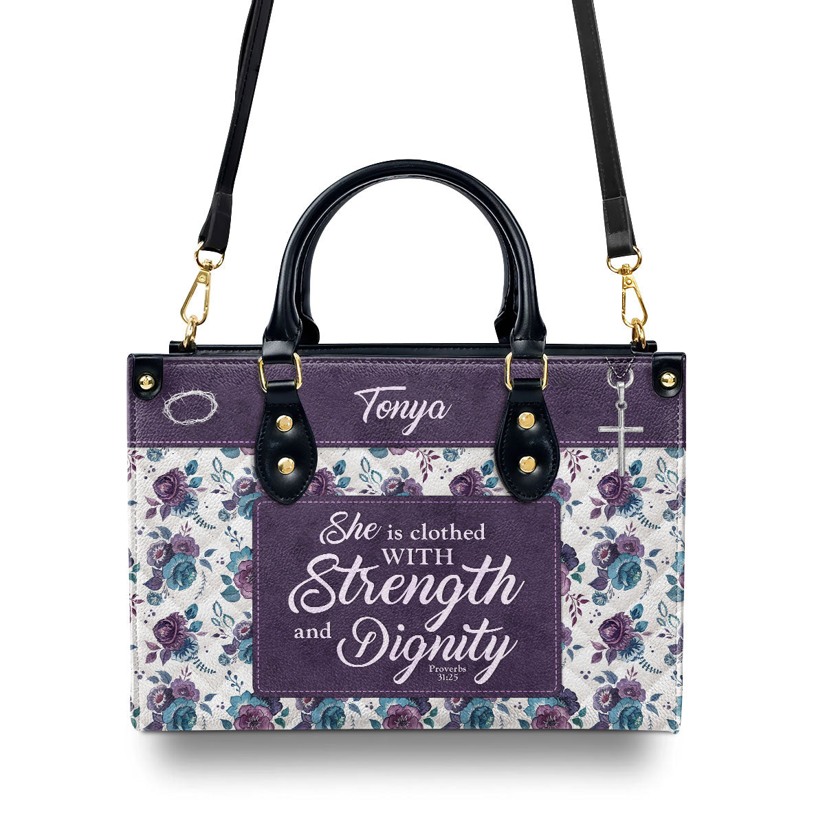 Proverbs 31:25 | Personalized Leather Handbag With Handle | She Is Clothed With Strength and Dignity | Religious Gift For Female Pastors LHBHN804