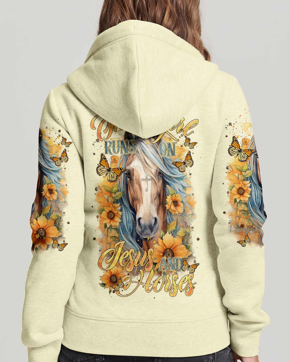 Show the bond between girls, horses, and faith with our lovely horse design with yellow flowers. The quote "This Girl Runs on Jesus and Horses" shows a special mix of spiritual and equestrian love, sharing the deep impact of faith and the happiness of having horses as friends in the lives of these lively people.