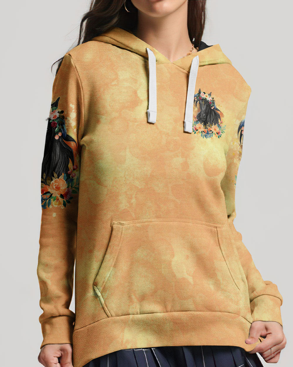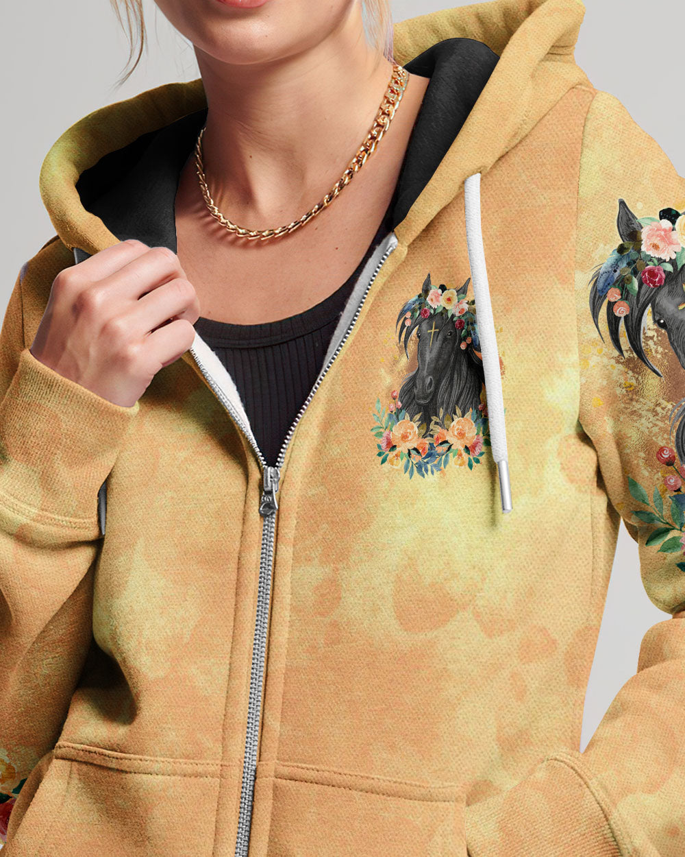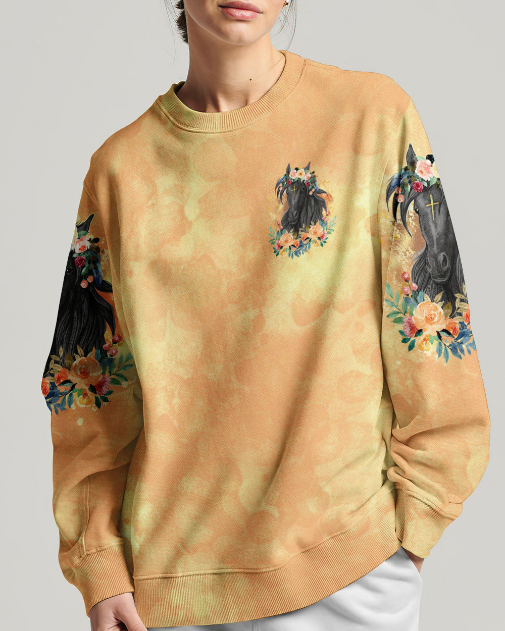 Show the world your faith and passion with this stunning all-over print. Featuring a majestic horse and blooming flowers, this design conveys your devotion to Jesus and horses. A symbol of strength, purpose, and grace perfect for your daily journey.