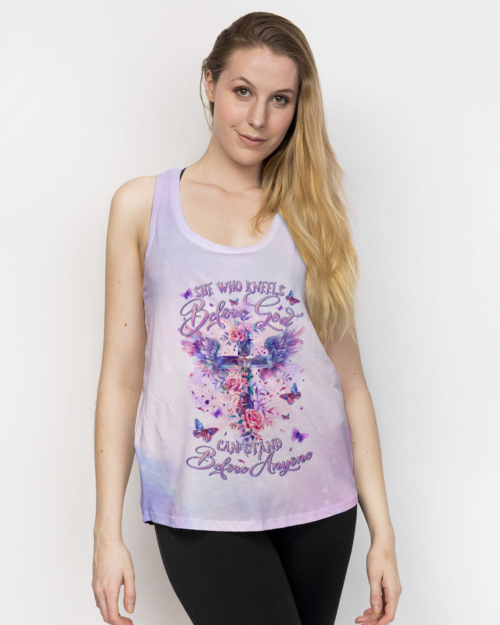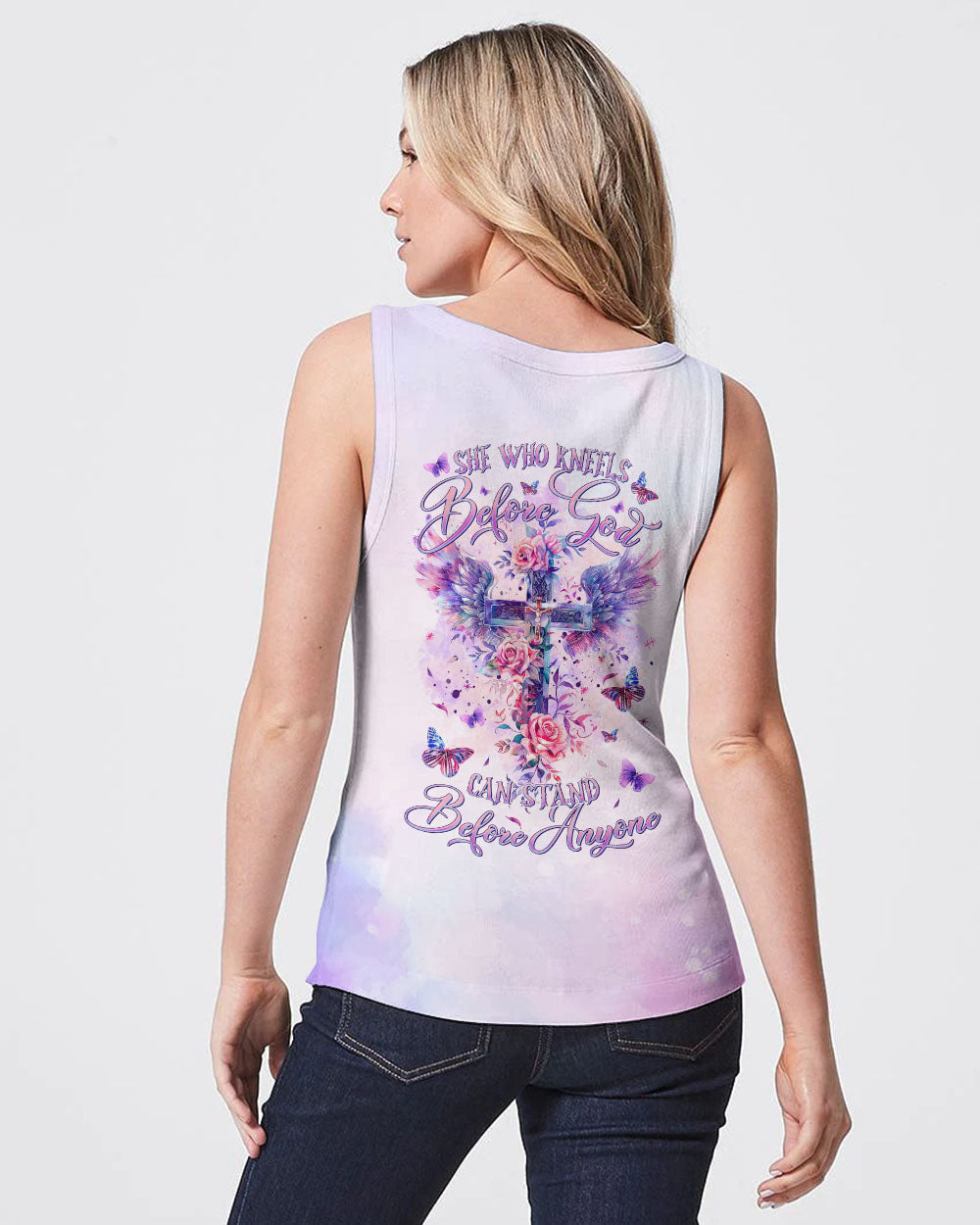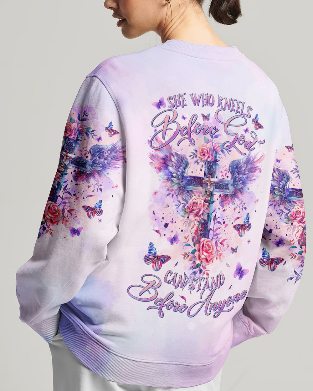Elevate your faith with our She Who Kneels Before God All Over Print Shirt. Featuring a powerful cross wings design and the inspiring quote "She who kneels before God can stand before anyone," this shirt represents strength, courage, and resilience in the face of challenges. Embrace the symbolic meaning and embody the power of humility and reverence.