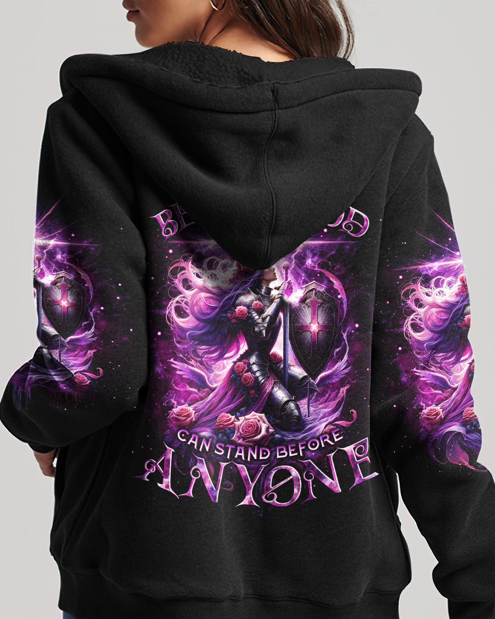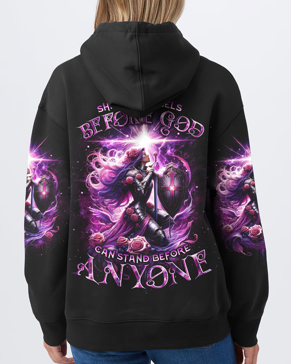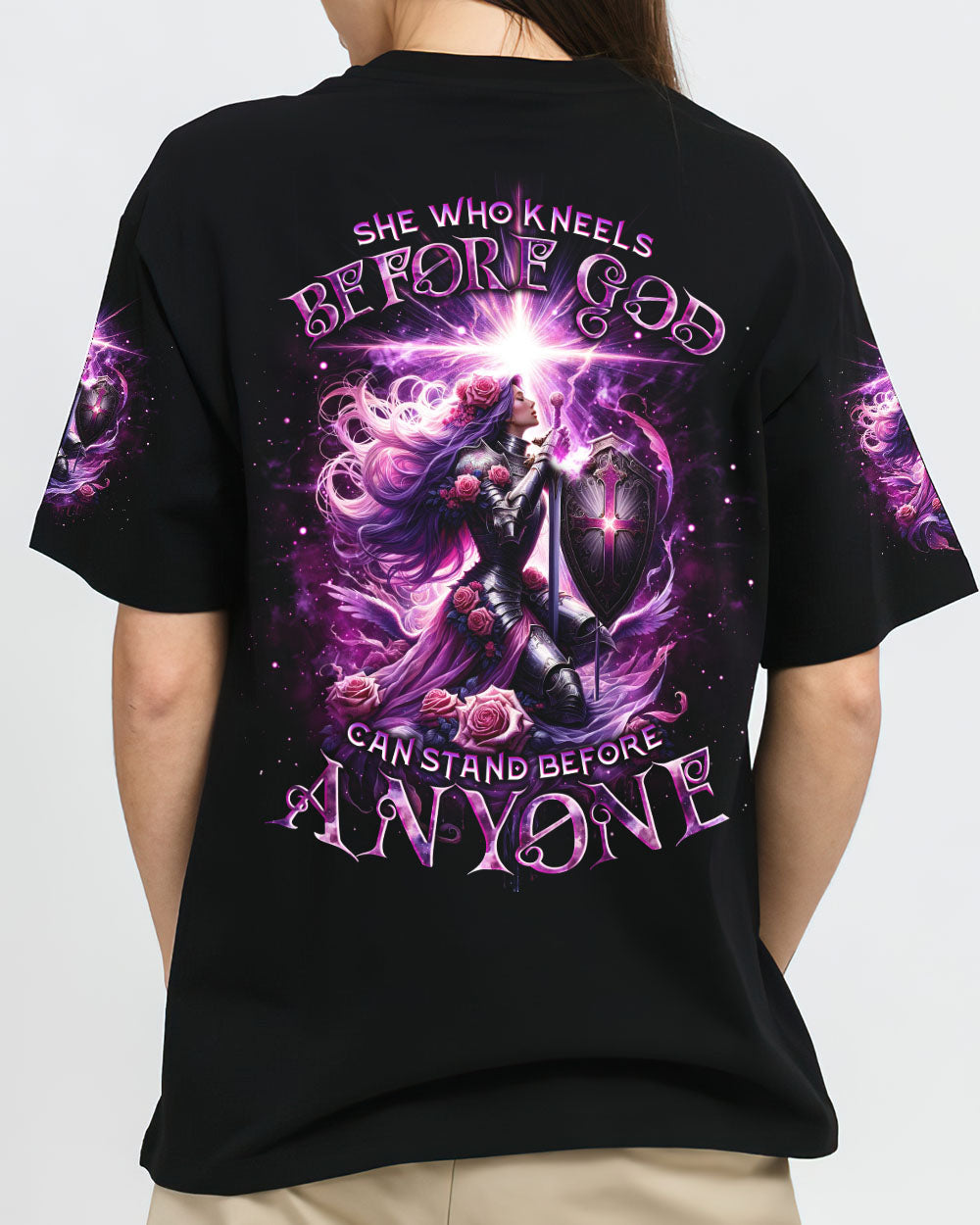 Embrace strength with our fierce female warrior design, featuring beautiful roses, a symbol of faith in Jesus. The statement "She who kneels before God can stand before anyone" reflects the power of humble faith and prayer, granting resilience to face life's challenges with unwavering resolve.