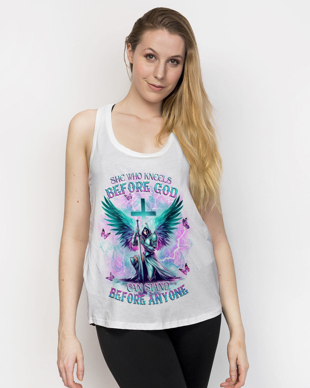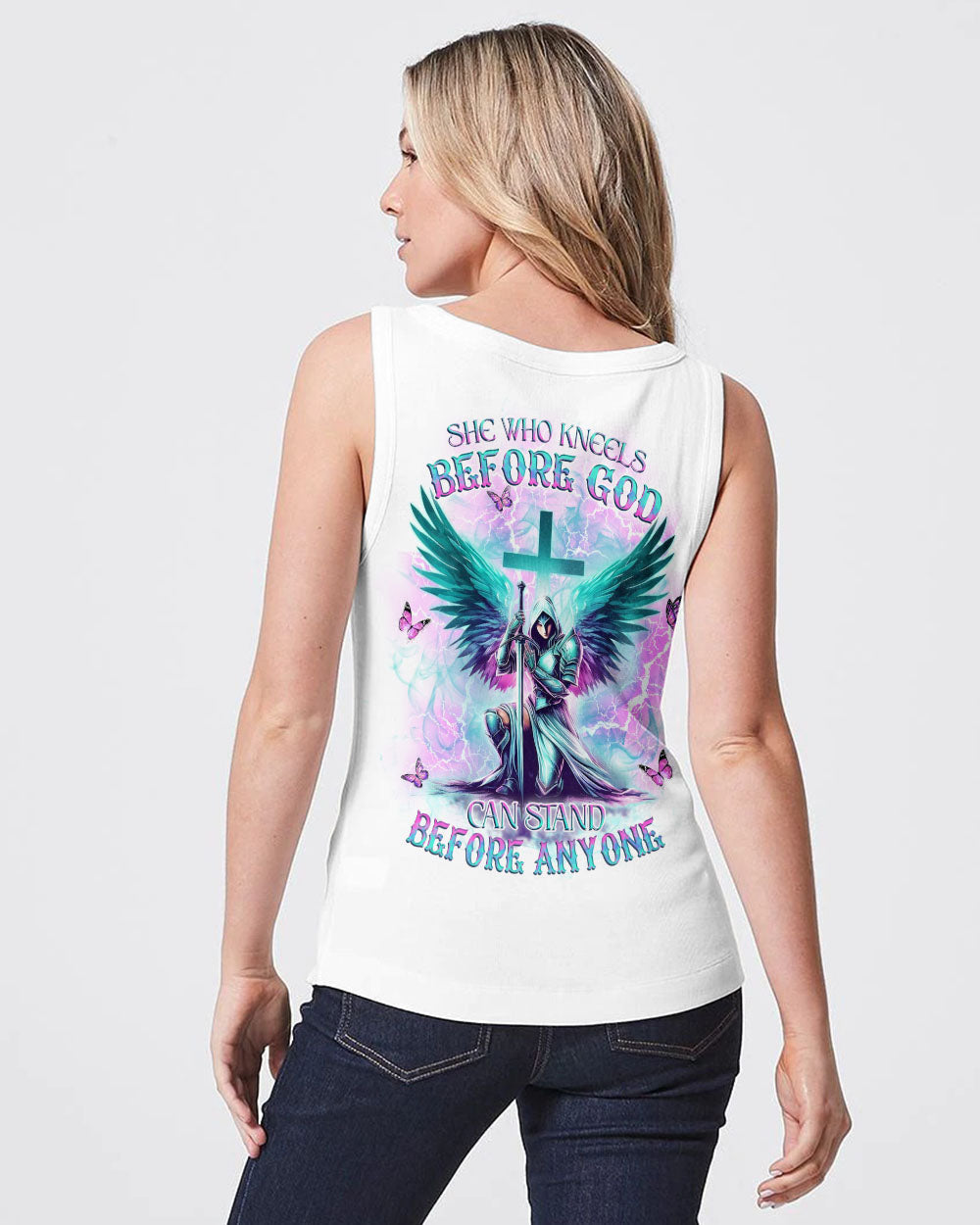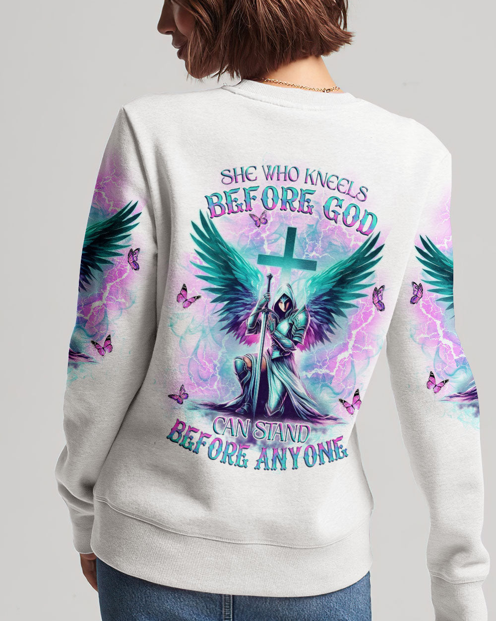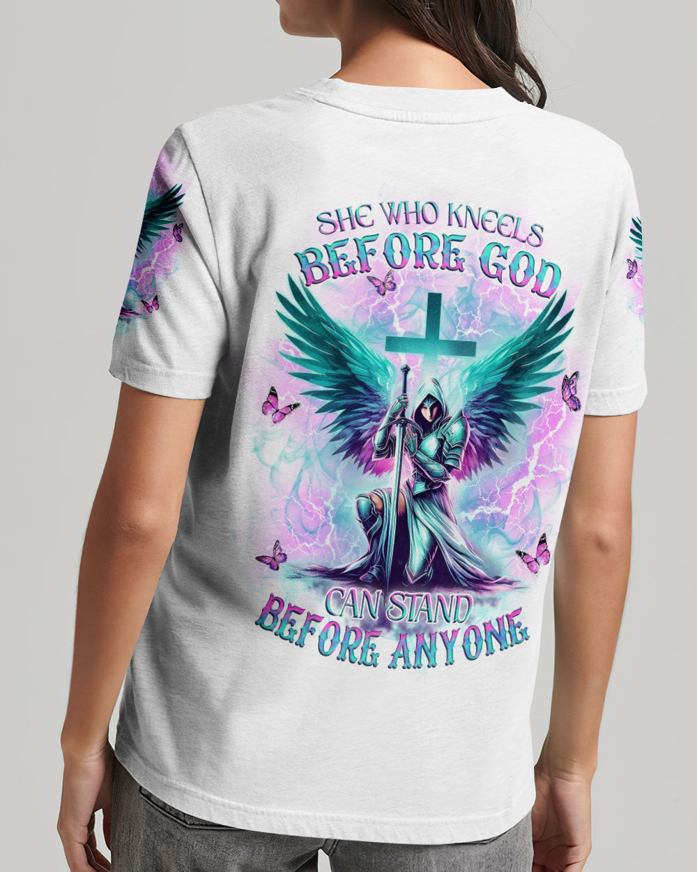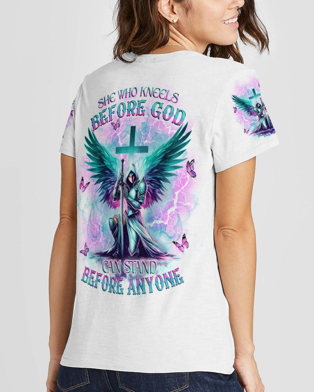 Step into divine strength with our Faith Christ Design. The empowering quote, "She who kneels before God can stand before anyone," encapsulates resilience and spiritual fortitude. More than clothing, it's a wearable testament to the unyielding power of faith. Radiate strength and grace – order now and let your style speak volumes about the warrior within!