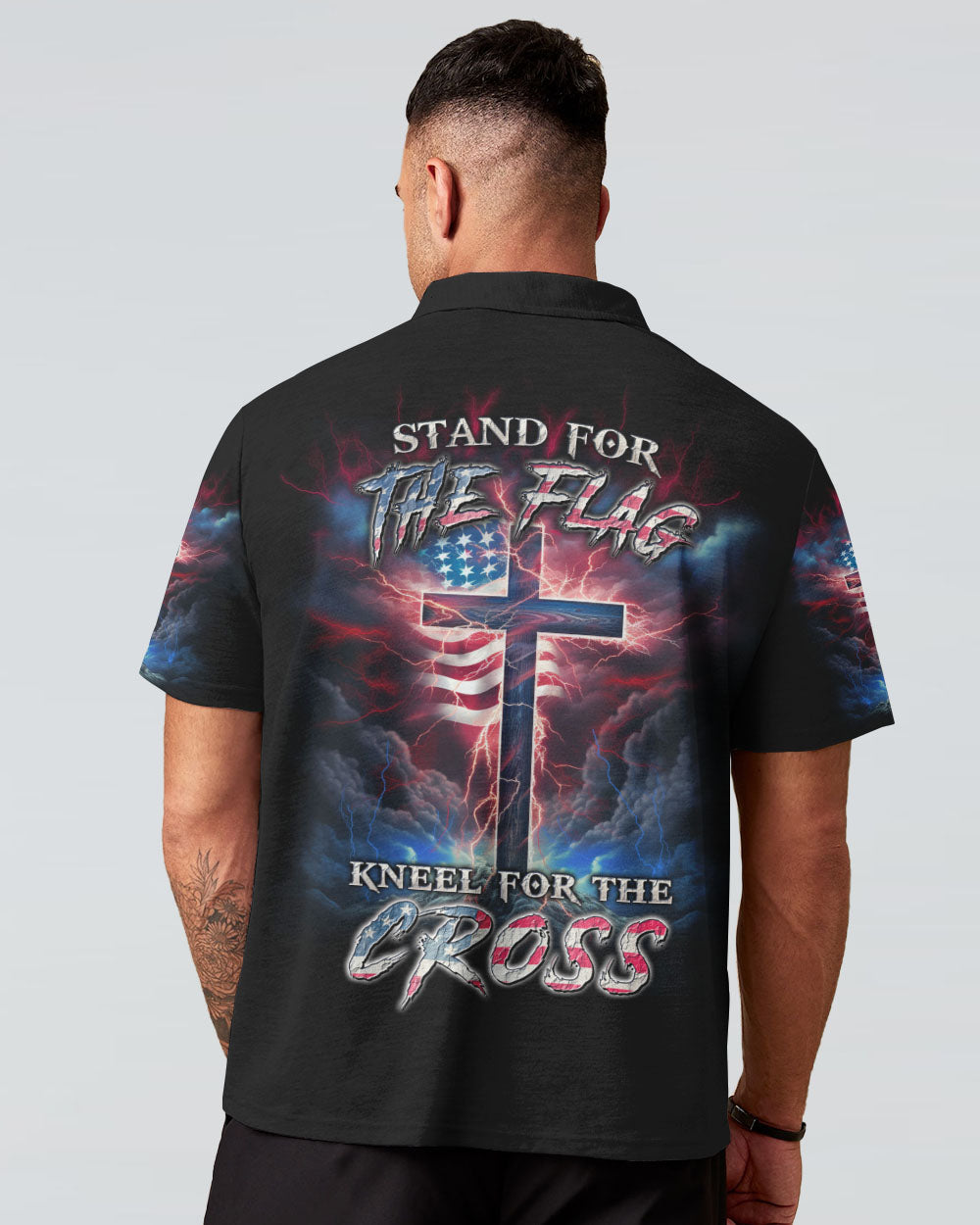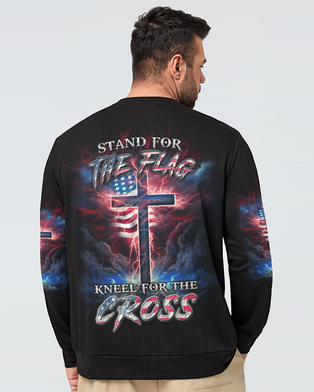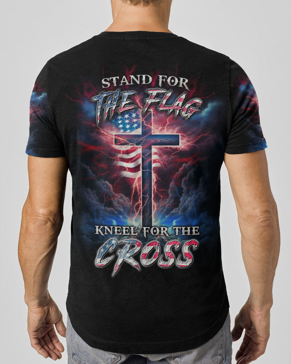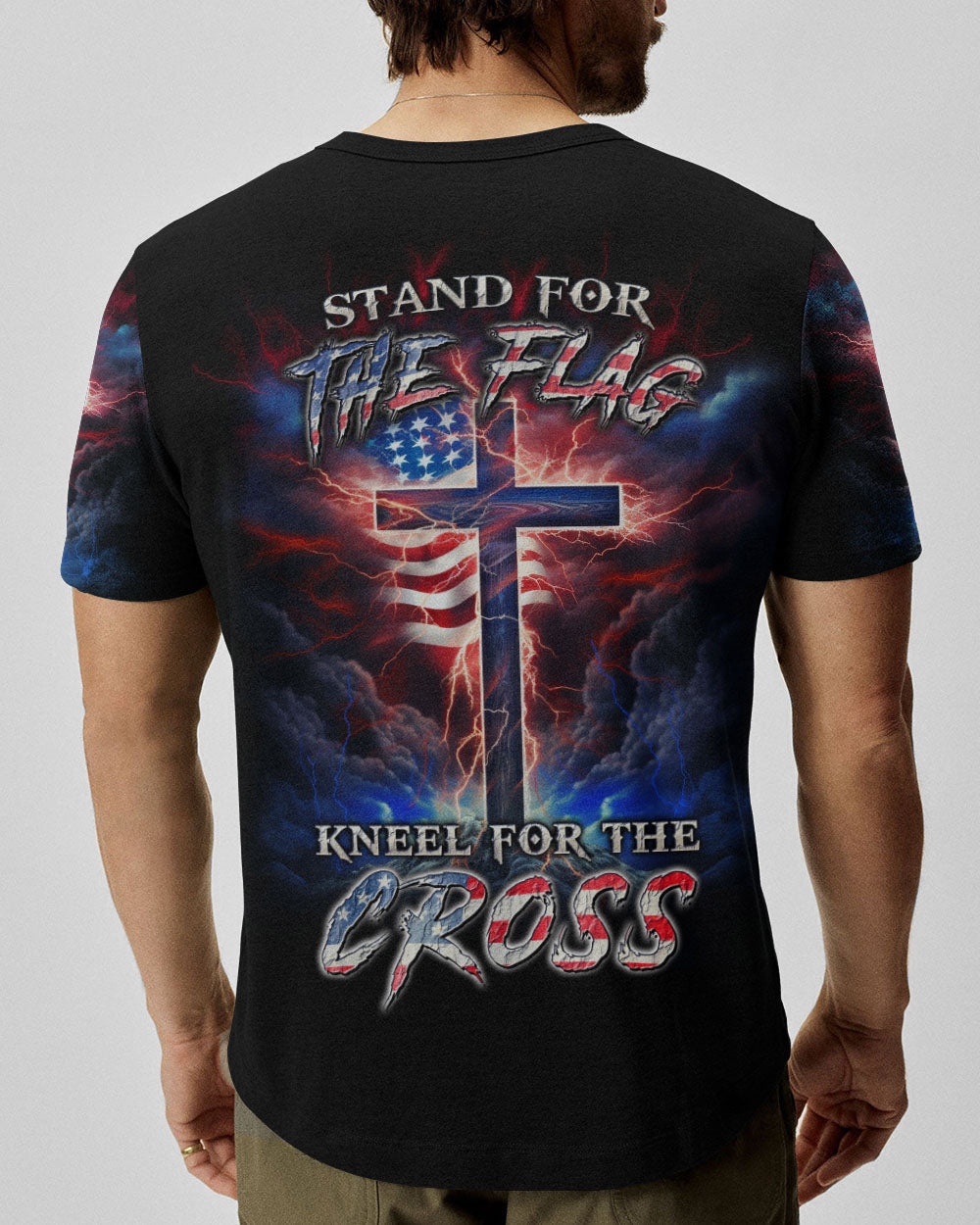 Courageously represent faith and country in our Stand For The Flag Kneel For The Cross Men's All Over Print. Carefully crafted with attention to detail, this design is a symbol of unwavering belief and love for your nation. Show off your patriotism and spiritual joy with this unique fusion of faith and country. Wear your beliefs, and join others in standing strong for freedom, unity and faith.