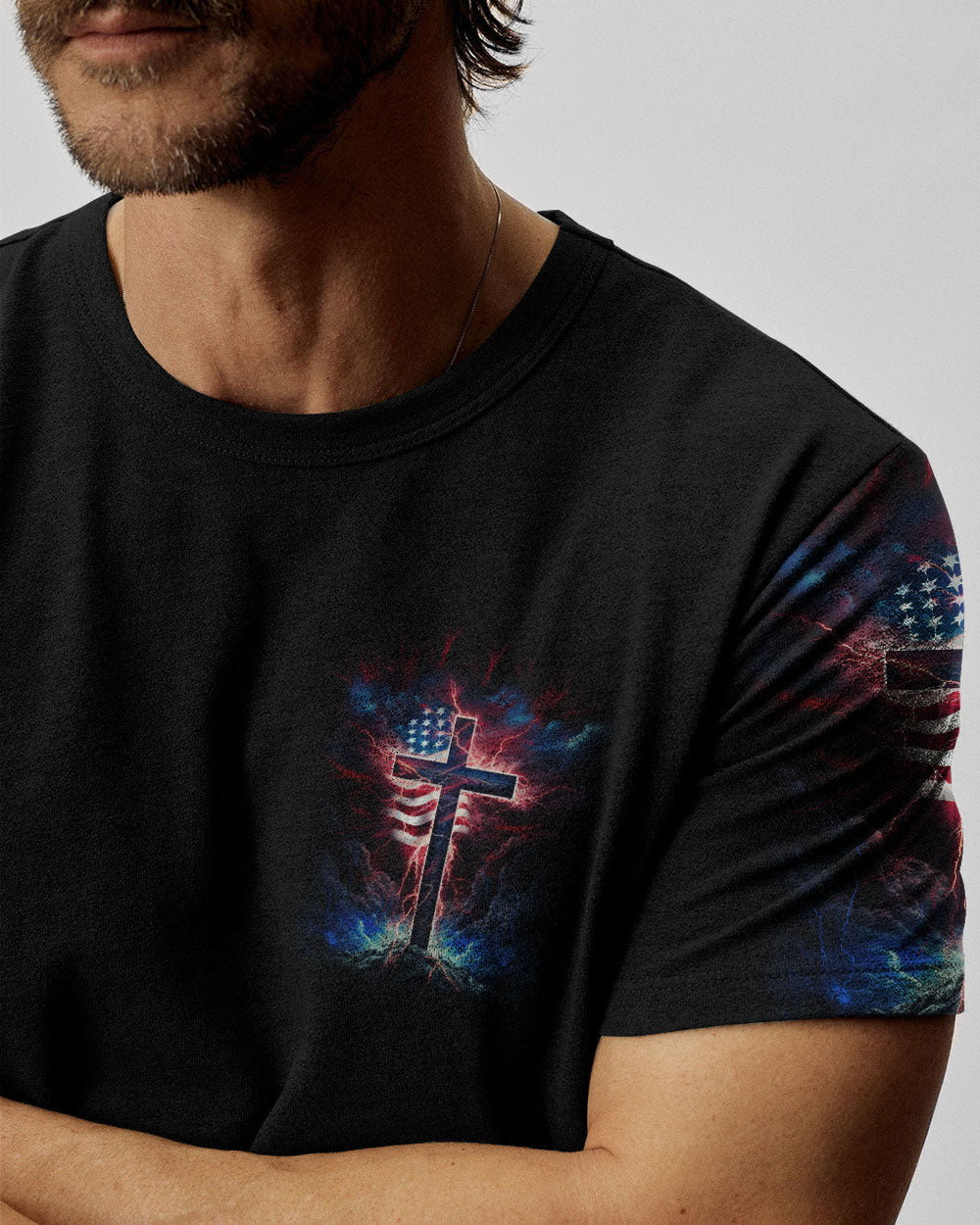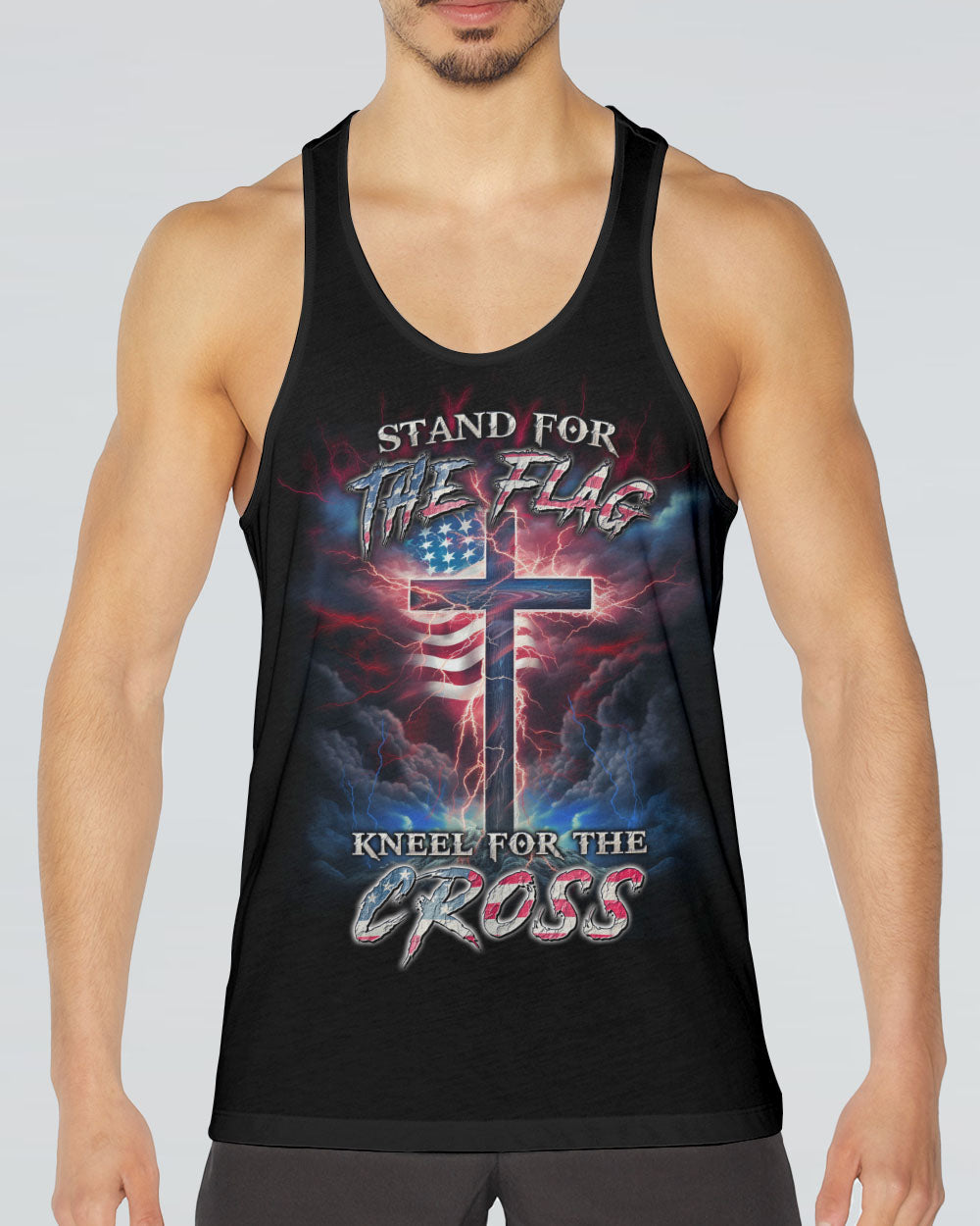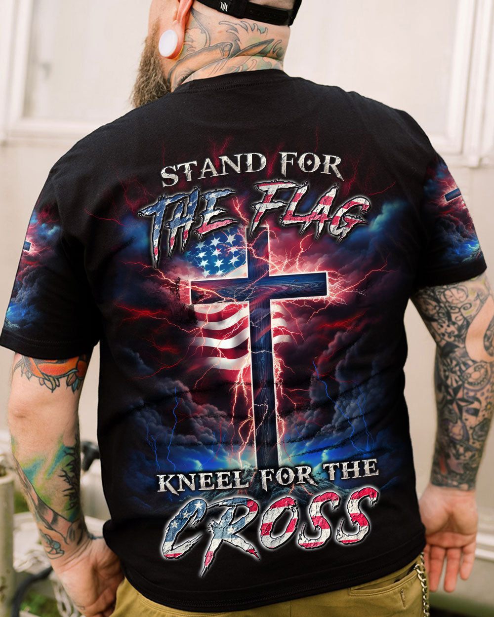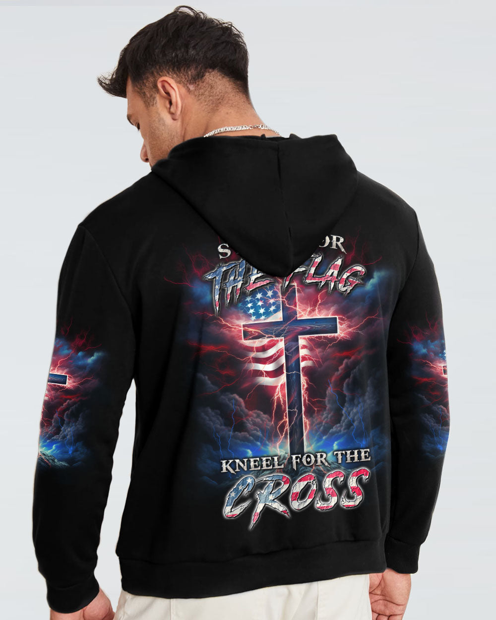 Courageously represent faith and country in our Stand For The Flag Kneel For The Cross Men's All Over Print. Carefully crafted with attention to detail, this design is a symbol of unwavering belief and love for your nation. Show off your patriotism and spiritual joy with this unique fusion of faith and country. Wear your beliefs, and join others in standing strong for freedom, unity and faith.