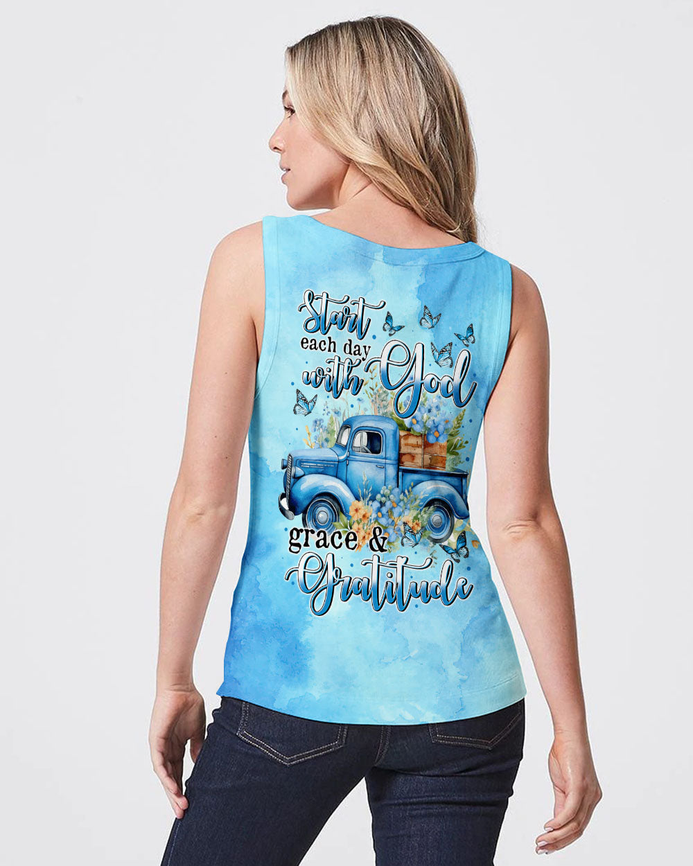 Immerse yourself in a stunning design where Christian values come to life! Our mobile garden of God's grace is embodied in a truck adorned with vibrant, blooming flowers. Playful butterflies dance around, symbolizing the freedom and joy that a faith-centered life brings. Let the impactful quote "Start each day with God, grace, and gratitude" be your daily mantra, anchoring your spiritual journey. This composition not only celebrates nature's beauty but also serves as a daily reminder of the profound connection between faith and a grateful heart.