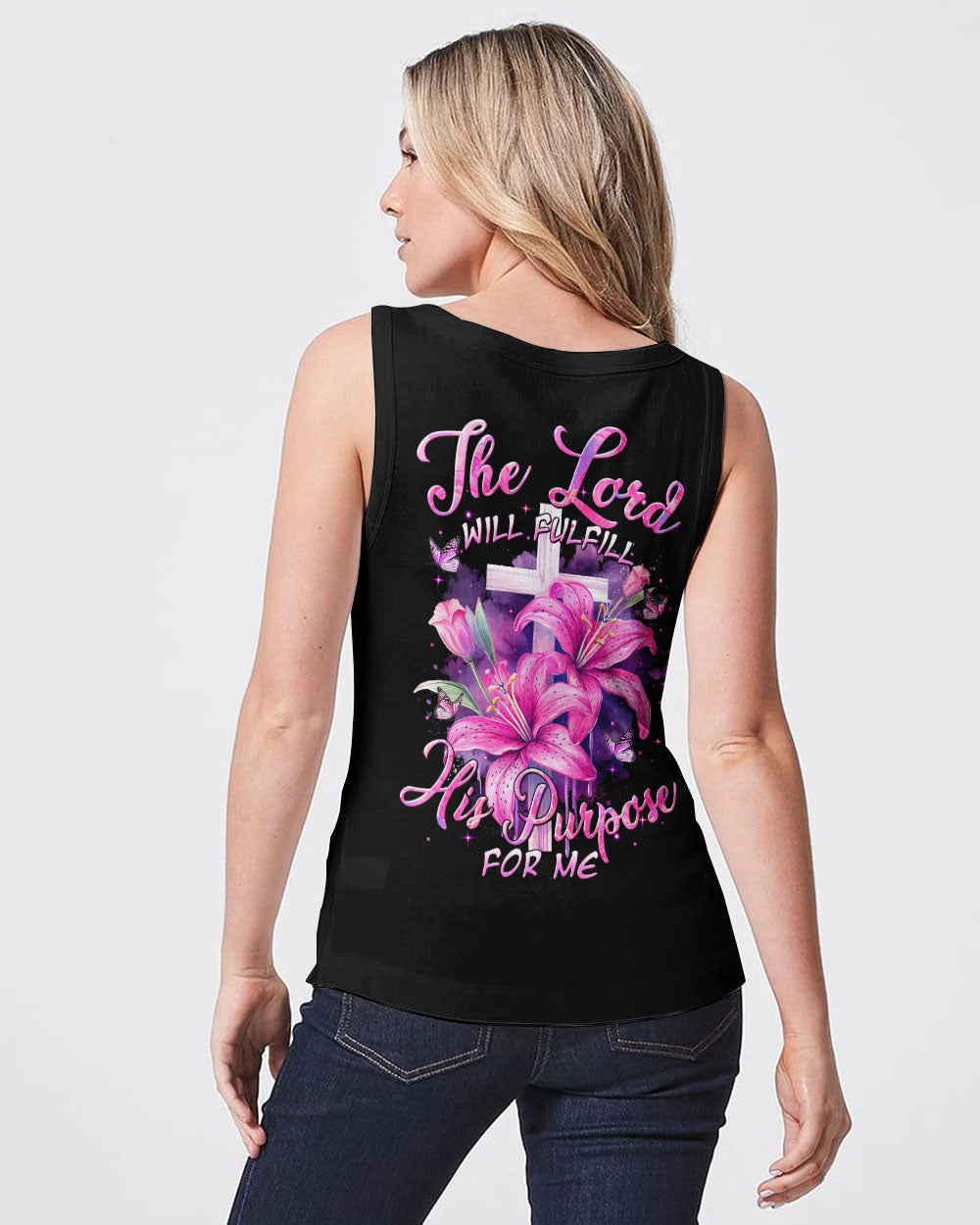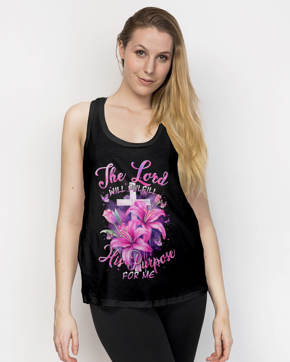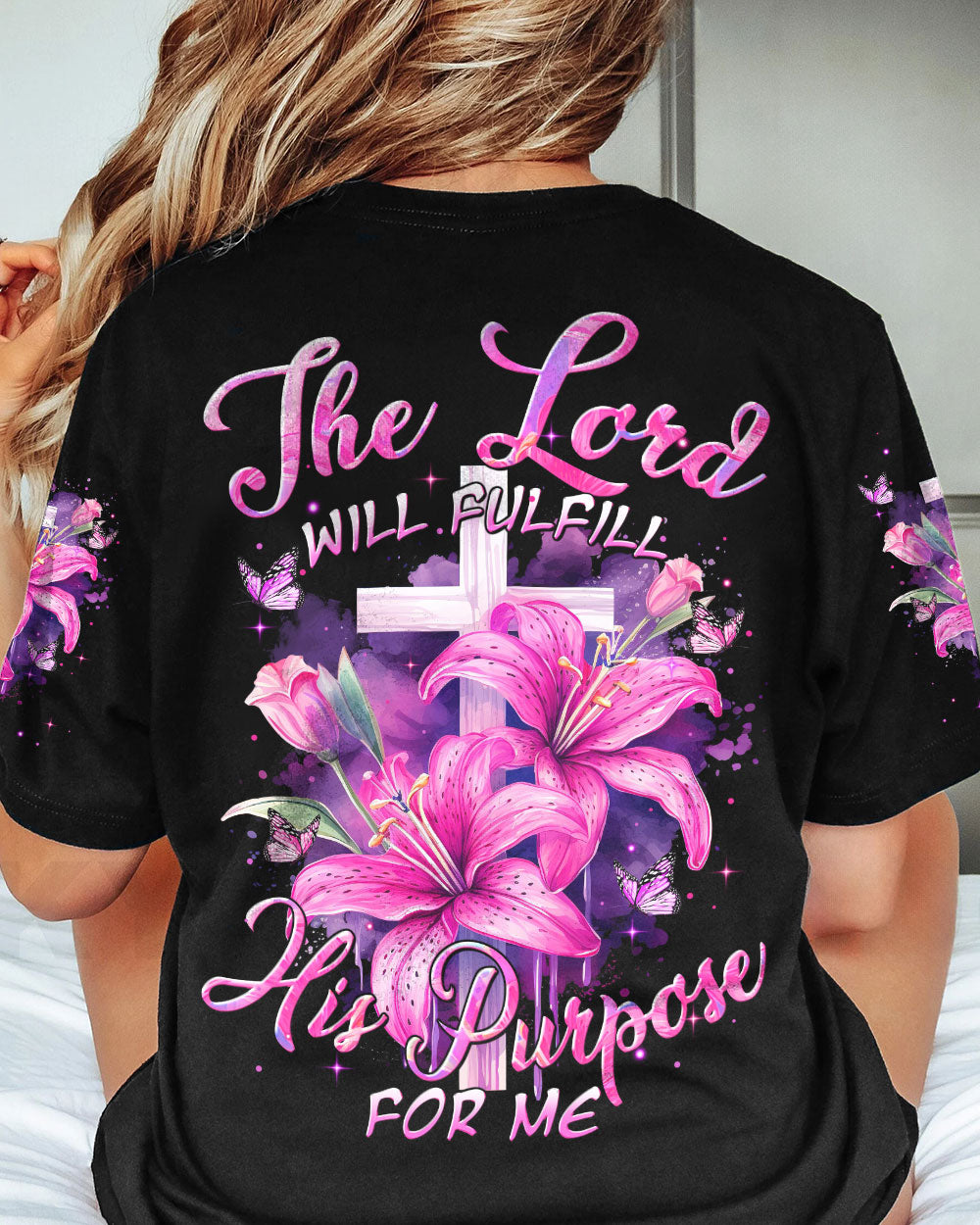 Elevate your faith with our stunning all over print shirt, featuring a powerful message: "The Lord will fulfill his purpose for me." Graceful crosses, blooming lilies, and transformative butterflies embody the divine plan woven into our lives. Immerse yourself in this design, a visual proclamation of the guidance and fulfillment found in the Lord's purpose.