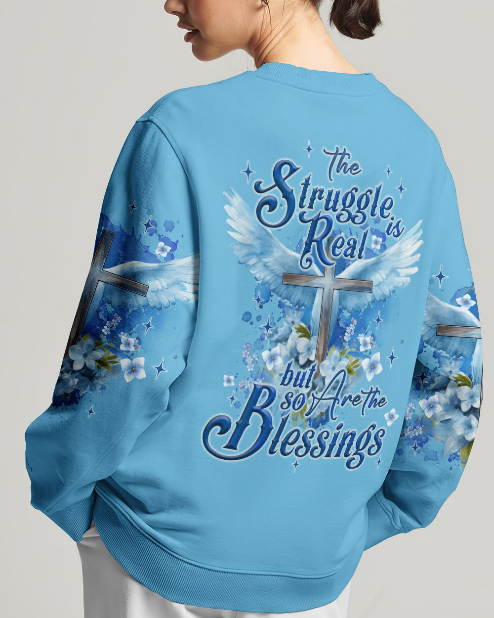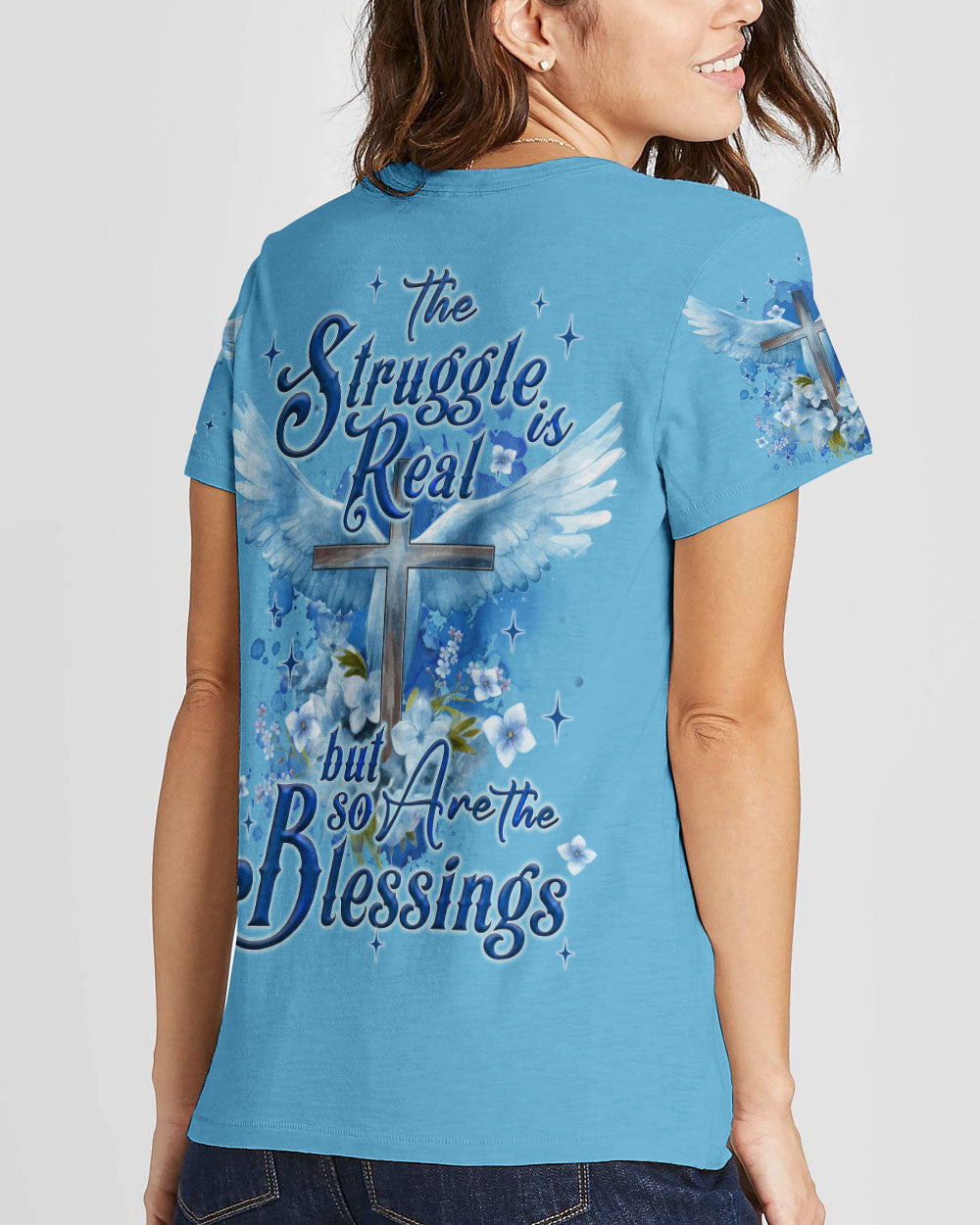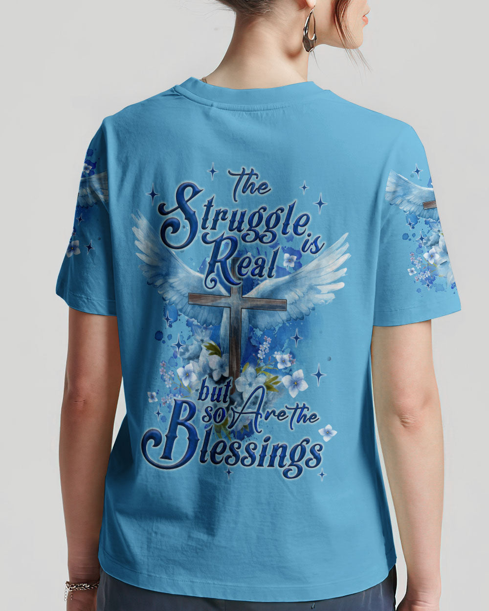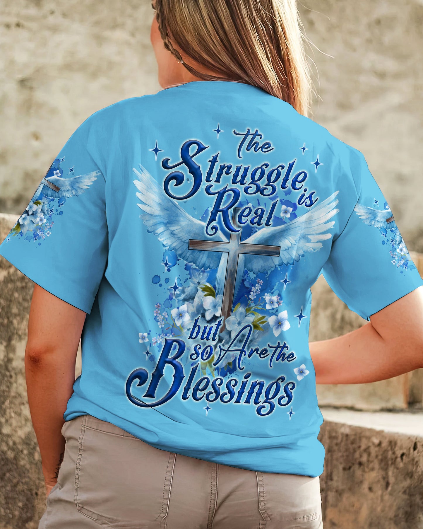 This Struggle is Real Women's All Over Print Shirt displays an inspiring message of faith and strength with its tranquil image of a cross adorned with flowers and angelic wings. Let this powerful design be a reminder of blessings, even through life's struggles, and be inspired on your spiritual journey.