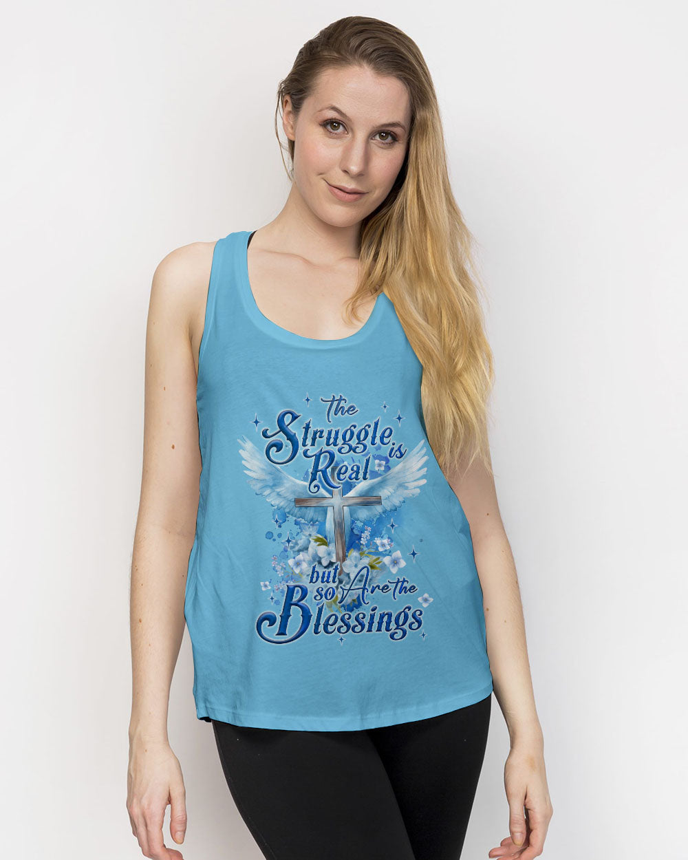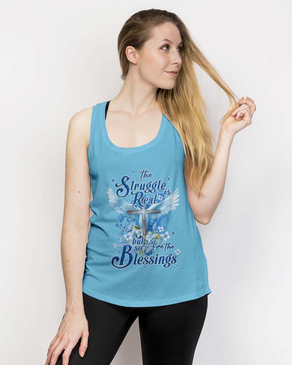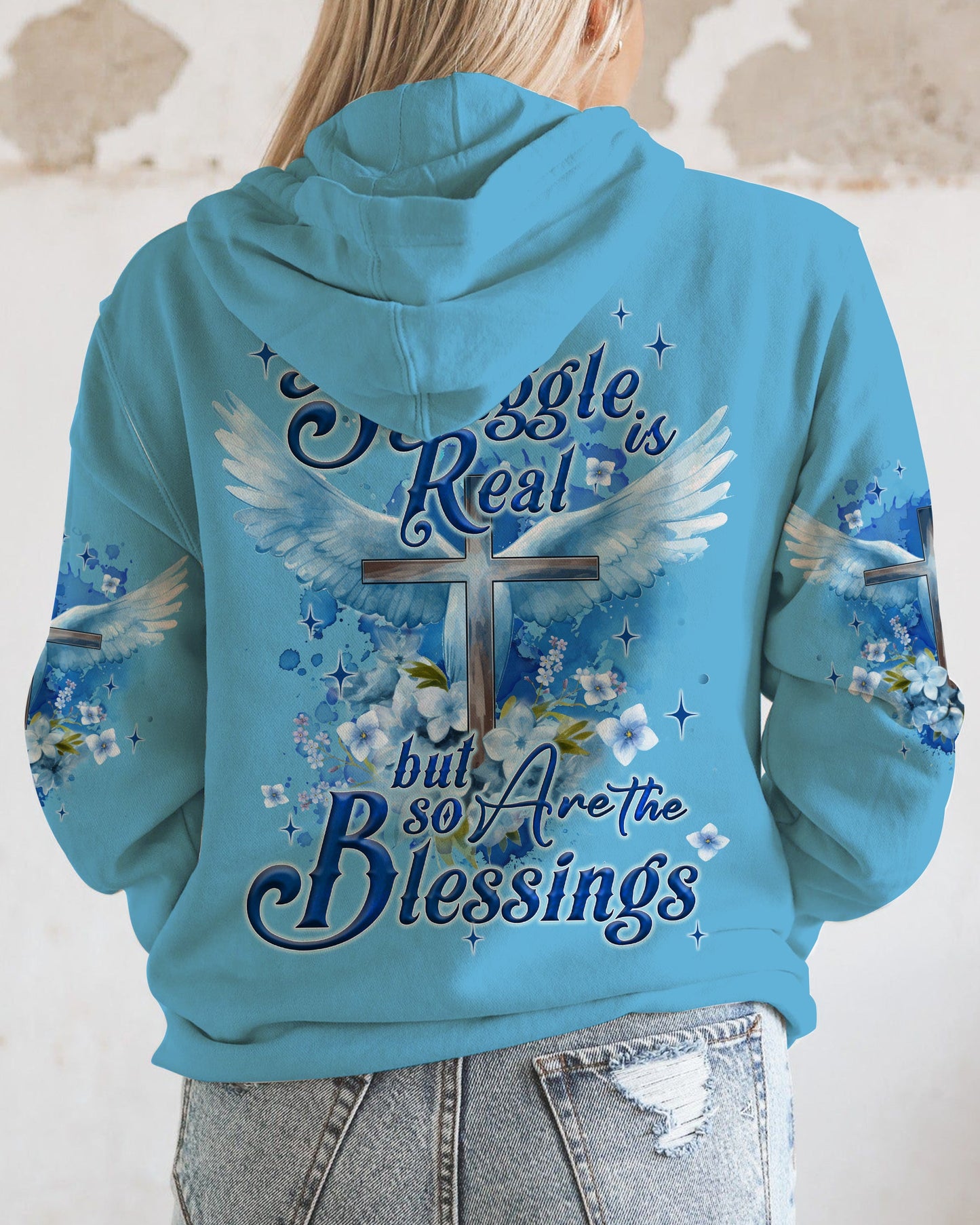 This Struggle is Real Women's All Over Print Shirt displays an inspiring message of faith and strength with its tranquil image of a cross adorned with flowers and angelic wings. Let this powerful design be a reminder of blessings, even through life's struggles, and be inspired on your spiritual journey.