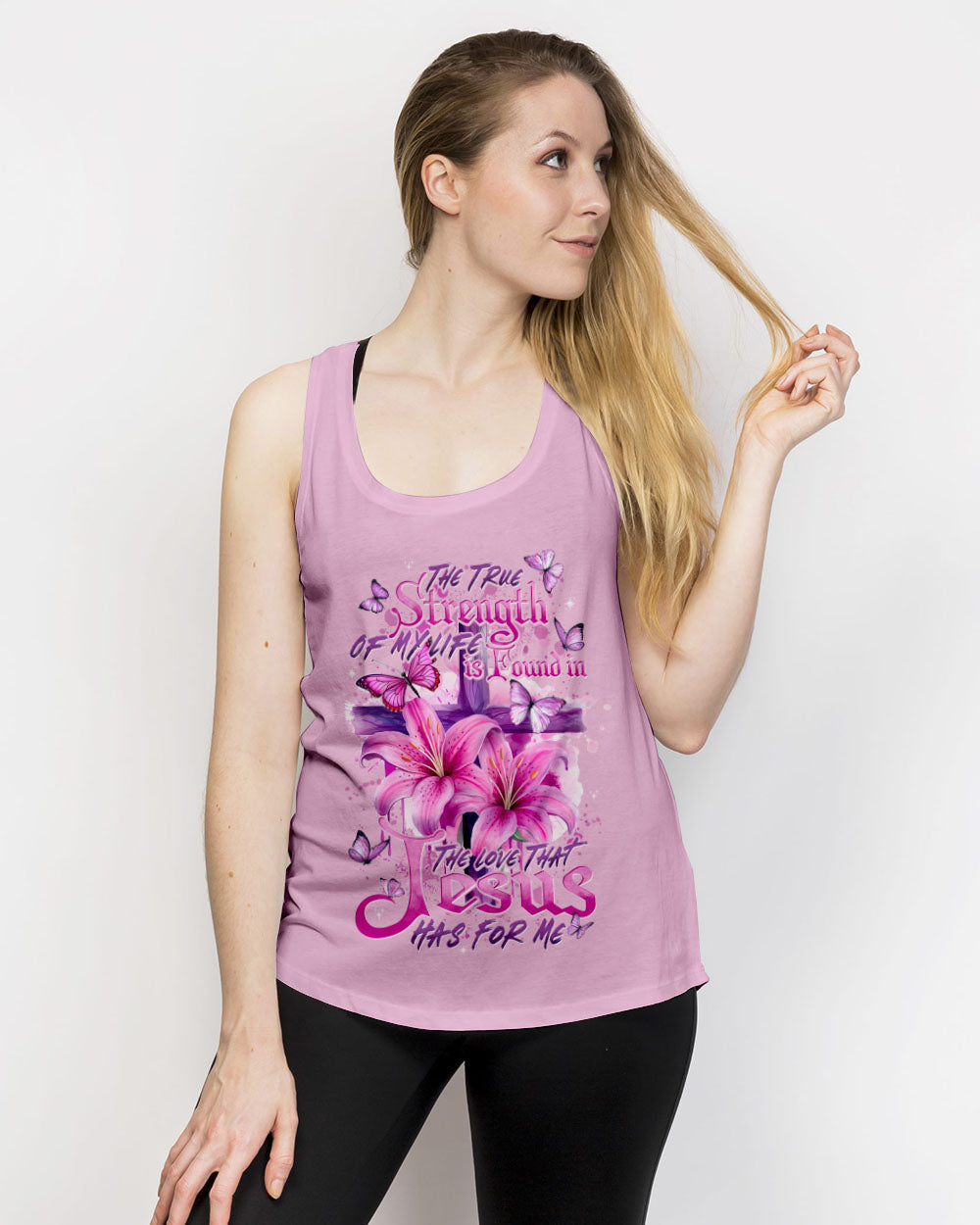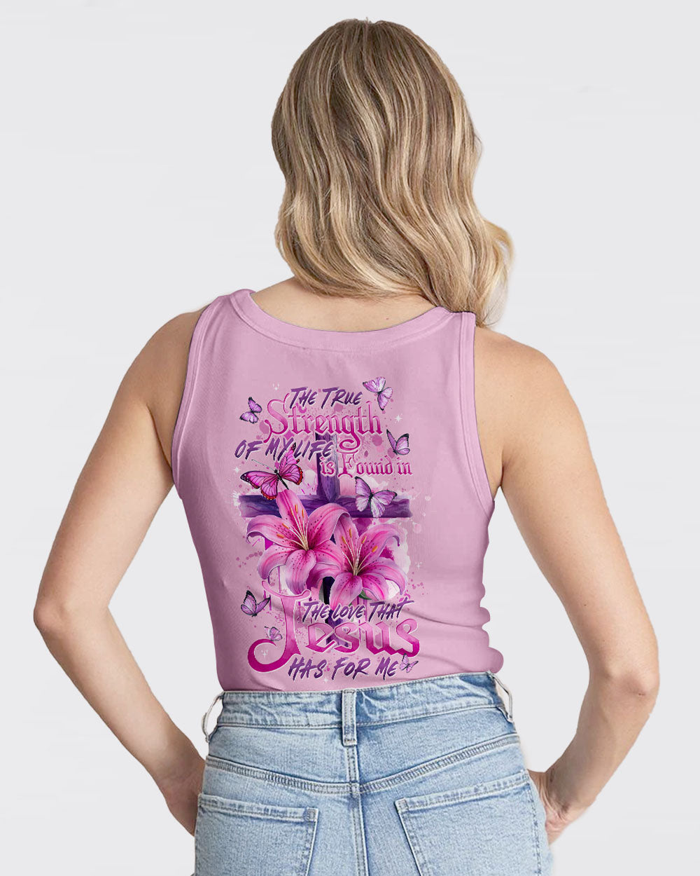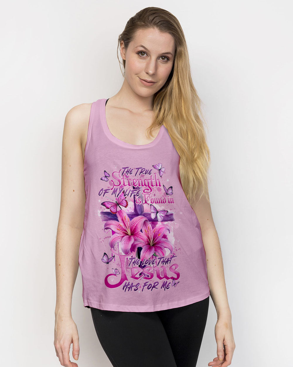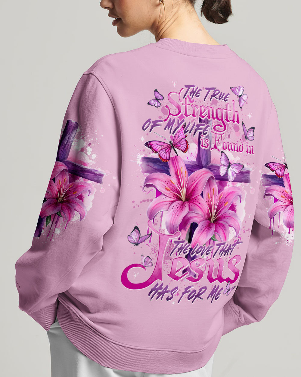 Immerse yourself in the profound beauty of Christian faith with our Women's All Over Print Shirt. Featuring majestic crosses, blooming lilies, vibrant flowers, and graceful butterflies, this design is an empowering celebration of the unwavering love and support found in Jesus. With the heartfelt quote 'The true strength of my life is found in the love that Jesus has for me,' this shirt is a visually captivating and spiritually uplifting reminder of the boundless love of Jesus.
