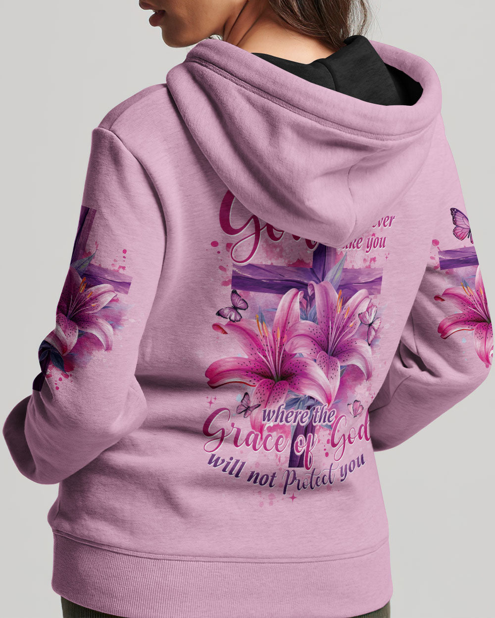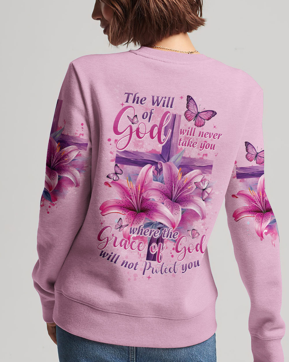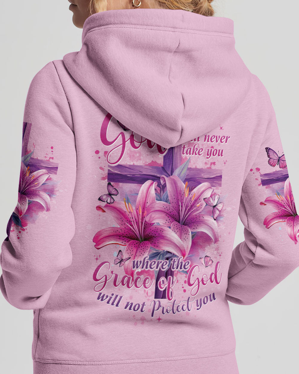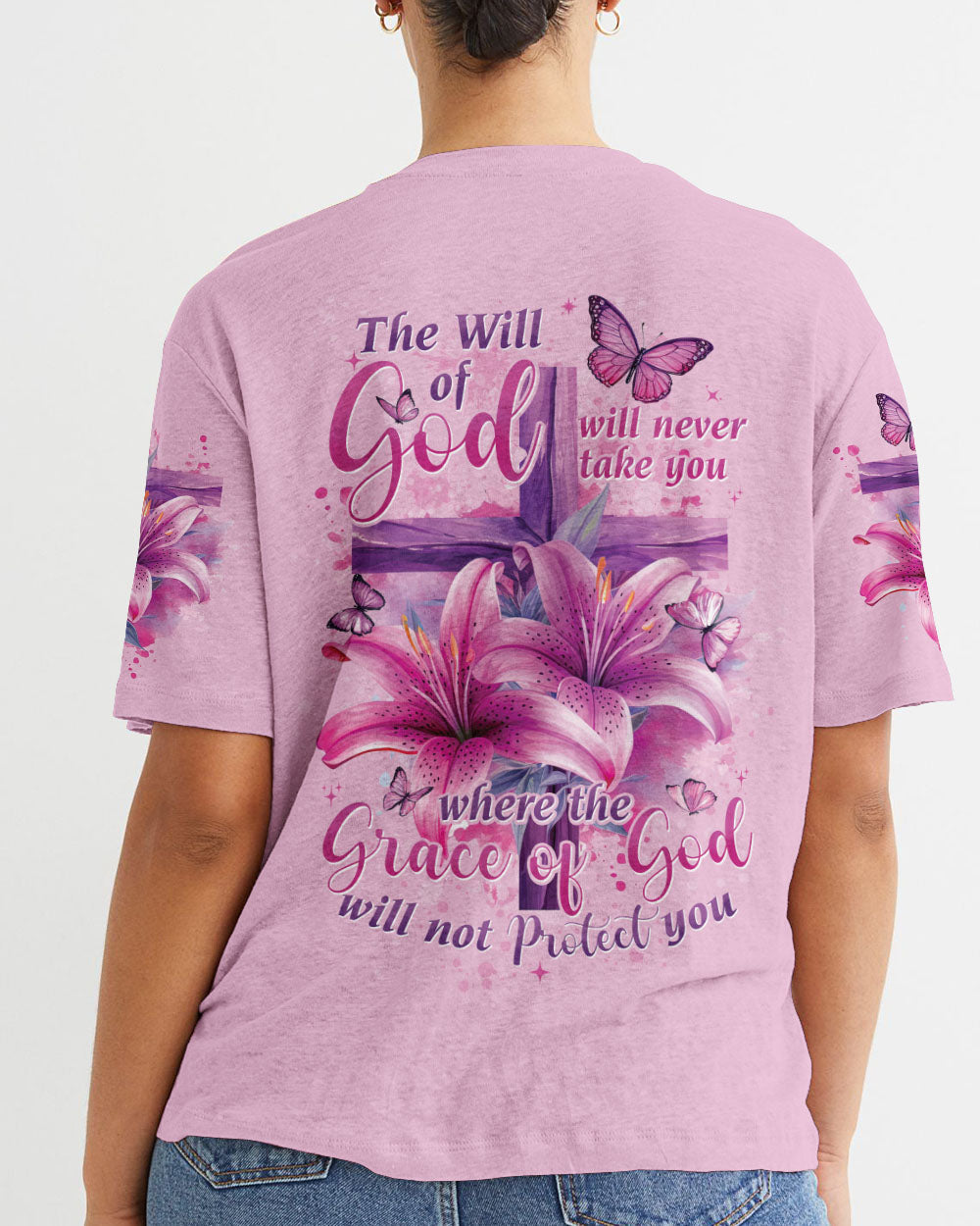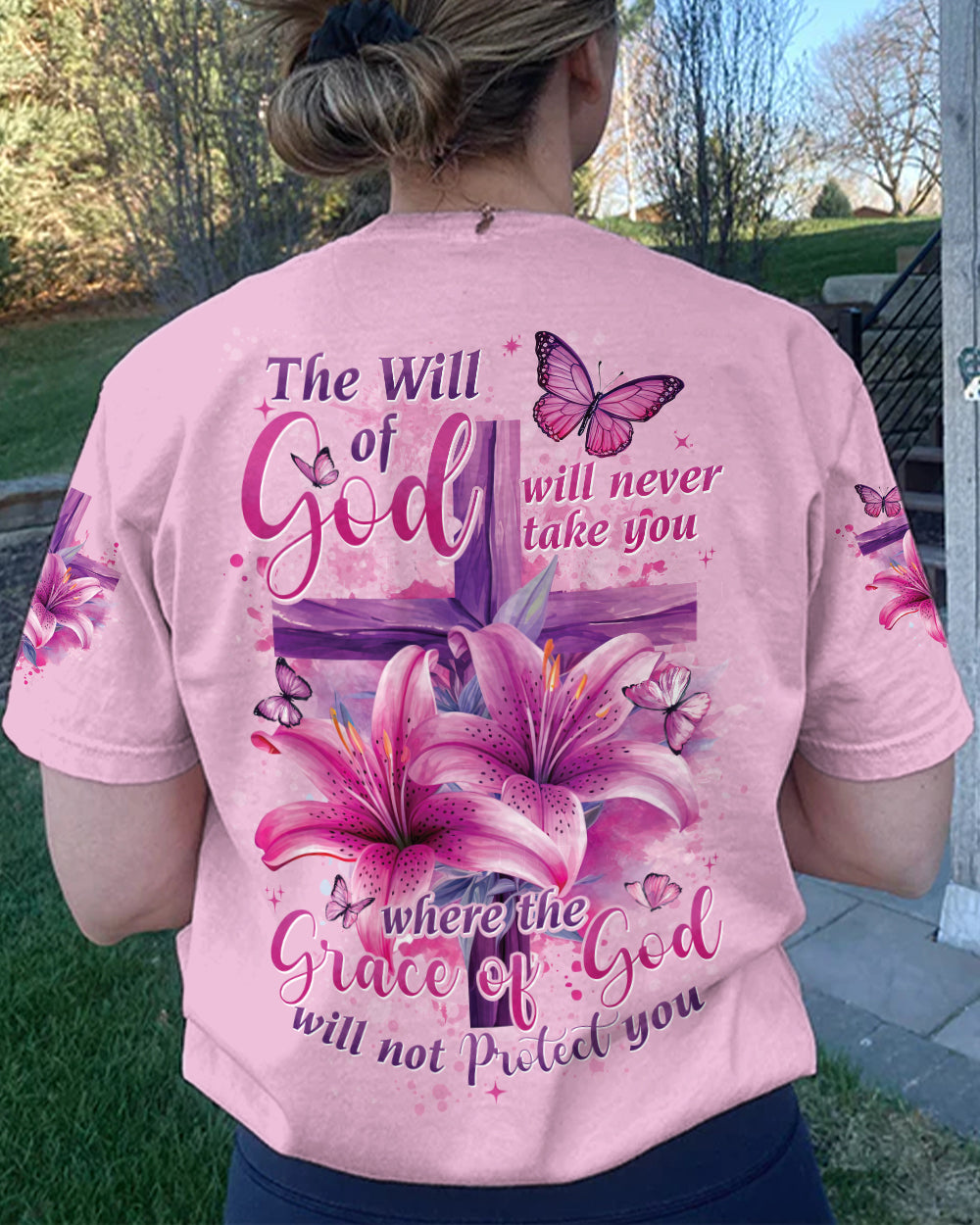 This intricately designed, all over print shirt embraces the core beliefs of Christian faith with its combination of crosses, lilies, and butterflies, representing strength, purity, and transformation. The reassuring quote "the will of God will never take you where the grace of God will not protect you" serves as a constant reminder of divine protection on your journey.