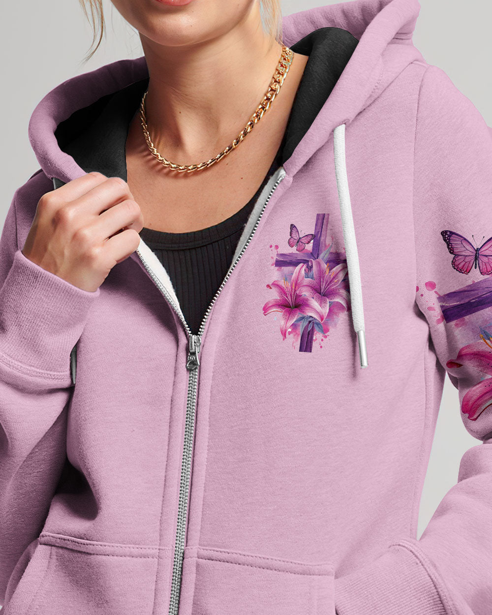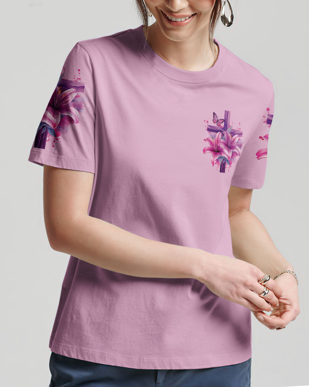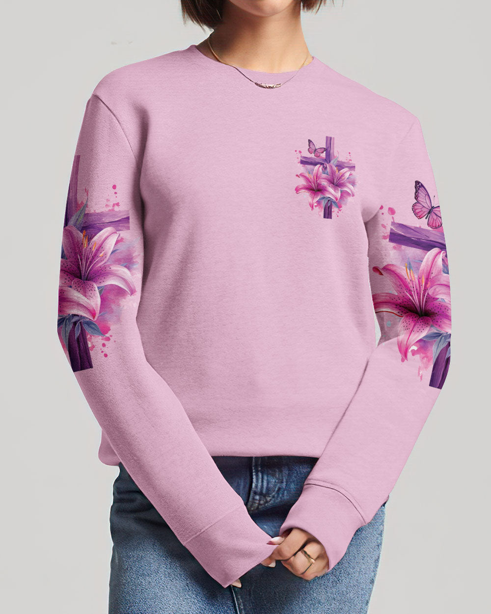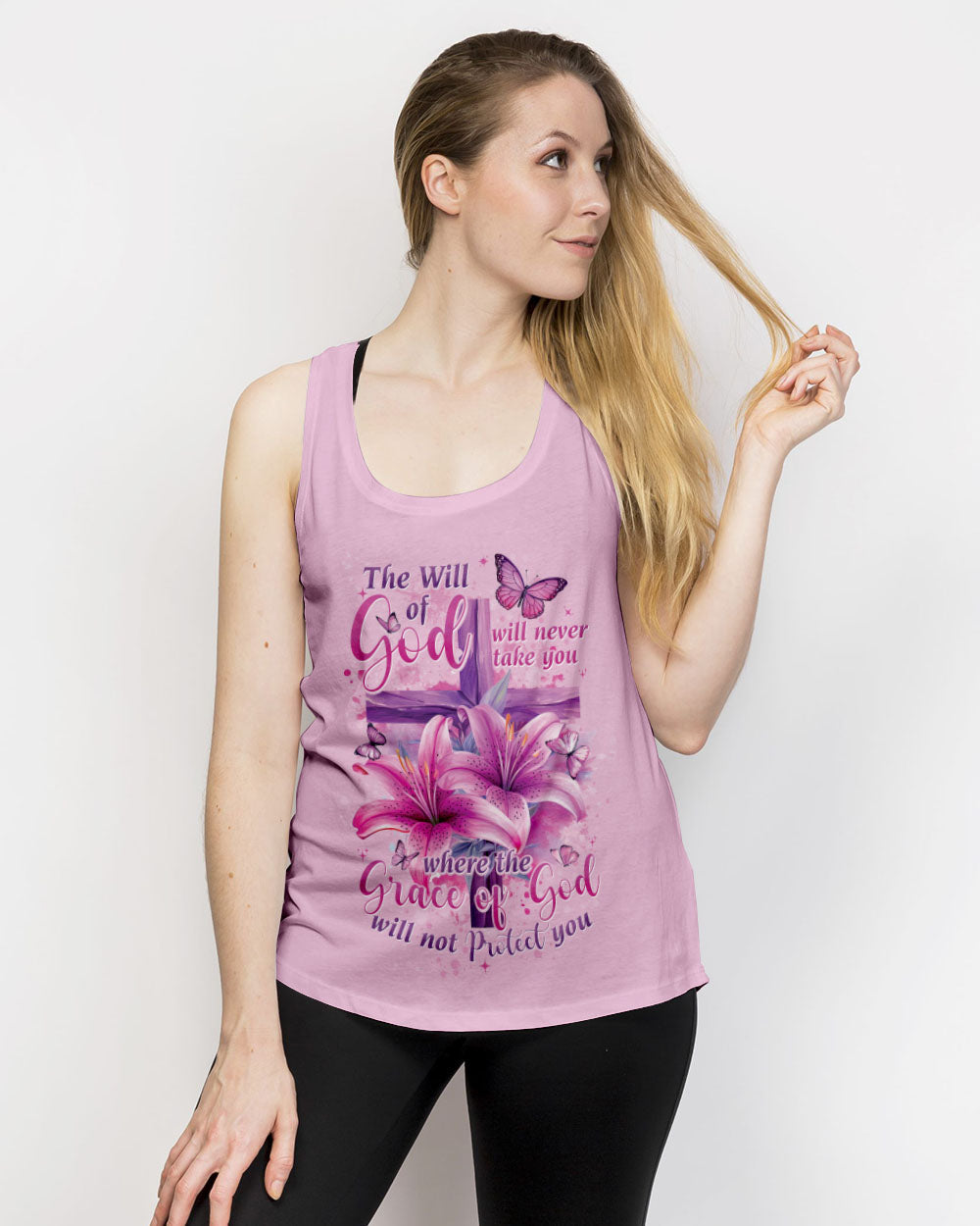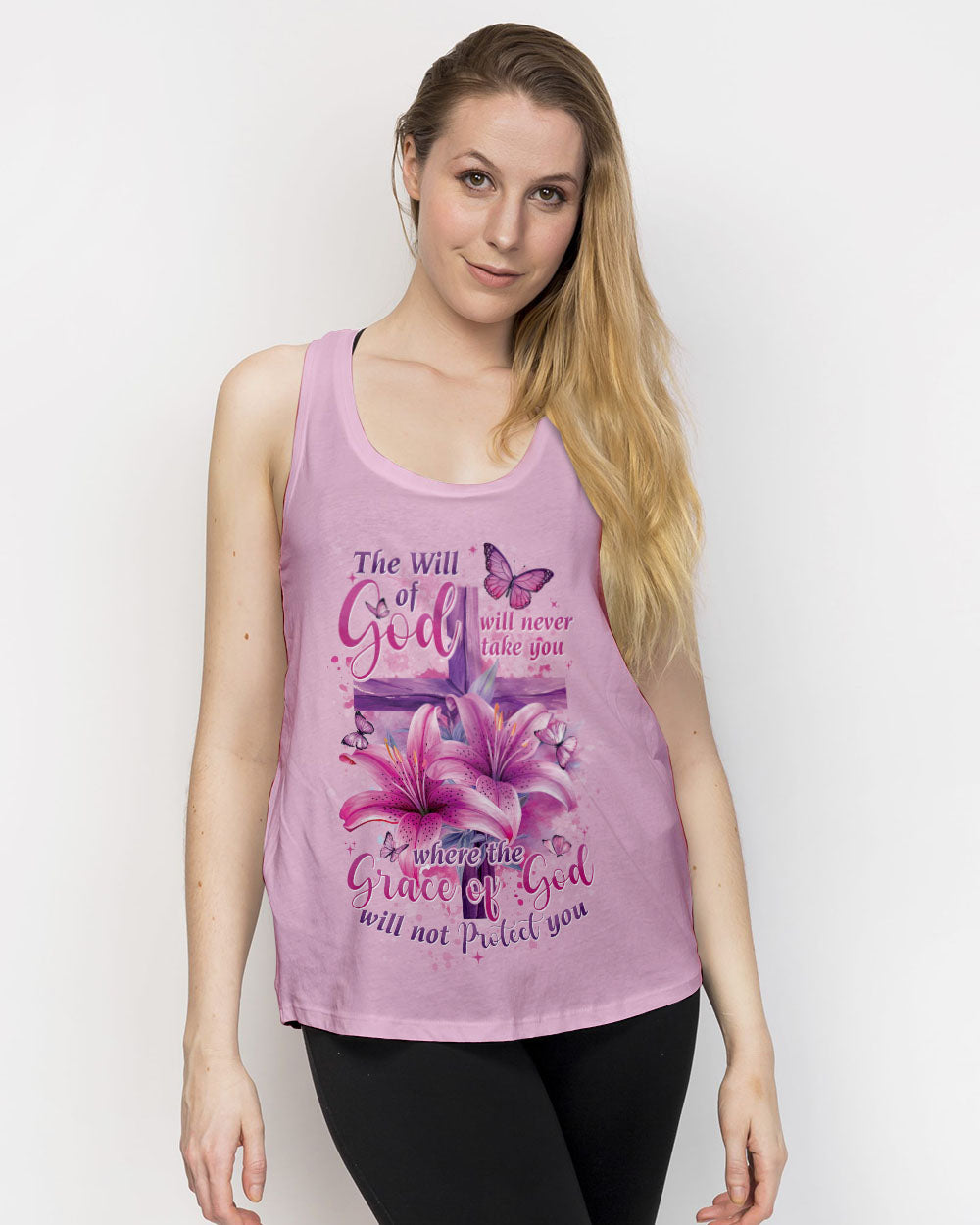 This intricately designed, all over print shirt embraces the core beliefs of Christian faith with its combination of crosses, lilies, and butterflies, representing strength, purity, and transformation. The reassuring quote "the will of God will never take you where the grace of God will not protect you" serves as a constant reminder of divine protection on your journey.