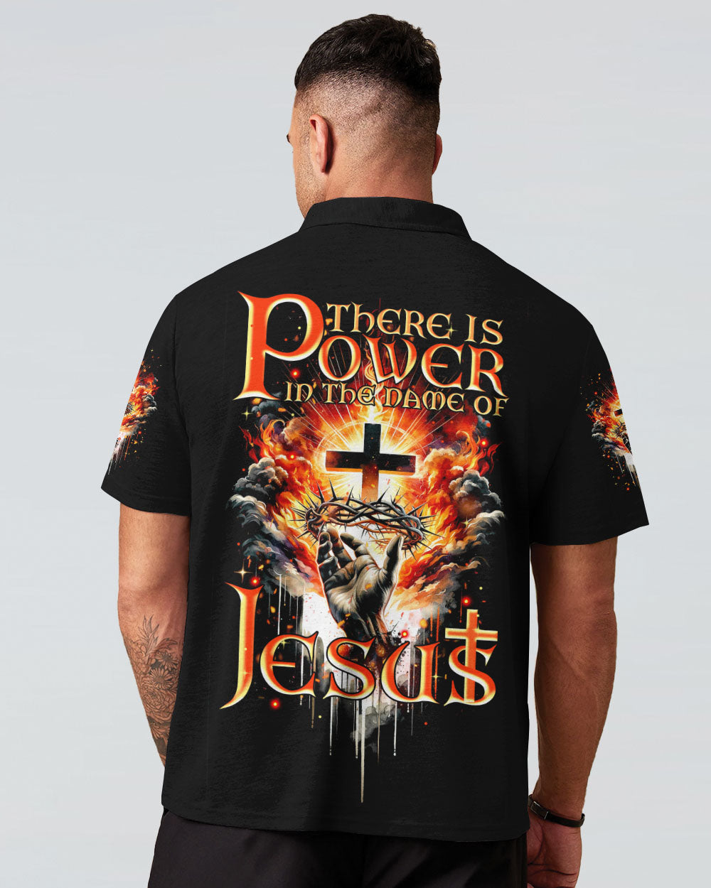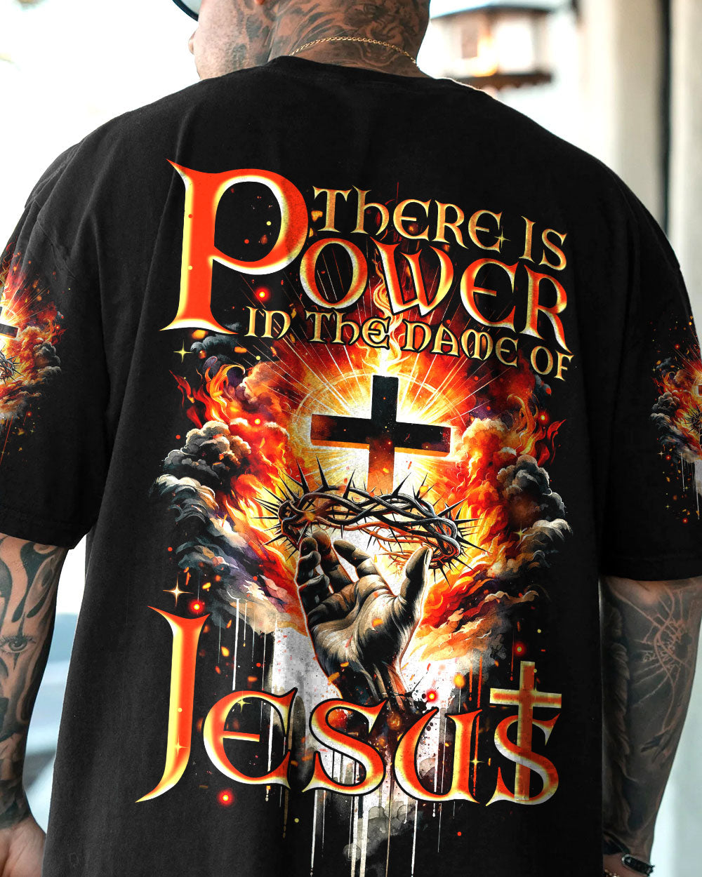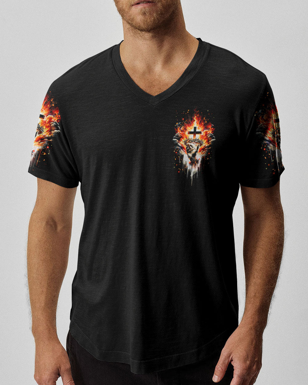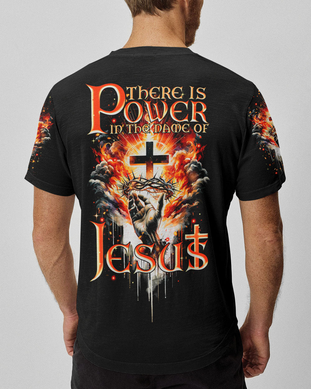 Elevate your spirit with our striking Christian-inspired all over print shirt. The design features a luminous cross, representing salvation, Jesus' crown of thorns, symbolizing sacrifice and redemption, and fiery elements, showcasing the power found in the name of Jesus. Let this design remind you of the transformative and enduring strength of Christian faith.