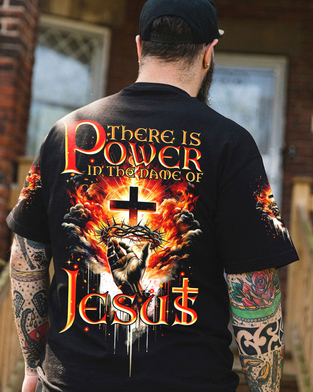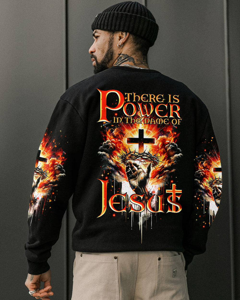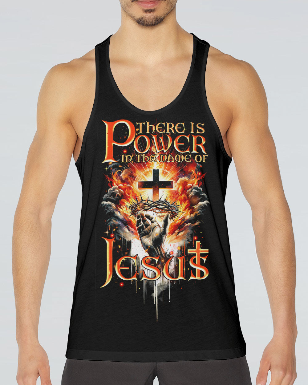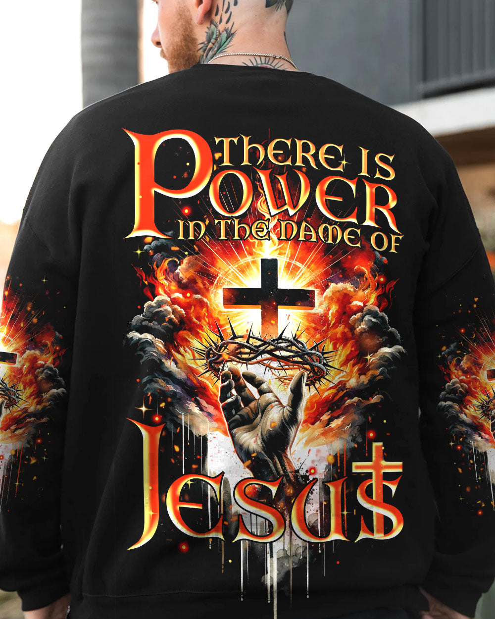 Elevate your spirit with our striking Christian-inspired all over print shirt. The design features a luminous cross, representing salvation, Jesus' crown of thorns, symbolizing sacrifice and redemption, and fiery elements, showcasing the power found in the name of Jesus. Let this design remind you of the transformative and enduring strength of Christian faith.
