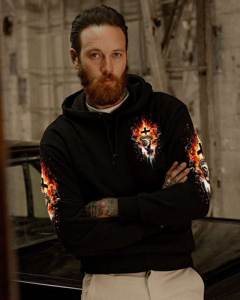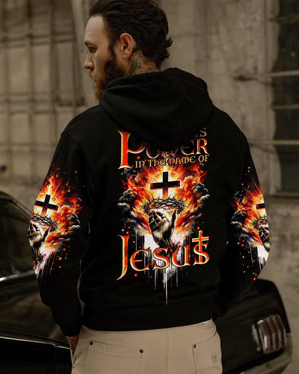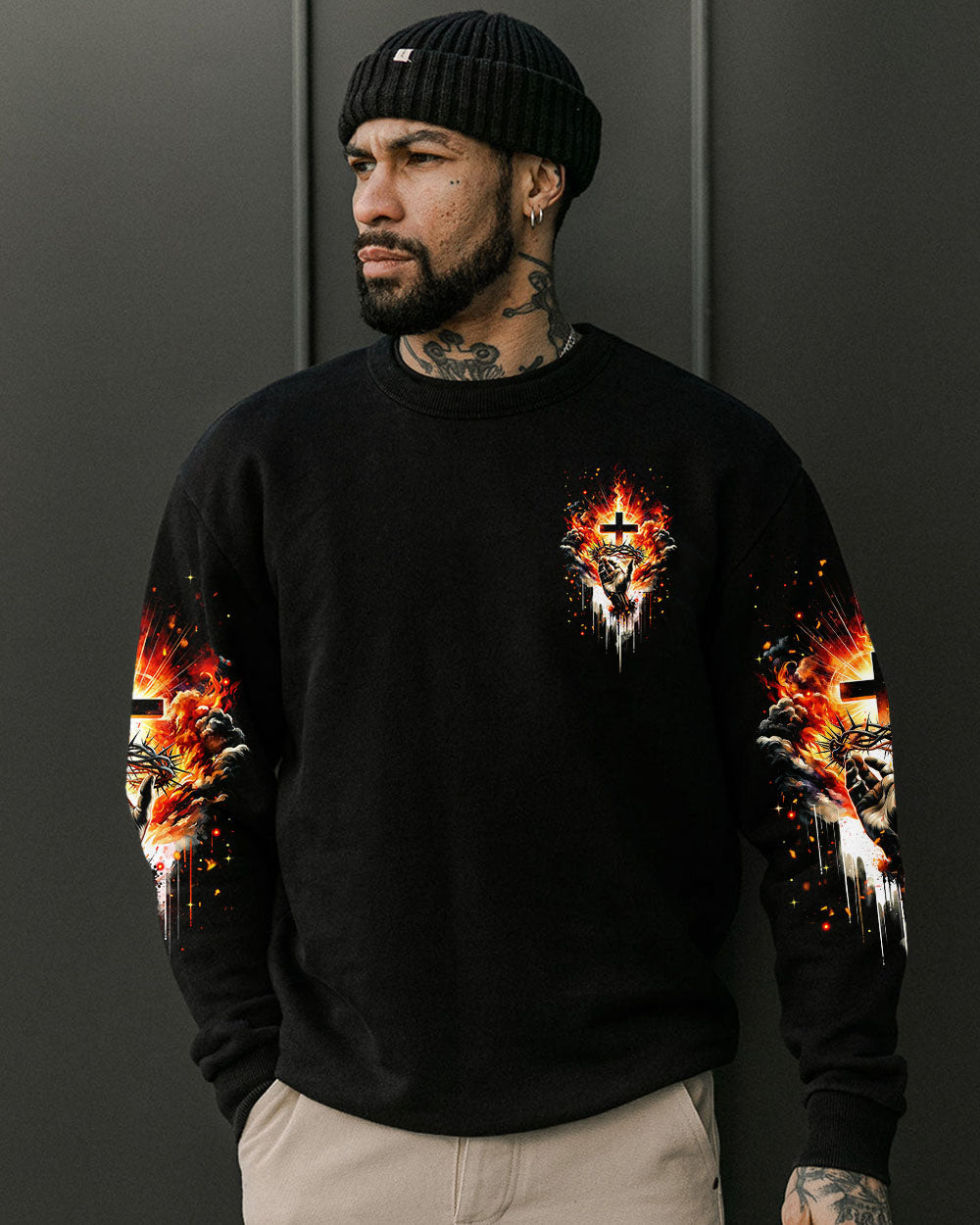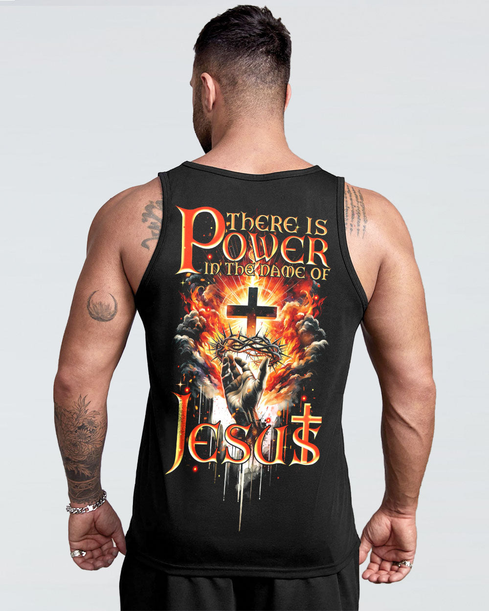Elevate your spirit with our striking Christian-inspired all over print shirt. The design features a luminous cross, representing salvation, Jesus' crown of thorns, symbolizing sacrifice and redemption, and fiery elements, showcasing the power found in the name of Jesus. Let this design remind you of the transformative and enduring strength of Christian faith.
